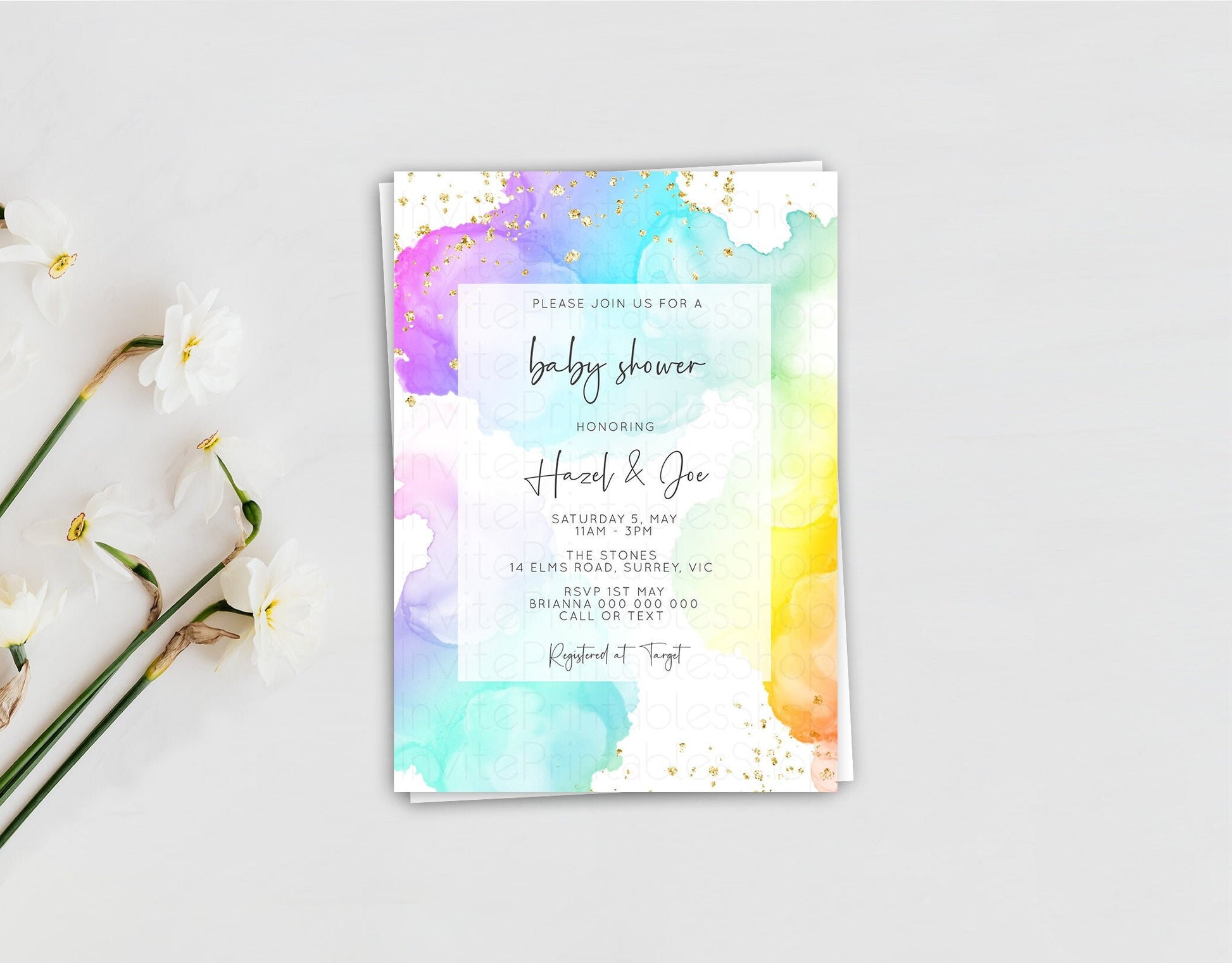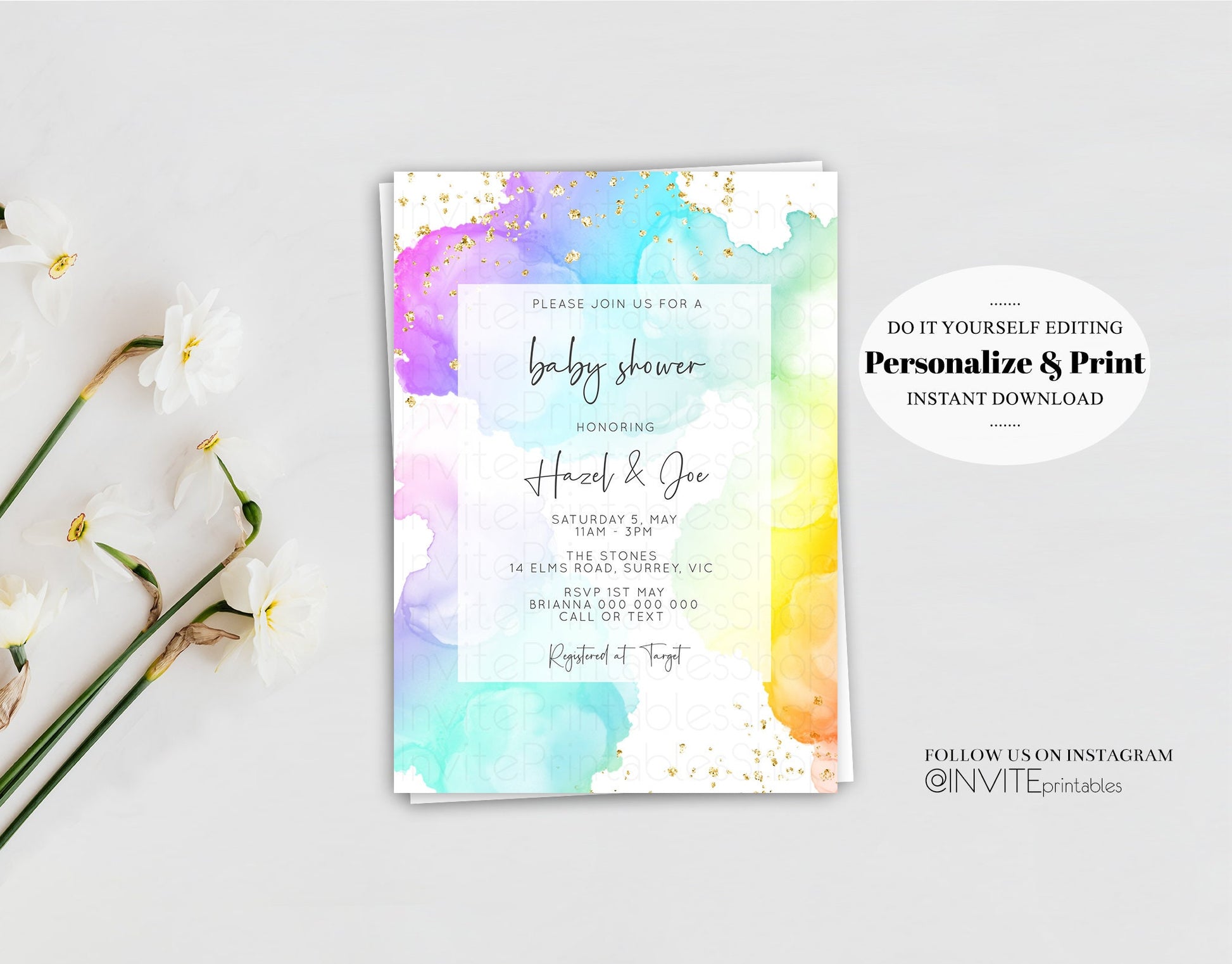 Rainbow Baby Shower Invitation Gold Glitter Splash Ink Pastel Watercolor Colorful Blue Pink Purple Gender Neutral Editable Invite Template