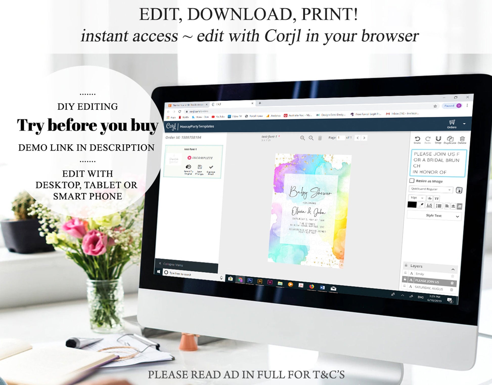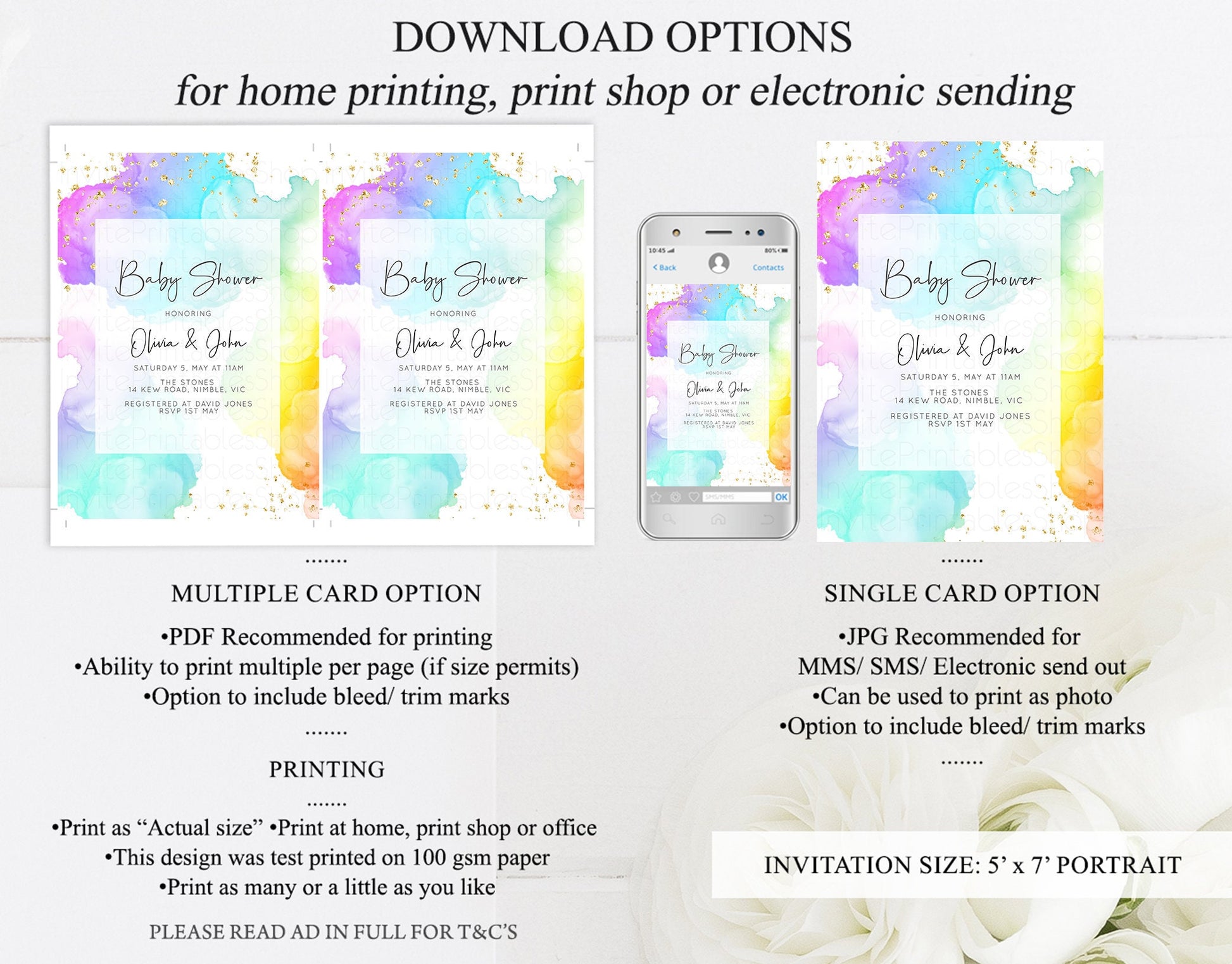 •Try before you buy! • DEMO LINK- https://www.corjl.com/d/2IA82A PLEASE READ AD IN FULL!! •Digital file. No physical item will be shipped •Do it yourself Editing. Edit online with Corjl or Edit with your mobile ITEM DETAILS Invitation size: 5’x7’ File type: PDF, JPEG Resolution: 300DPI PDF FILE OPTIONS: •Recommended for printing •Ability to print multiple per page (if size permits) •Option to include bleed/ trim marks JPG FILE OPTIONS: •Recommended for MMS/ SMS/ Electronic send out •Can be used to print as photo •Option to include bleed/ trim marks EDITING • Do it yourself editing • Mobile editing is available • Google chrome is the recommend browser for Corjl. Please download here for FREE: https://www.google.com/chrome/ • Using other browsers may not show all of Corjl's editing features • Editing on a desktop/ laptop computer is recommended to access all of Corjl features • Mobile editing is available, please use a desktop/ laptop computer to access all of Corjl features DOWNLOADS & EXPIRY •Maximum 3 downloads on the same edit •Link expires 30 days after purchase DOWNLOAD NOTICE •Once you have reached your download limits &/ “approve proof” in Corjl. You will not be able to request further downloads on your design. Further download requests are not permitted WHAT IS EDITABLE •Text - colours, fonts, size, move, delete & rotation. •Please see demo link for what you can and can’t do WHAT YOU CAN’T EDIT •Template size •Template orientation •Graphics CAN NOT BE deleted, moved, or changed in colour •Please see demo link for what you can and can’t do HOW TO 1. Choose design template & checkout on Etsy. 2. Email will be sent from Corjl. Follow link to access template 3. Edit, save & print INSTRUCTIONS •Instructions on how to edit your design have been written by Corjl and will be available with your purchase. PRINTING •Colours can vary depending on the monitor, printer & cardstock •Can be printed at home •Home printing will require you to select the high quality print settings, select appropriate paper thickness & click "Actual size" prior to you printing •This design was test printed on 100 gsm paper •Can be printed at local print shop. Please check printing requirements & any printing restrictions prior to purchase PERSONAL USE ONLY. This item cannot be shared, re-sold, or used commercially for profit. REFUND POLICY •We are unable to provide a refund/ exchange on commenced & completed work, instant downloads or self-editing link templates. Please use the demo link to work out if this product is right for you. Copyright © 2018 by InvitePrintablesShop PTY LTD All rights reserved. This file or any portion thereof may not be reproduced or resold without the express written permission of the publisher (including edits to the design). Our files are provided as high-resolution PDFs – the end result is dependent upon the printer and paper used. If using a professional printing company, InvitePrintablesShop are not responsible for their specific printing requirements, paper or colour quality. Any changes required to the template are not included with your purchase – the files come as described in the listing only and cannot be changed. Thank you for visiting Invite Printables Shop:)