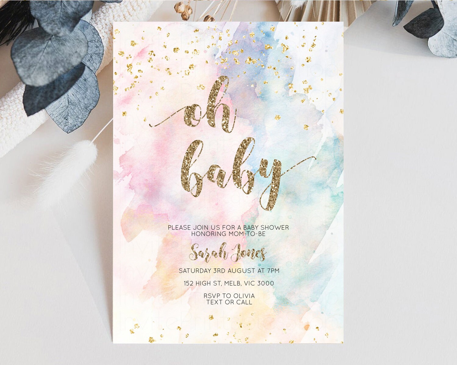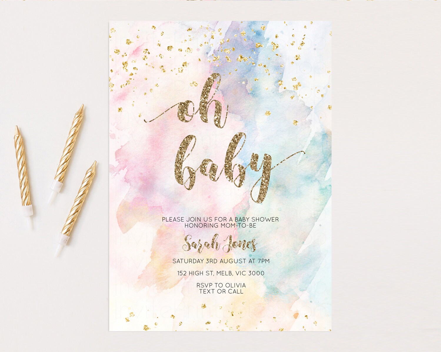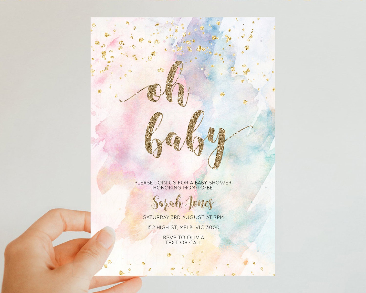 Rainbow Baby Shower Invitation Pastel Baby Shower Invitation Watercolor Ombre Invitation Rainbow Pastel Colors Invite Glitter Confetti 276