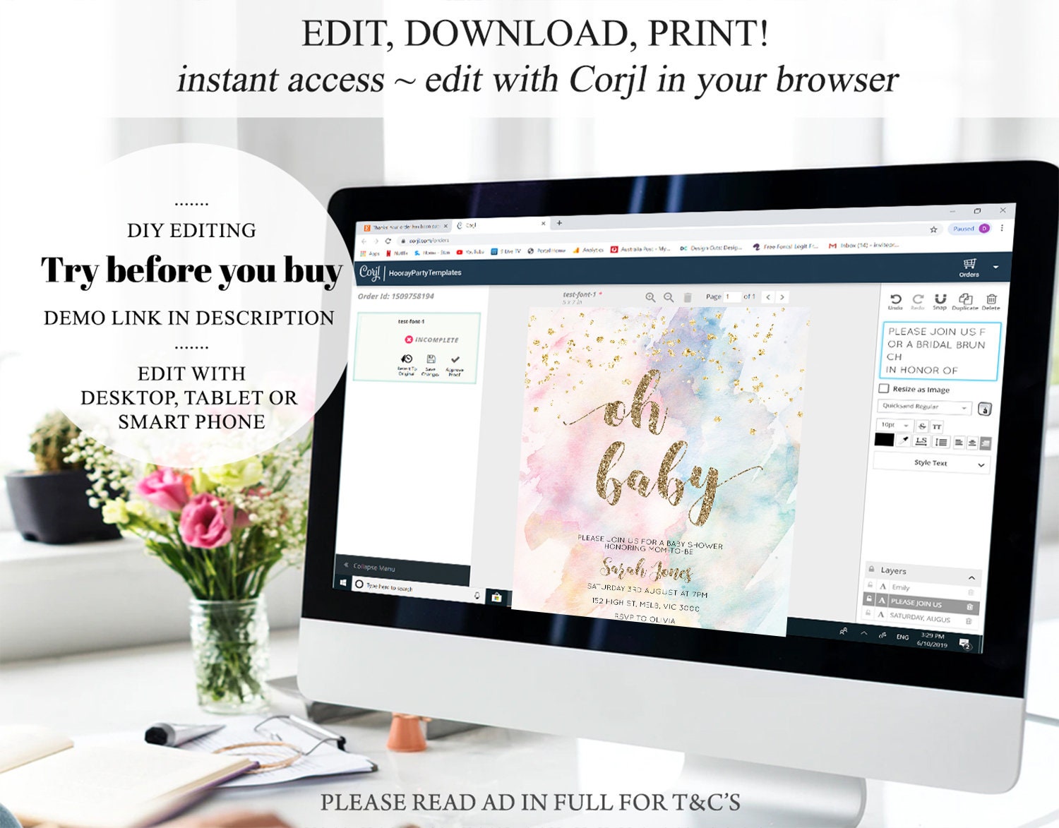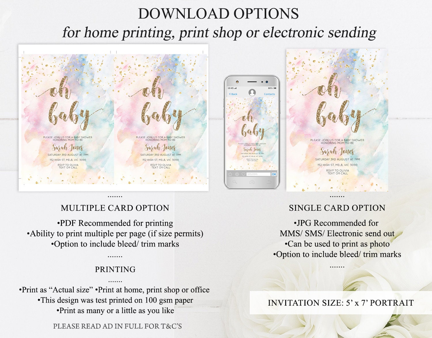 •Try before you buy! • DEMO LINK- https://www.corjl.com/d/121C97 PLEASE READ AD IN FULL!! •Digital file. No physical item will be shipped •Do it yourself Editing. Edit online with Corjl or Edit with your mobile ITEM DETAILS Invitation size: 5’x7’ File type: PDF, JPEG Resolution: 300DPI PDF FILE OPTIONS: •Recommended for printing •Ability to print multiple per page (if size permits) •Option to include bleed/ trim marks JPG FILE OPTIONS: •Recommended for MMS/ SMS/ Electronic send out •Can be used to print as photo •Option to include bleed/ trim marks EDITING • Do it yourself editing • Mobile editing is available • Google chrome is the recommend browser for Corjl. Please download here for FREE: https://www.google.com/chrome/ • Using other browsers may not show all of Corjl's editing features • Editing on a desktop/ laptop computer is recommended to access all of Corjl features • Mobile editing is available, please use a desktop/ laptop computer to access all of Corjl features DOWNLOADS & EXPIRY •Maximum 3 downloads on the same edit •Link expires 30 days after purchase DOWNLOAD NOTICE •Once you have reached your download limits &/ “approve proof” in Corjl. You will not be able to request further downloads on your design. Further download requests are not permitted WHAT IS EDITABLE •Text - colours, fonts, size, move, delete & rotation. •Please see demo link for what you can and can’t do WHAT YOU CAN’T EDIT •Template size •Template orientation •Graphics CAN NOT BE deleted, moved, or changed in colour •Please see demo link for what you can and can’t do HOW TO 1. Choose design template & checkout on Etsy. 2. Email will be sent from Corjl. Follow link to access template 3. Edit, save & print INSTRUCTIONS •Instructions on how to edit your design have been written by Corjl and will be available with your purchase. PRINTING •Colours can vary depending on the monitor, printer & cardstock •Can be printed at home •Home printing will require you to select the high quality print settings, select appropriate paper thickness & click "Actual size" prior to you printing •This design was test printed on 100 gsm paper •Can be printed at local print shop. Please check printing requirements & any printing restrictions prior to purchase PERSONAL USE ONLY. This item cannot be shared, re-sold, or used commercially for profit. REFUND POLICY •We are unable to provide a refund/ exchange on commenced & completed work, instant downloads or self-editing link templates. Please use the demo link to work out if this product is right for you. Copyright © 2018 by InvitePrintablesShop PTY LTD All rights reserved. This file or any portion thereof may not be reproduced or resold without the express written permission of the publisher (including edits to the design). Our files are provided as high-resolution PDFs – the end result is dependent upon the printer and paper used. If using a professional printing company, InvitePrintablesShop are not responsible for their specific printing requirements, paper or colour quality. Any changes required to the template are not included with your purchase – the files come as described in the listing only and cannot be changed. Thank you for visiting Invite Printables Shop:)