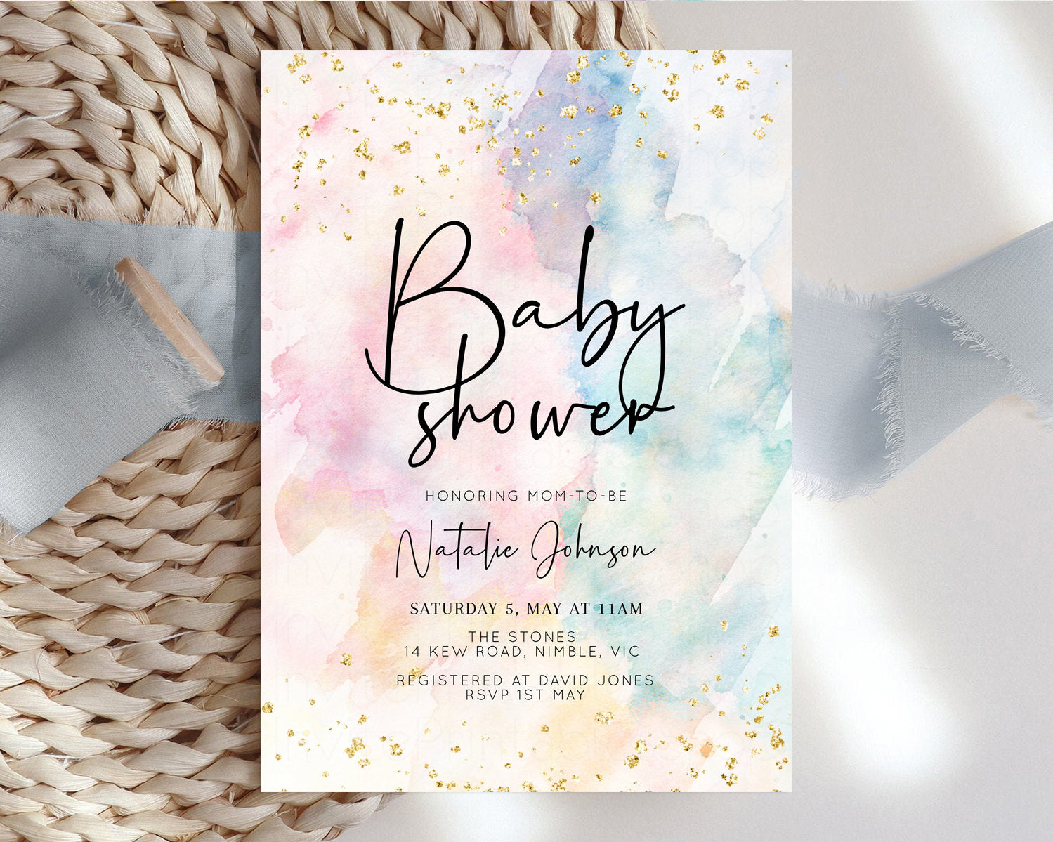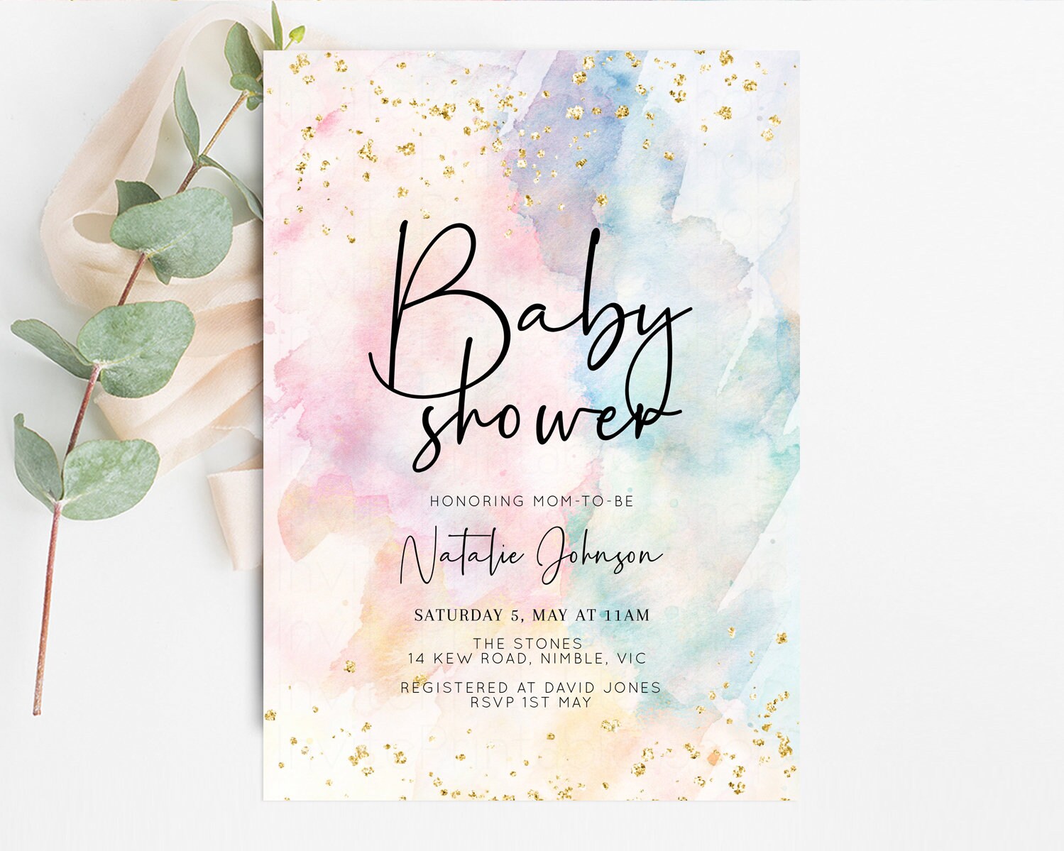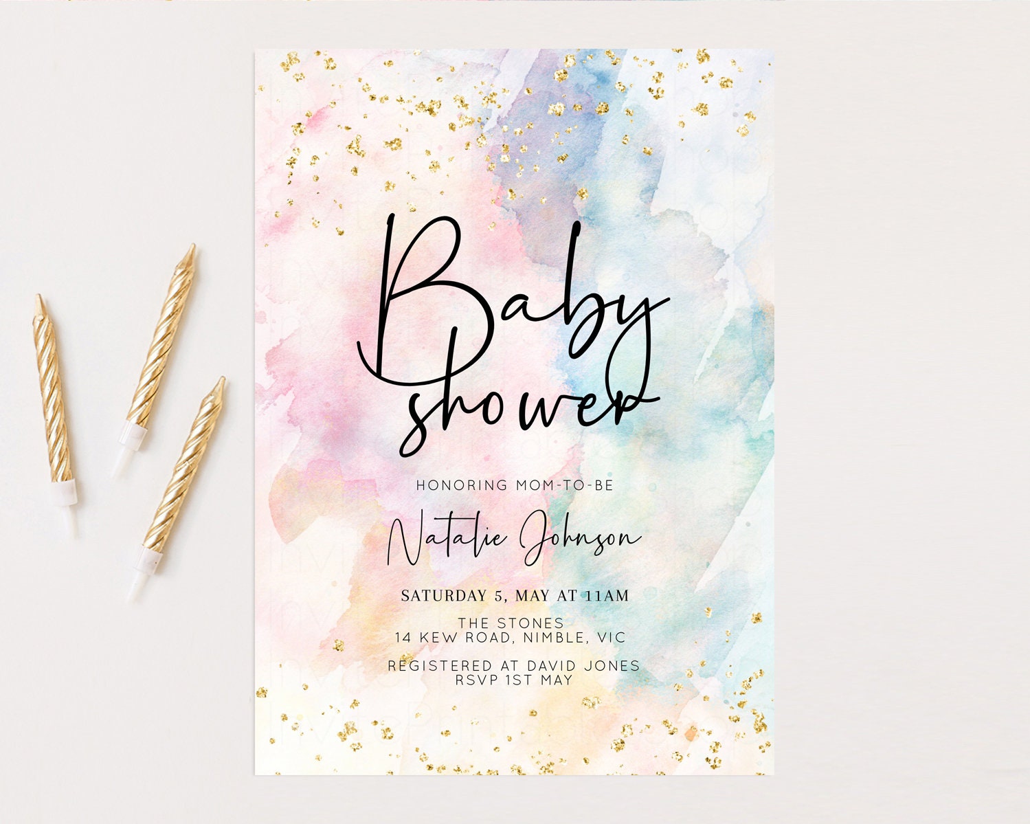 Rainbow Baby Shower Invitation Pastel Baby Shower Invitation Watercolor Ombre Invitation Rainbow Pastel Colors Invite Glitter Confetti 276