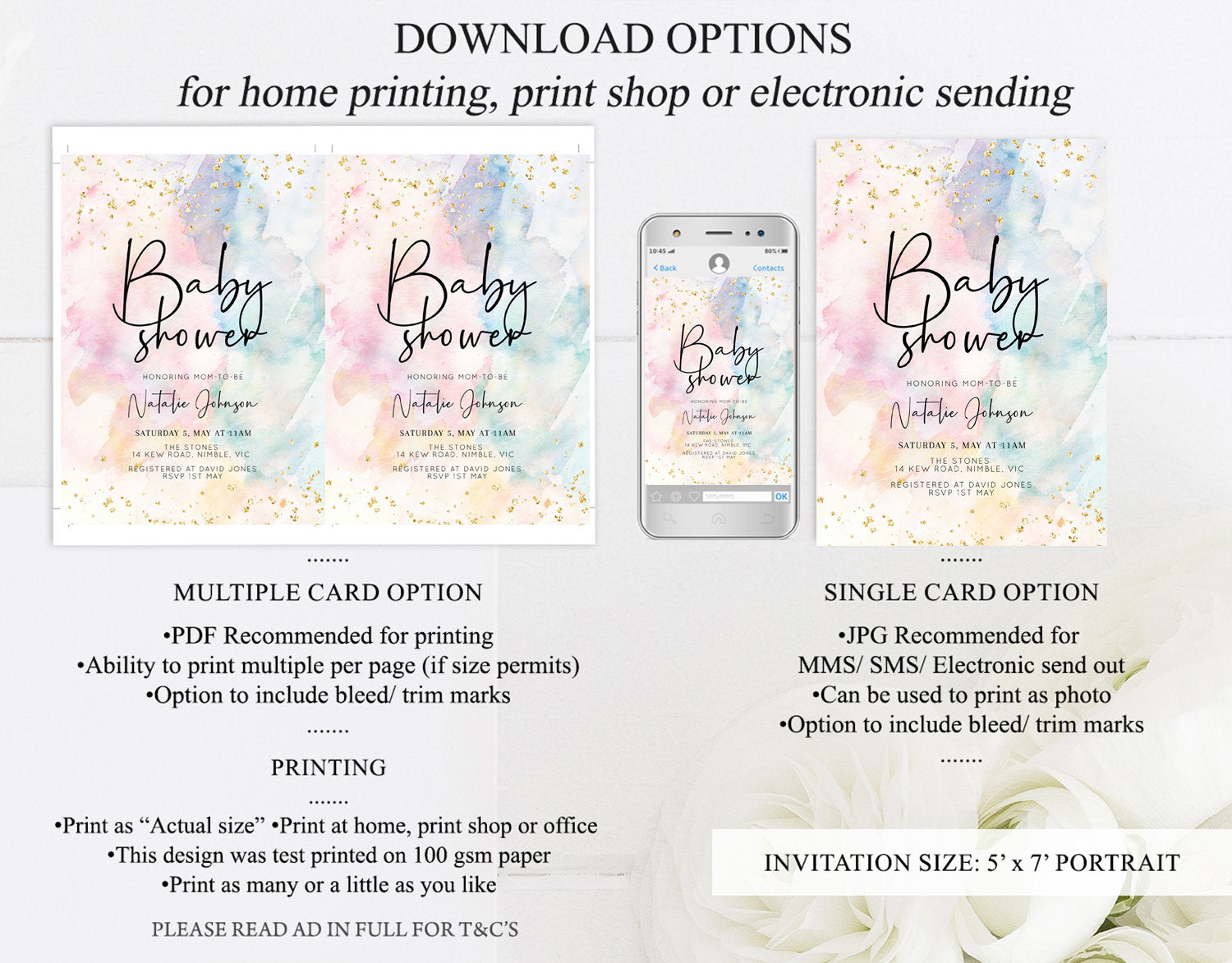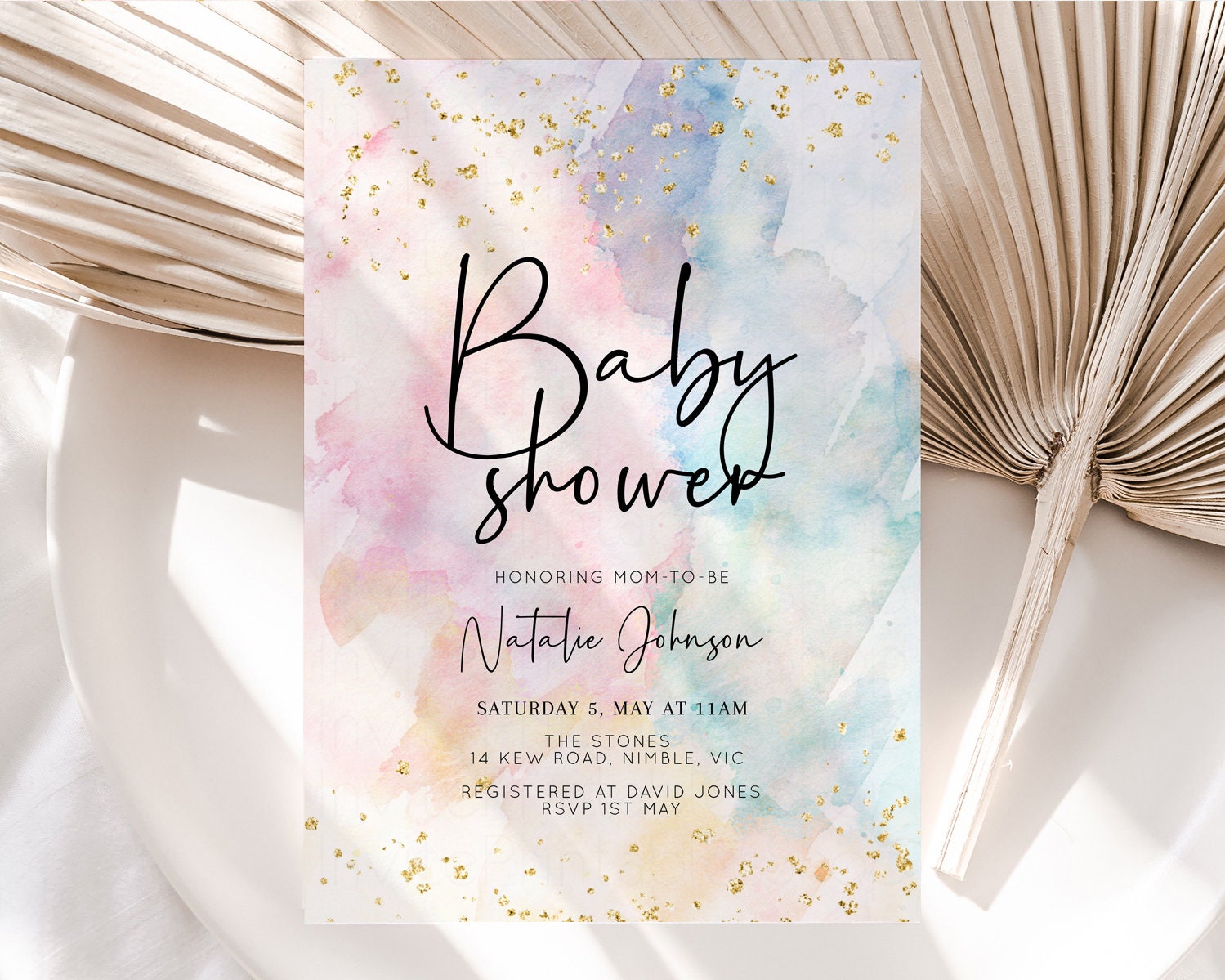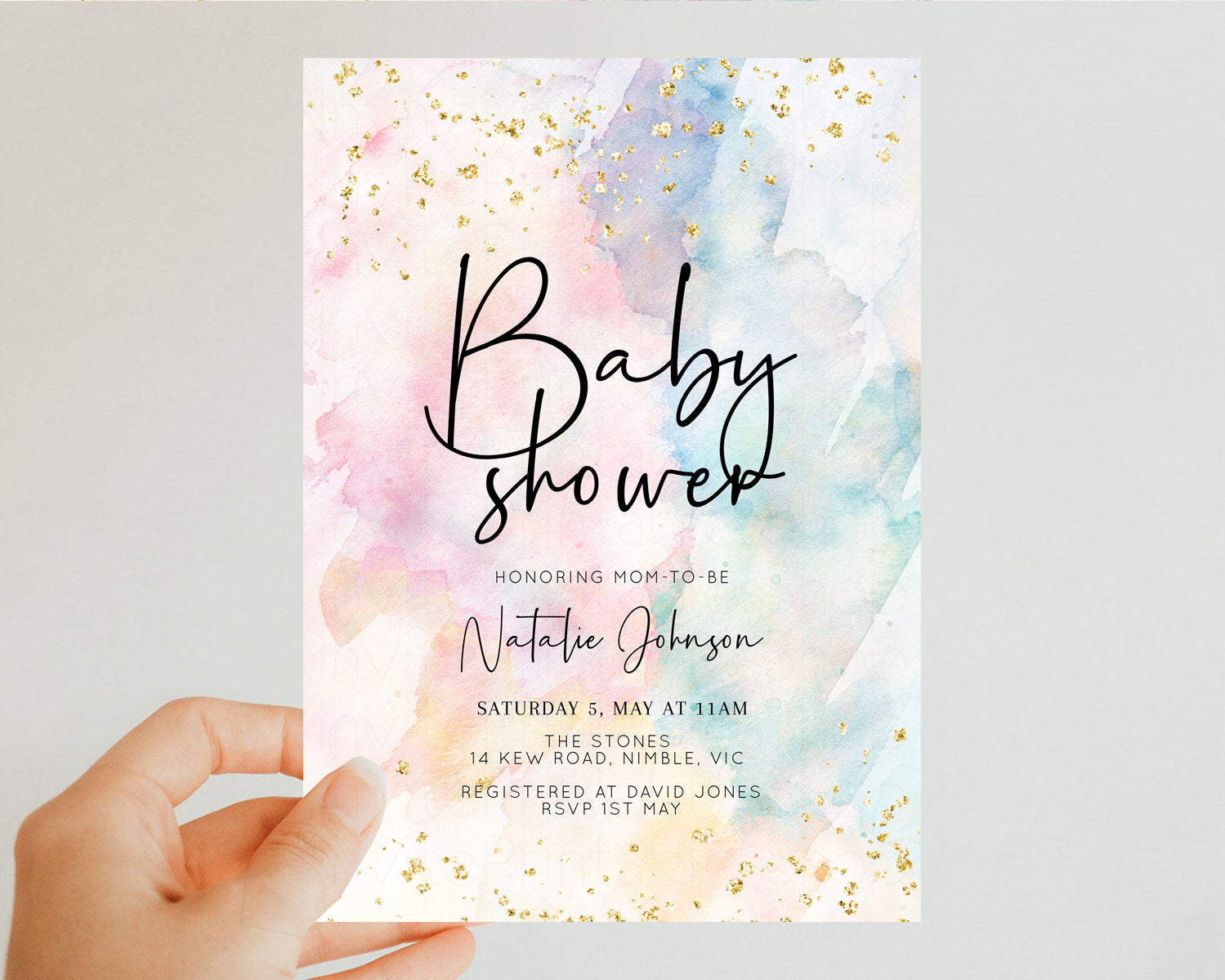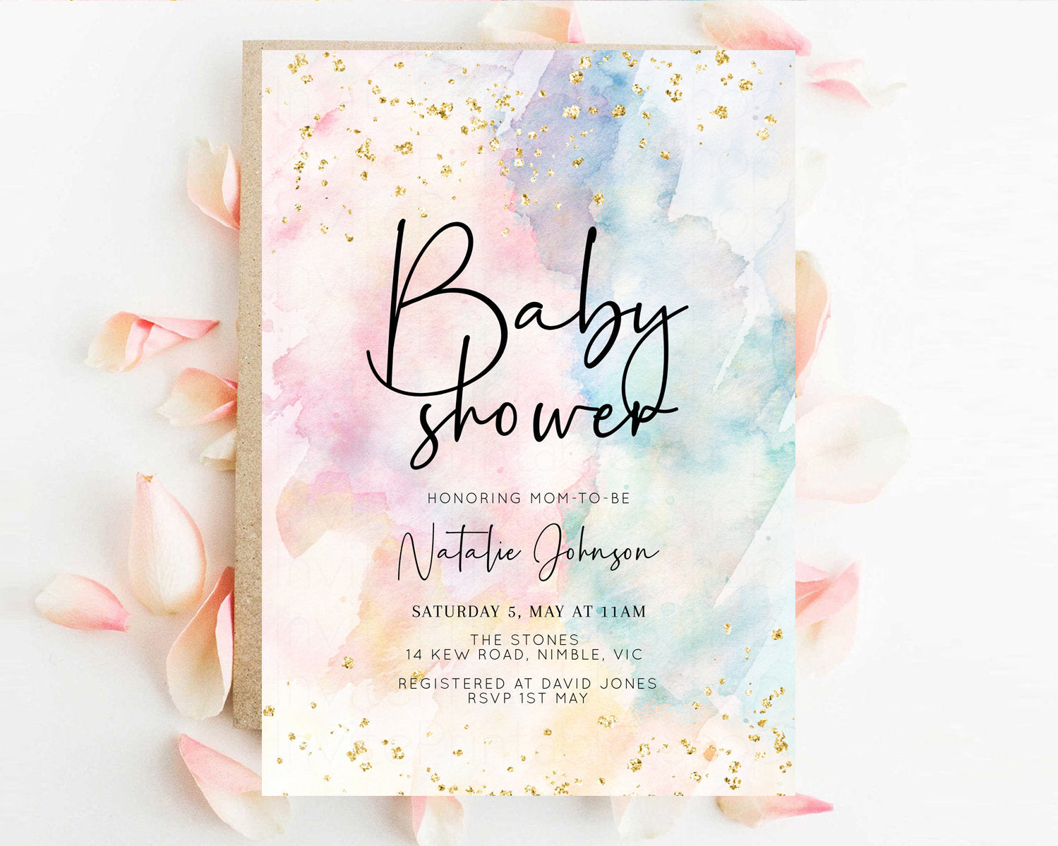 Rainbow Baby Shower Invitation Pastel Baby Shower Invitation Watercolor Ombre Invitation Rainbow Pastel Colors Invite Glitter Confetti 276