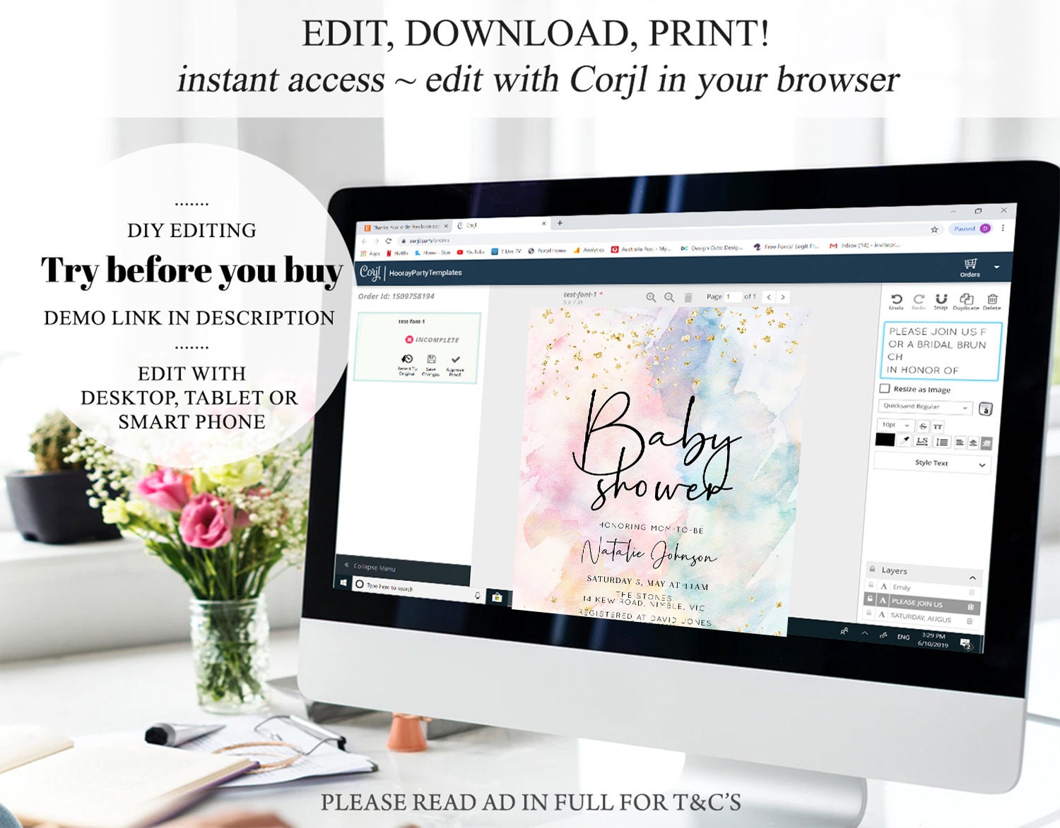 •Try before you buy! • DEMO LINK- https://www.corjl.com/d/2I23H0 PLEASE READ AD IN FULL!! •Digital file. No physical item will be shipped •Do it yourself Editing. Edit online with Corjl or Edit with your mobile ITEM DETAILS Invitation size: 5’x7’ File type: PDF, JPEG Resolution: 300DPI PDF FILE OPTIONS: •Recommended for printing •Ability to print multiple per page (if size permits) •Option to include bleed/ trim marks JPG FILE OPTIONS: •Recommended for MMS/ SMS/ Electronic send out •Can be used to print as photo •Option to include bleed/ trim marks EDITING • Do it yourself editing • Mobile editing is available • Google chrome is the recommend browser for Corjl. Please download here for FREE: https://www.google.com/chrome/ • Using other browsers may not show all of Corjl's editing features • Editing on a desktop/ laptop computer is recommended to access all of Corjl features • Mobile editing is available, please use a desktop/ laptop computer to access all of Corjl features DOWNLOADS & EXPIRY •Maximum 3 downloads on the same edit •Link expires 30 days after purchase DOWNLOAD NOTICE •Once you have reached your download limits &/ “approve proof” in Corjl. You will not be able to request further downloads on your design. Further download requests are not permitted WHAT IS EDITABLE •Text - colours, fonts, size, move, delete & rotation. •Please see demo link for what you can and can’t do WHAT YOU CAN’T EDIT •Template size •Template orientation •Graphics CAN NOT BE deleted, moved, or changed in colour •Please see demo link for what you can and can’t do HOW TO 1. Choose design template & checkout on Etsy. 2. Email will be sent from Corjl. Follow link to access template 3. Edit, save & print INSTRUCTIONS •Instructions on how to edit your design have been written by Corjl and will be available with your purchase. PRINTING •Colours can vary depending on the monitor, printer & cardstock •Can be printed at home •Home printing will require you to select the high quality print settings, select appropriate paper thickness & click "Actual size" prior to you printing •This design was test printed on 100 gsm paper •Can be printed at local print shop. Please check printing requirements & any printing restrictions prior to purchase PERSONAL USE ONLY. This item cannot be shared, re-sold, or used commercially for profit. REFUND POLICY •We are unable to provide a refund/ exchange on commenced & completed work, instant downloads or self-editing link templates. Please use the demo link to work out if this product is right for you. Copyright © 2018 by InvitePrintablesShop PTY LTD All rights reserved. This file or any portion thereof may not be reproduced or resold without the express written permission of the publisher (including edits to the design). Our files are provided as high-resolution PDFs – the end result is dependent upon the printer and paper used. If using a professional printing company, InvitePrintablesShop are not responsible for their specific printing requirements, paper or colour quality. Any changes required to the template are not included with your purchase – the files come as described in the listing only and cannot be changed. Thank you for visiting Invite Printables Shop:)