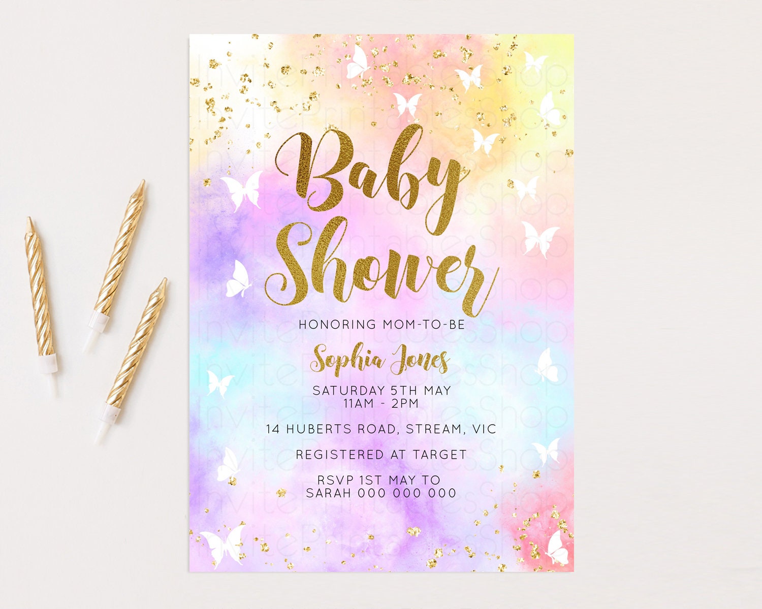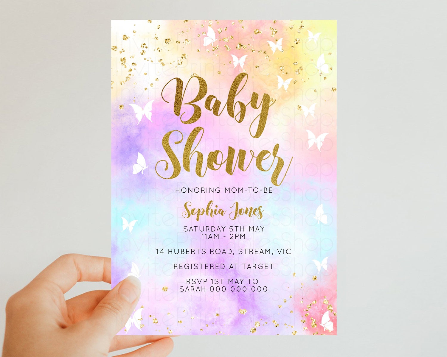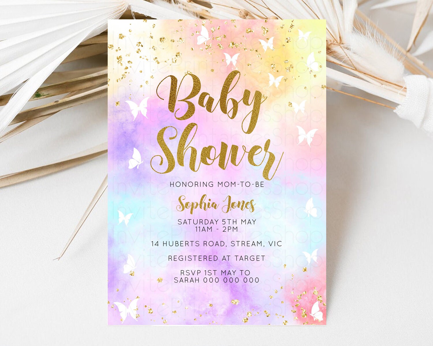 Rainbow Baby Shower Invitation Pastel Baby Sower Invitation Colorful Invite Sprinkle Confetti Watercolor Butterfly Baby Shower Invite D10435