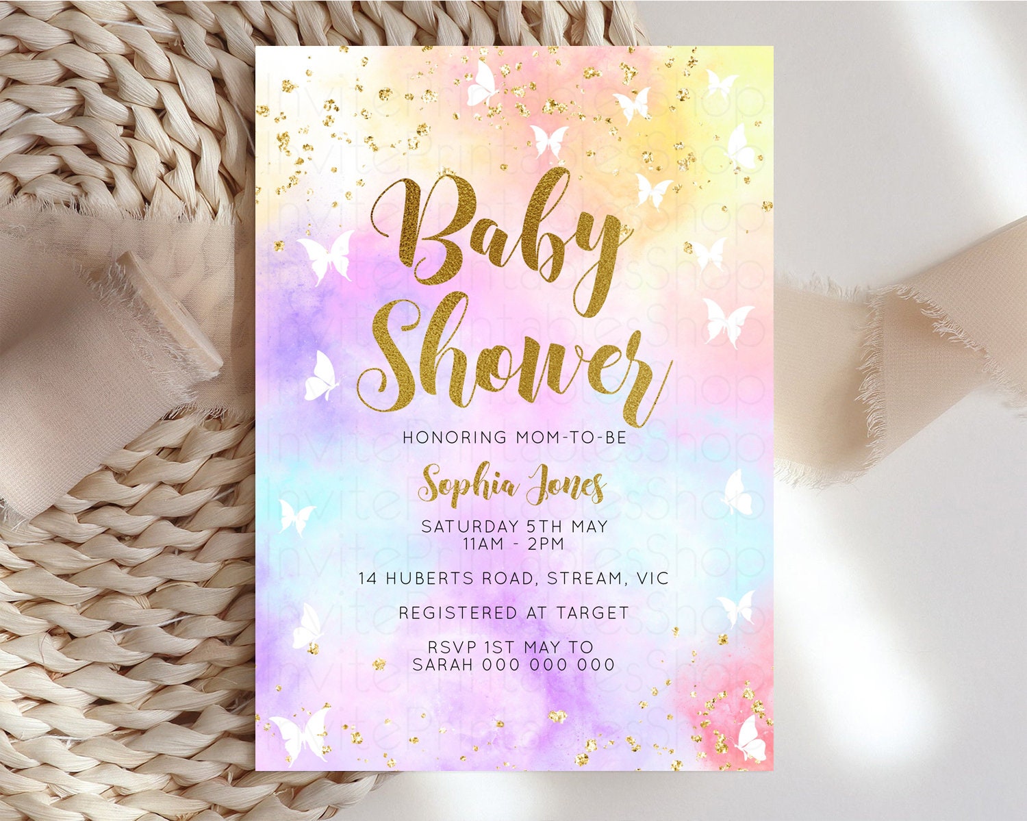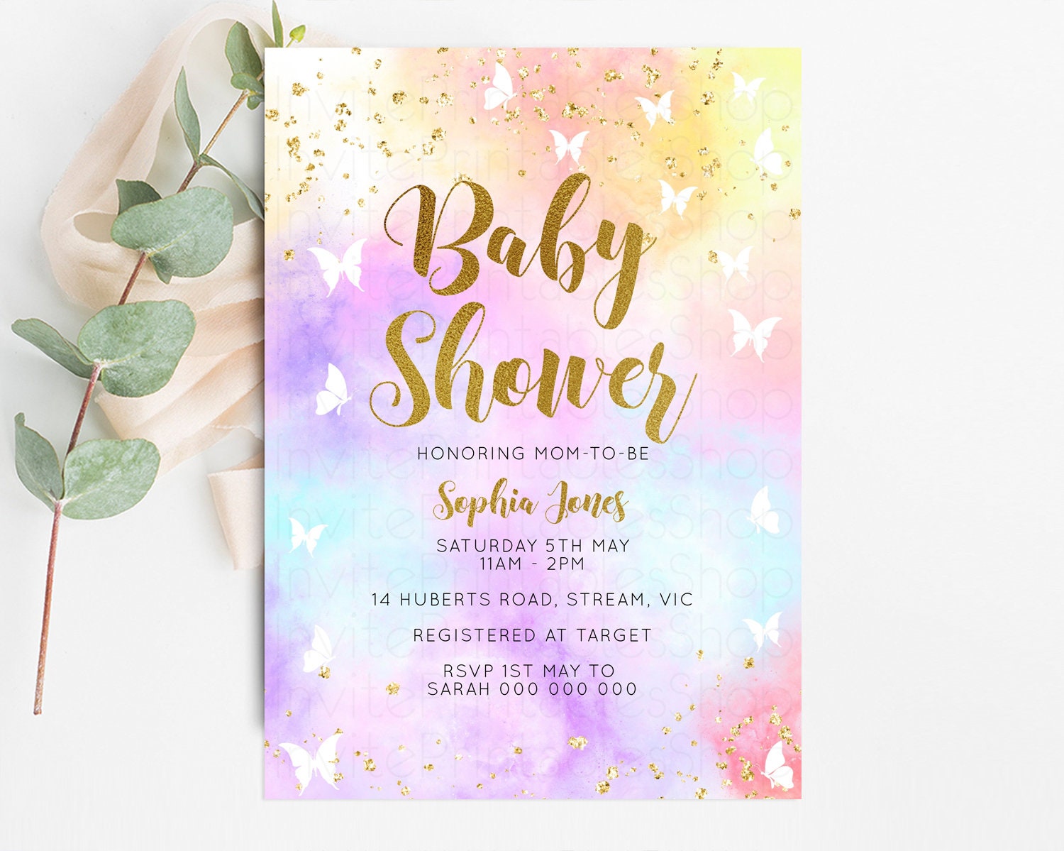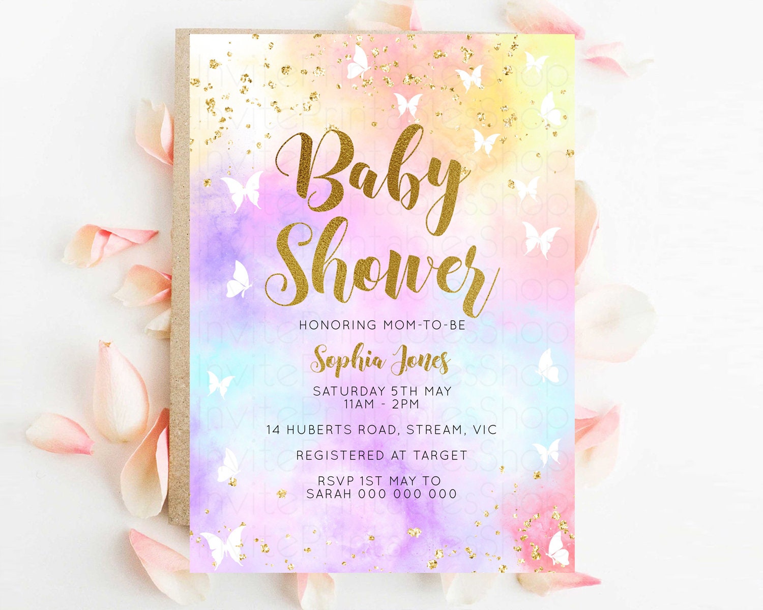 Rainbow Baby Shower Invitation Pastel Baby Sower Invitation Colorful Invite Sprinkle Confetti Watercolor Butterfly Baby Shower Invite D10435