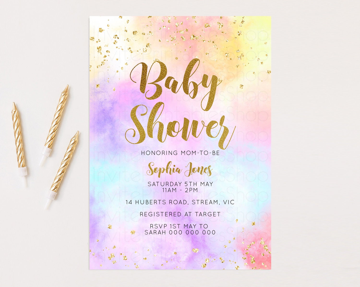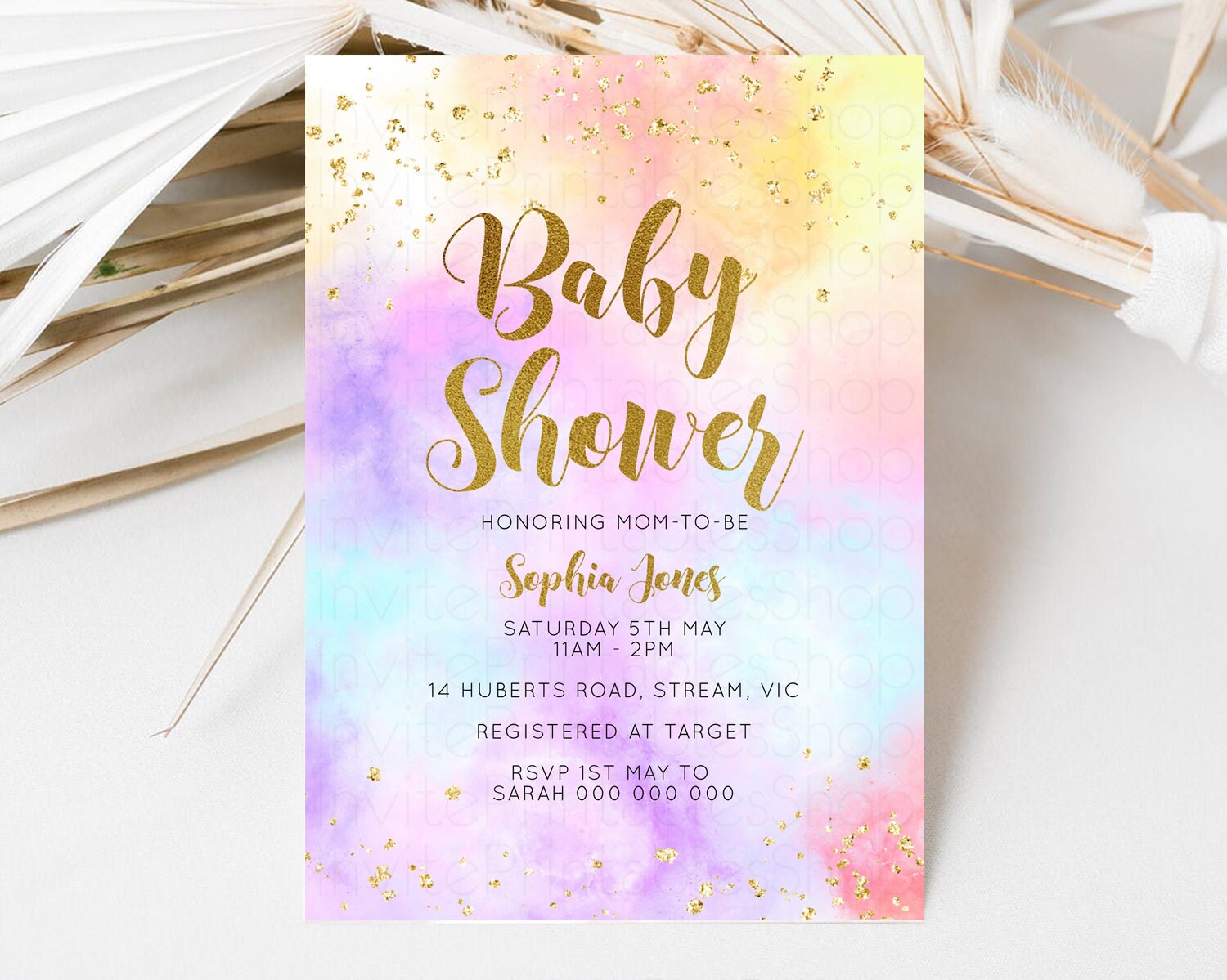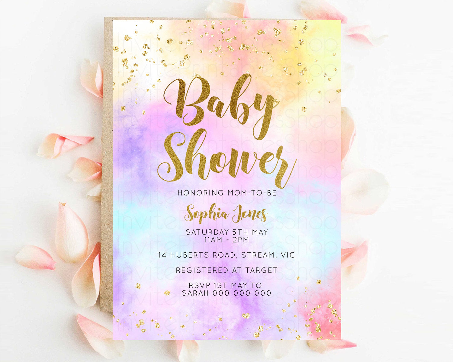 Rainbow Baby Shower Invitation Pastel Baby Sower Invitation Colorful Splash Invite Sprinkle Confetti Watercolor Ombre Baby Shower Invite 499