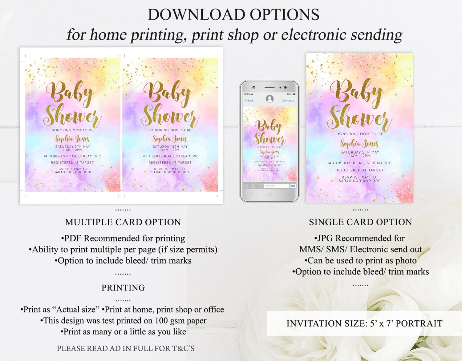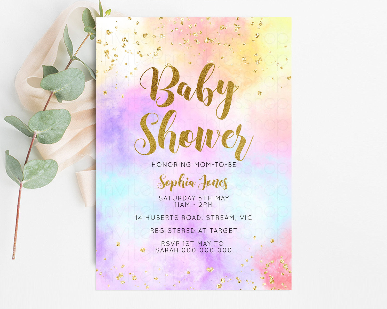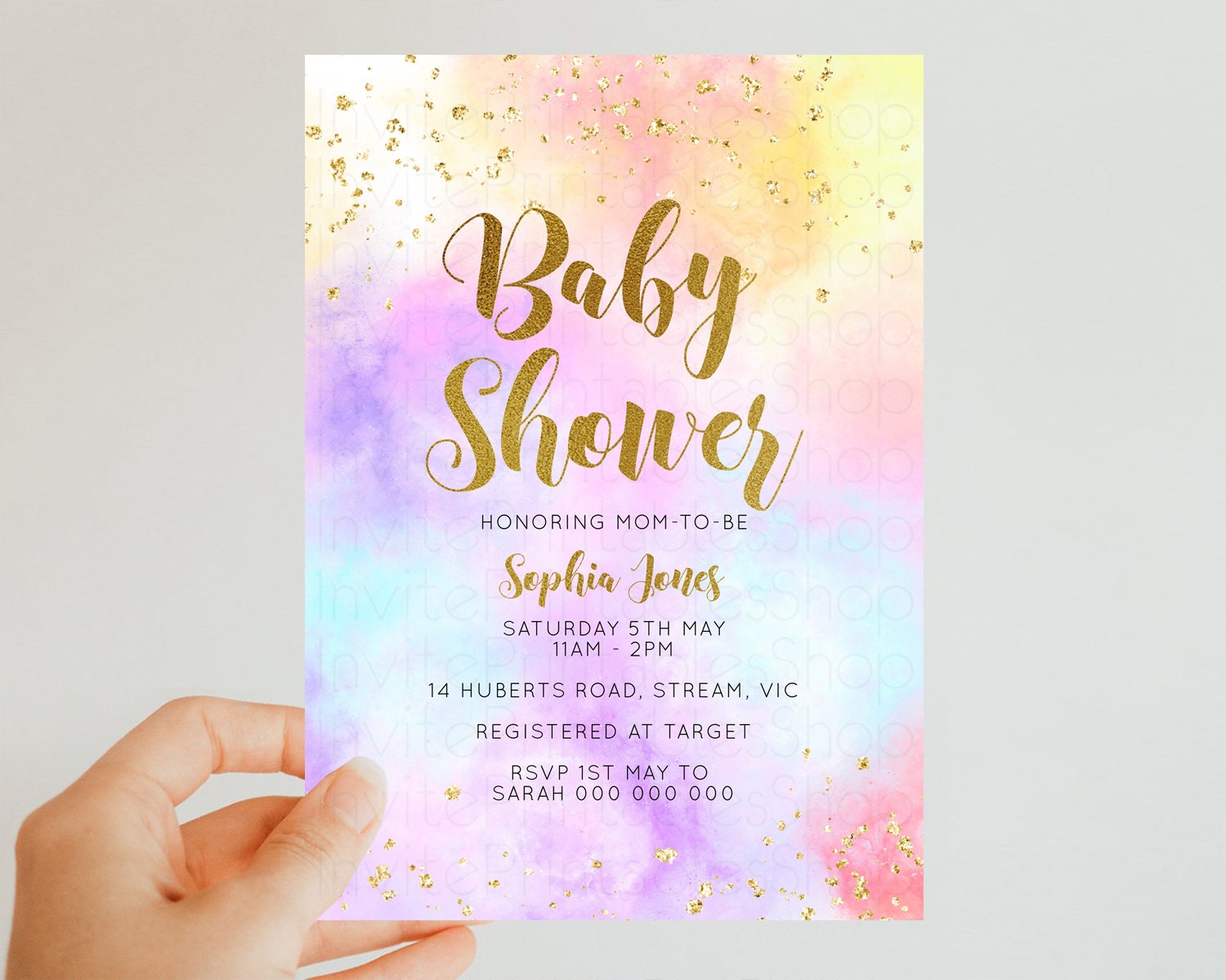 Rainbow Baby Shower Invitation Pastel Baby Sower Invitation Colorful Splash Invite Sprinkle Confetti Watercolor Ombre Baby Shower Invite 499
