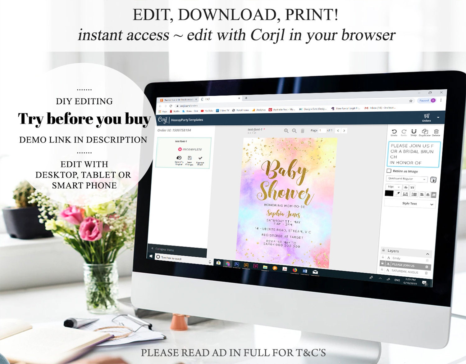 •Try before you buy! • DEMO LINK- https://www.corjl.com/d/29JMK1 Matching items: https://etsy.me/3qLed6u PLEASE READ AD IN FULL!! •Digital file. No physical item will be shipped •Do it yourself Editing. Edit online with Corjl or Edit with your mobile ITEM DETAILS Invitation size: 5’x7’ File type: PDF, JPEG Resolution: 300DPI PDF FILE OPTIONS: •Recommended for printing •Ability to print multiple per page (if size permits) •Option to include bleed/ trim marks JPG FILE OPTIONS: •Recommended for MMS/ SMS/ Electronic send out •Can be used to print as photo •Option to include bleed/ trim marks EDITING • Do it yourself editing • Mobile editing is available • Google chrome is the recommend browser for Corjl. Please download here for FREE: https://www.google.com/chrome/ • Using other browsers may not show all of Corjl's editing features • Editing on a desktop/ laptop computer is recommended to access all of Corjl features • Mobile editing is available, please use a desktop/ laptop computer to access all of Corjl features DOWNLOADS & EXPIRY •Maximum 3 downloads on the same edit •Link expires 30 days after purchase DOWNLOAD NOTICE •Once you have reached your download limits &/ “approve proof” in Corjl. You will not be able to request further downloads on your design. Further download requests are not permitted WHAT IS EDITABLE •Text - colours, fonts, size, move, delete & rotation. •Please see demo link for what you can and can’t do WHAT YOU CAN’T EDIT •Template size •Template orientation •Graphics CAN NOT BE deleted, moved, or changed in colour •Please see demo link for what you can and can’t do HOW TO 1. Choose design template & checkout on Etsy. 2. Email will be sent from Corjl. Follow link to access template 3. Edit, save & print INSTRUCTIONS •Instructions on how to edit your design have been written by Corjl and will be available with your purchase. PRINTING •Colours can vary depending on the monitor, printer & cardstock •Can be printed at home •Home printing will require you to select the high quality print settings, select appropriate paper thickness & click "Actual size" prior to you printing •This design was test printed on 100 gsm paper •Can be printed at local print shop. Please check printing requirements & any printing restrictions prior to purchase PERSONAL USE ONLY. This item cannot be shared, re-sold, or used commercially for profit. REFUND POLICY •We are unable to provide a refund/ exchange on commenced & completed work, instant downloads or self-editing link templates. Please use the demo link to work out if this product is right for you. Copyright © 2018 by InvitePrintablesShop PTY LTD All rights reserved. This file or any portion thereof may not be reproduced or resold without the express written permission of the publisher (including edits to the design). Our files are provided as high-resolution PDFs – the end result is dependent upon the printer and paper used. If using a professional printing company, InvitePrintablesShop are not responsible for their specific printing requirements, paper or colour quality. Any changes required to the template are not included with your purchase – the files come as described in the listing only and cannot be changed. Thank you for visiting Invite Printables Shop:)