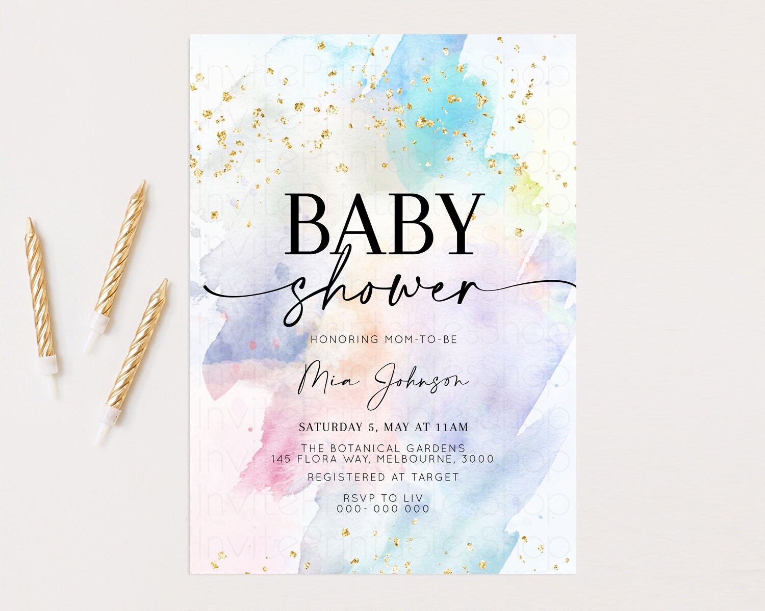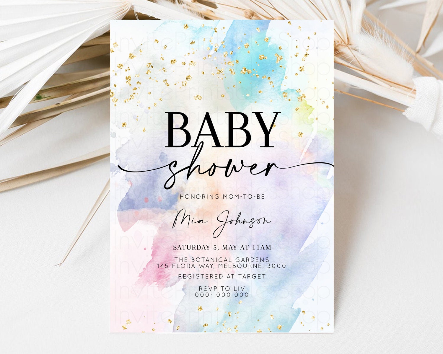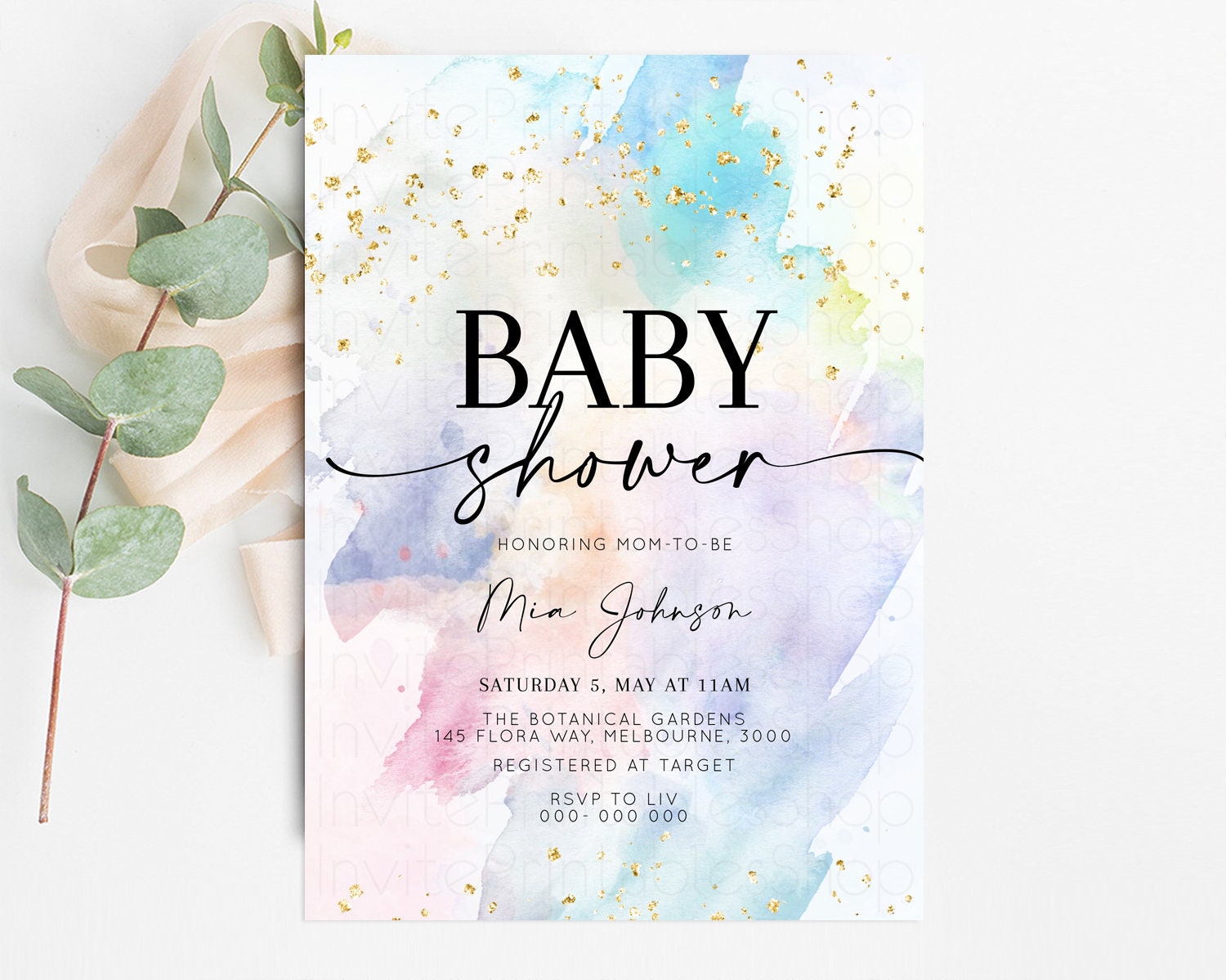 Rainbow Baby Shower Invitation Pastel Baby Sower Invite Colorful Splash Invite Sprinkle Confetti Watercolor Ombre Baby Shower Invite T487