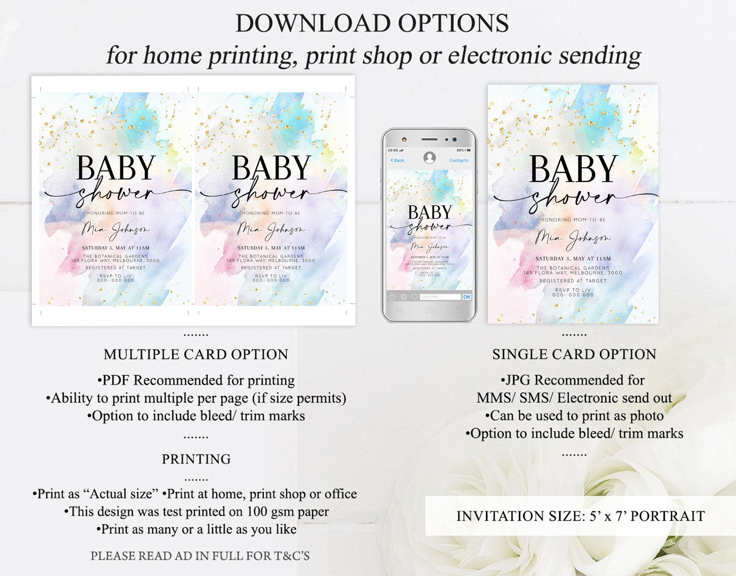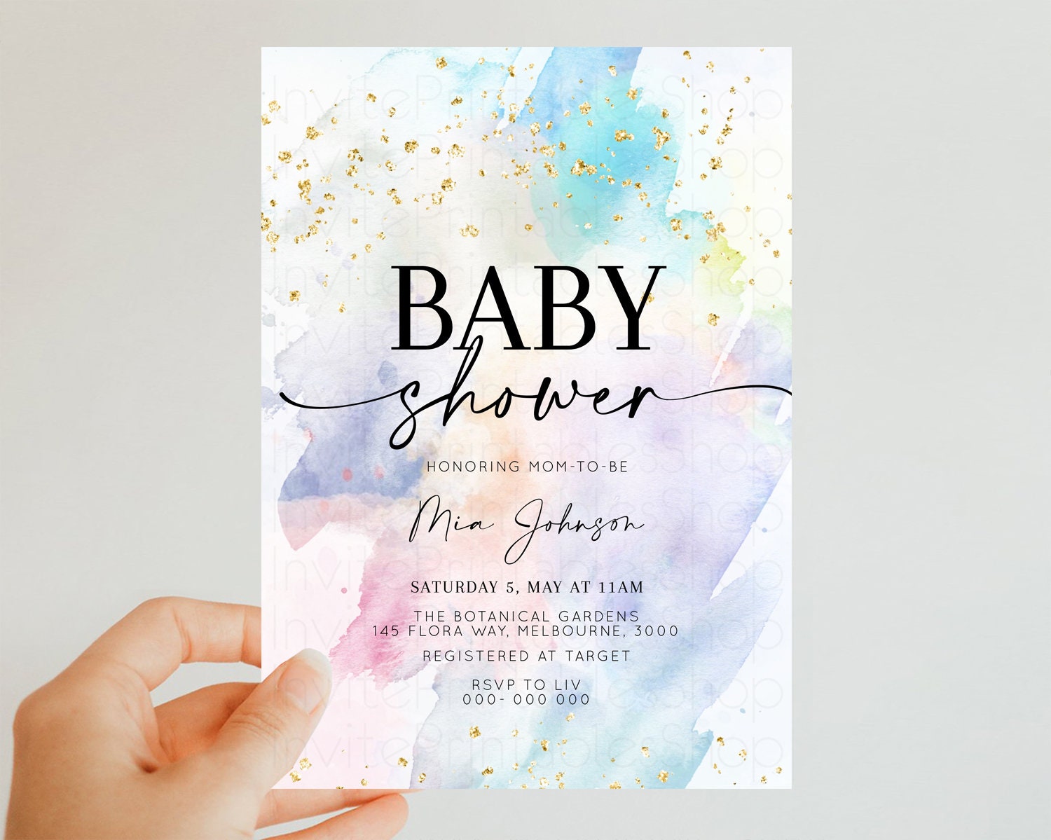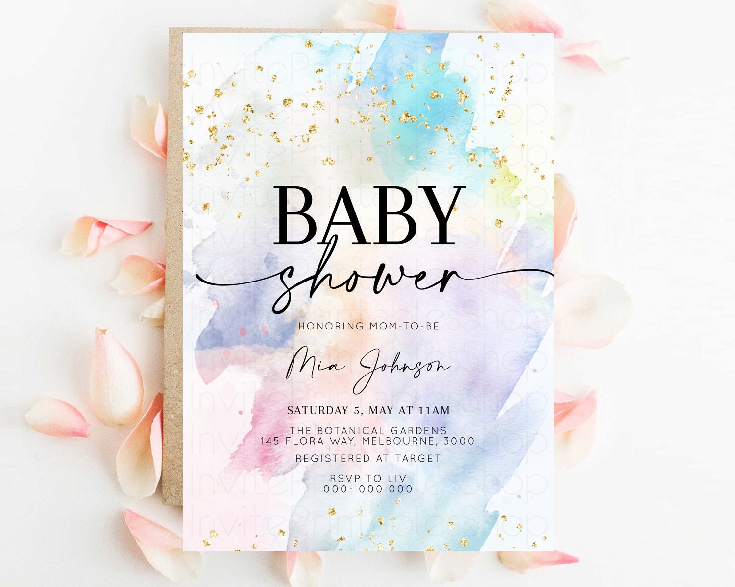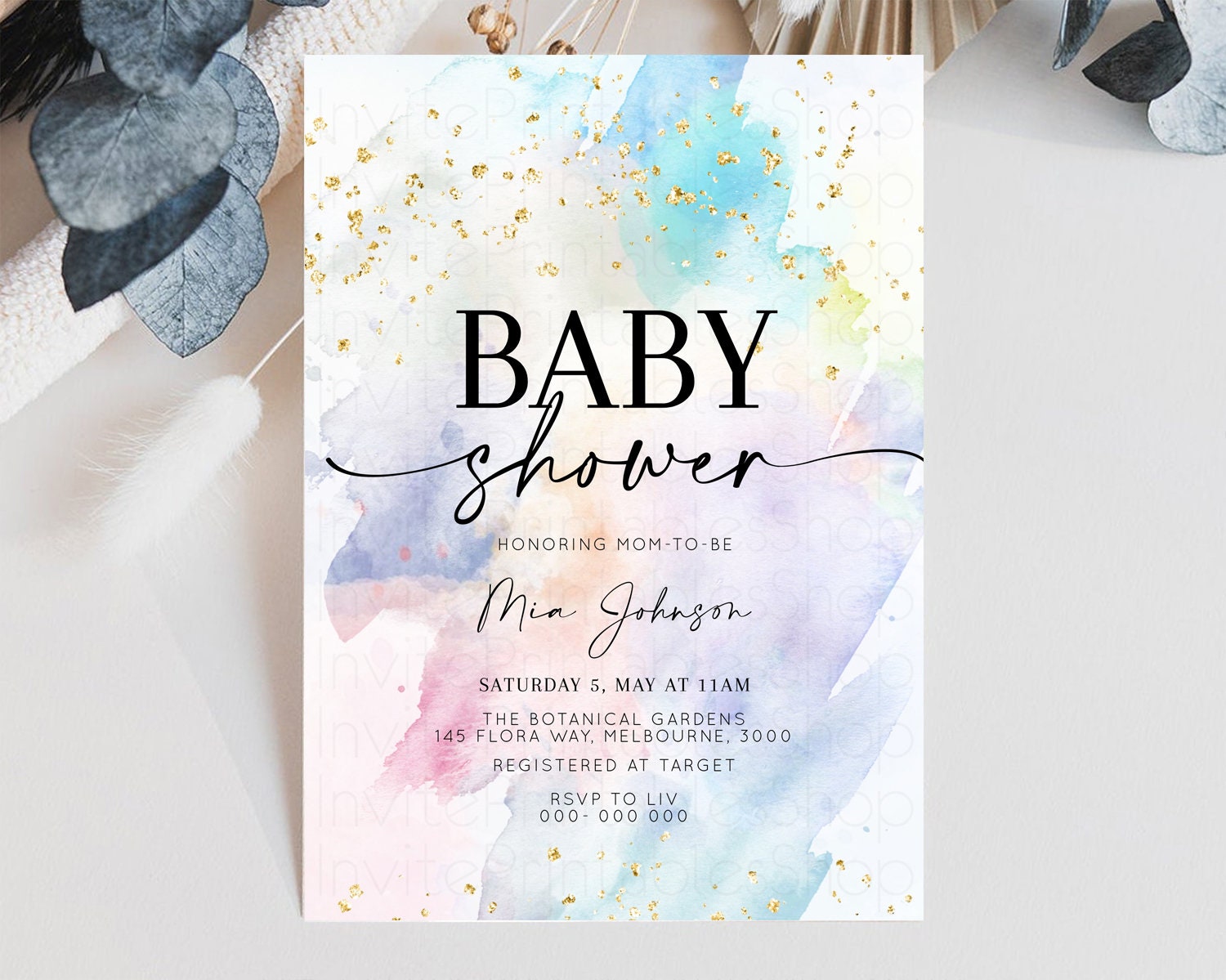 Rainbow Baby Shower Invitation Pastel Baby Sower Invite Colorful Splash Invite Sprinkle Confetti Watercolor Ombre Baby Shower Invite T487