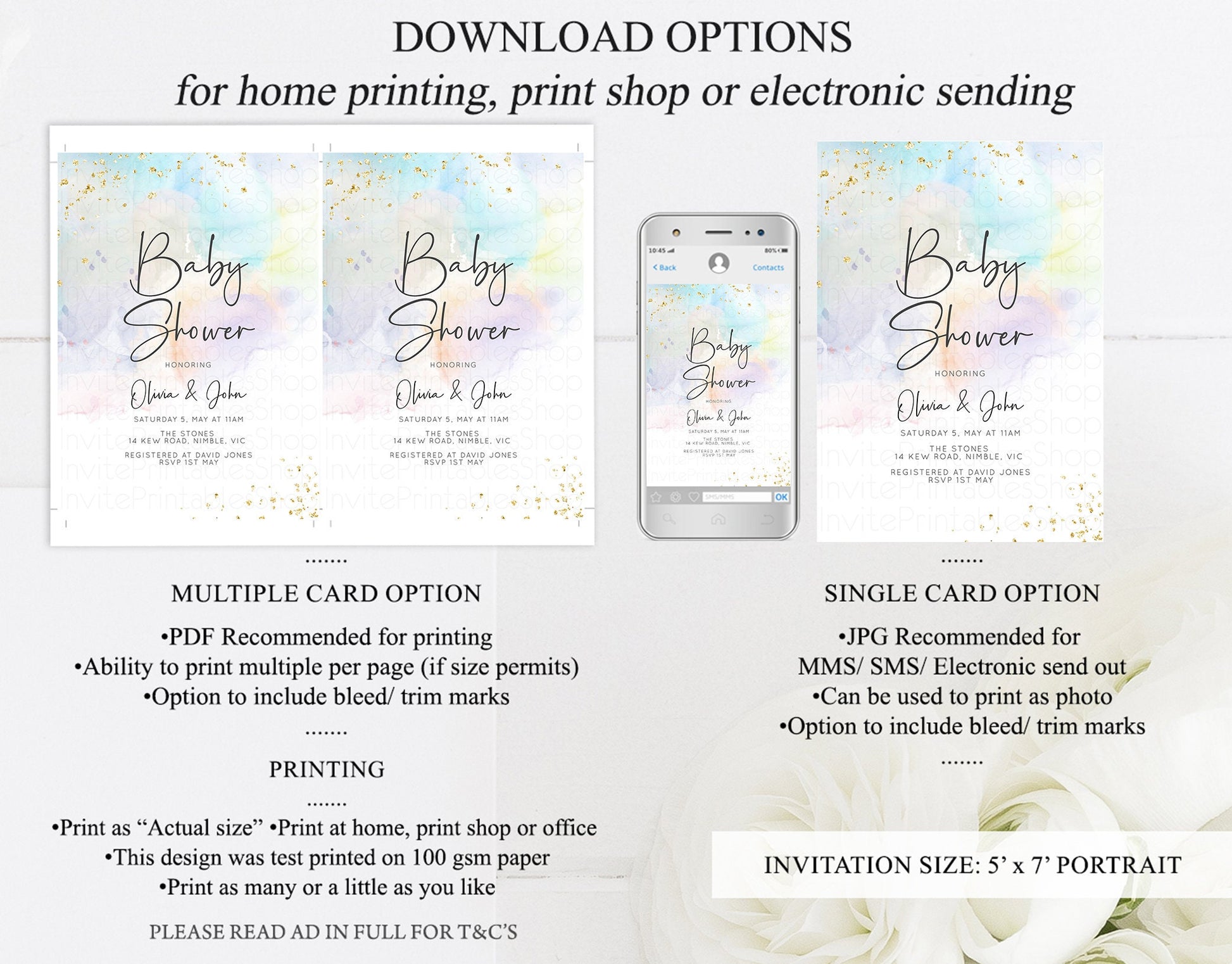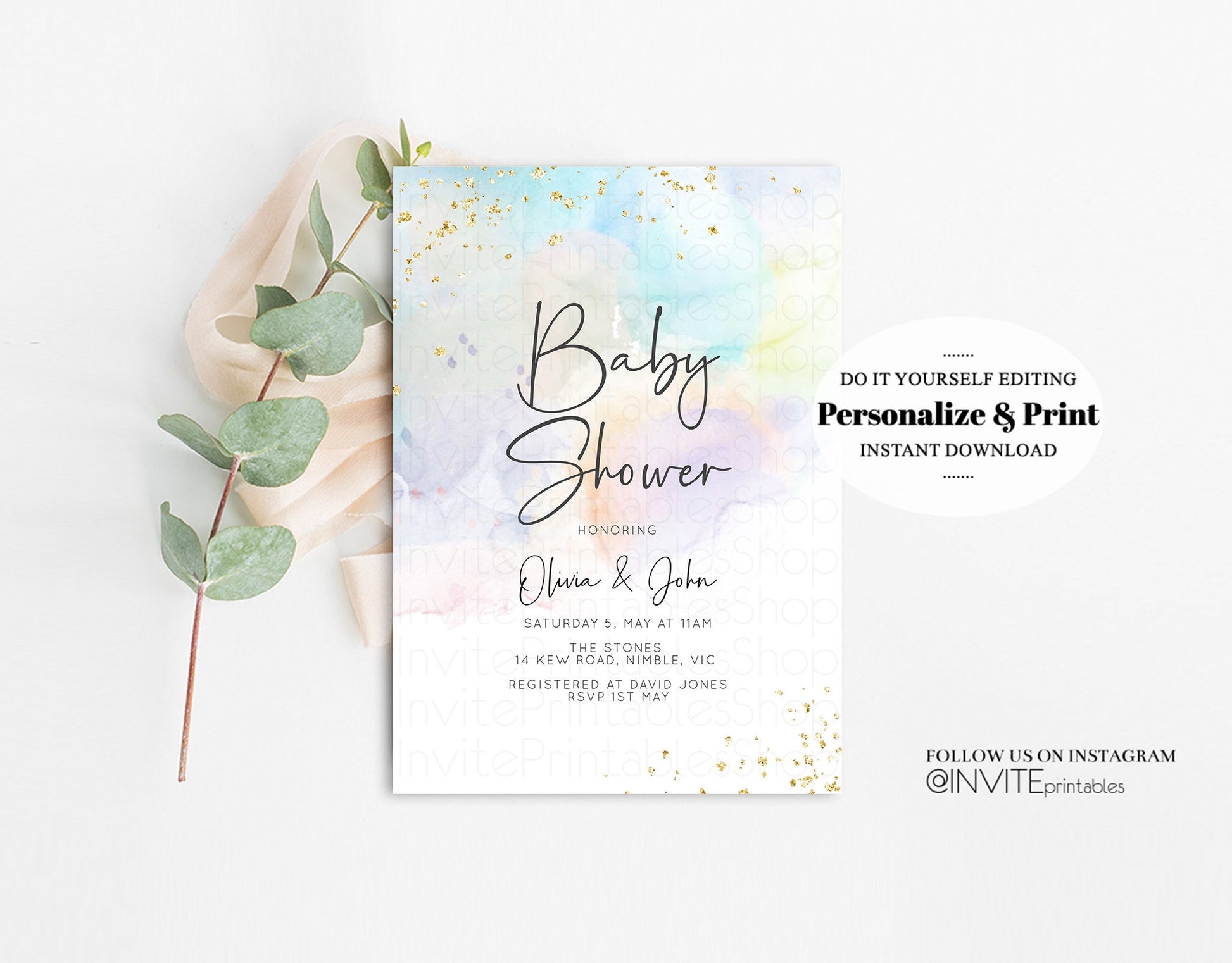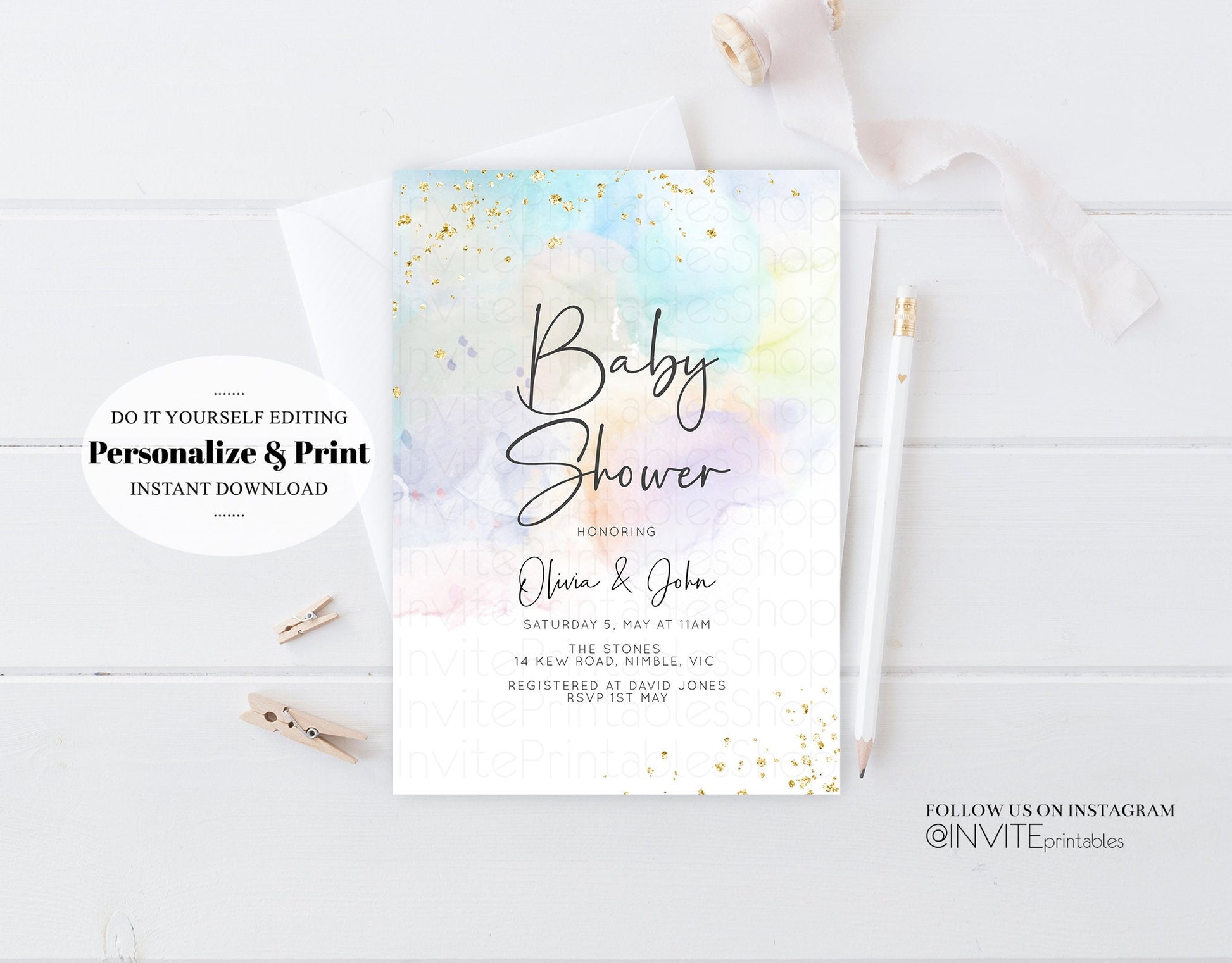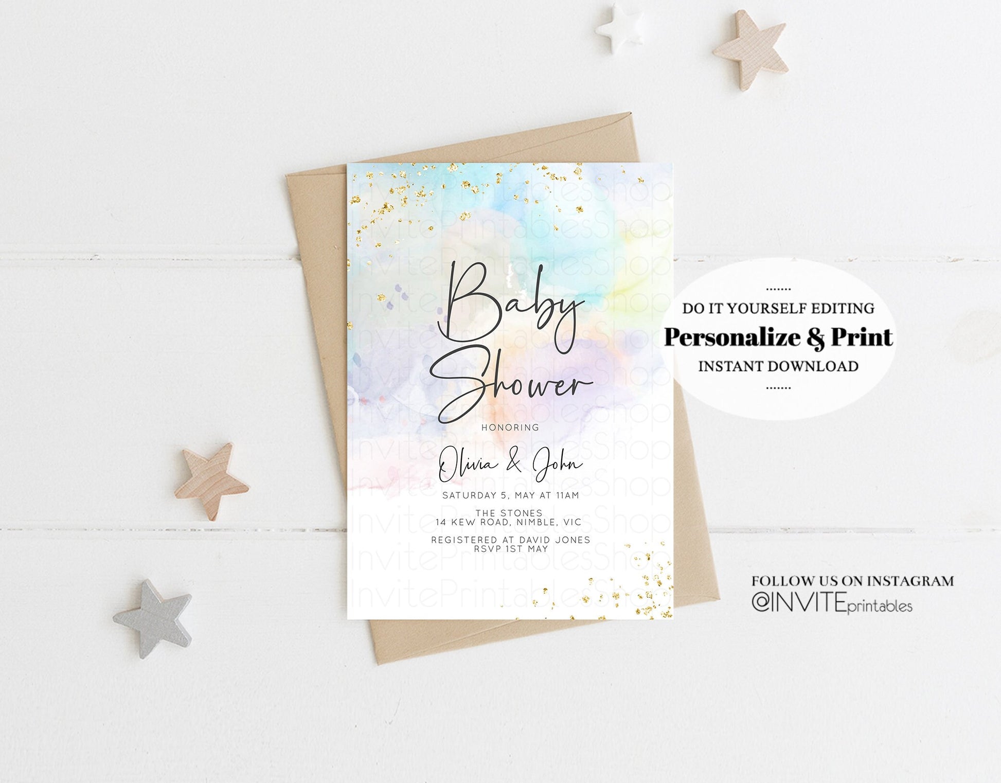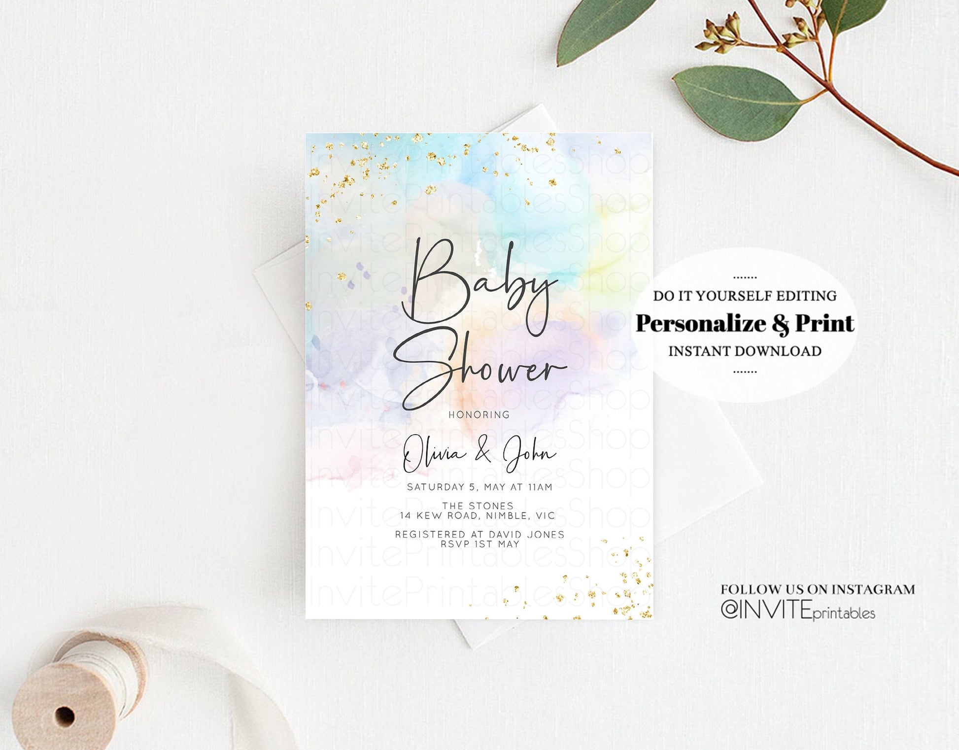 Rainbow Baby Shower Invitation Pastel Colorful Watercolor Gold Glitter Foil Sprinkles Confetti Gender Neutral Editable Instant Download 136