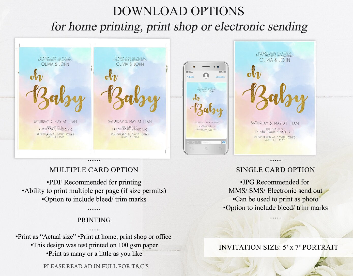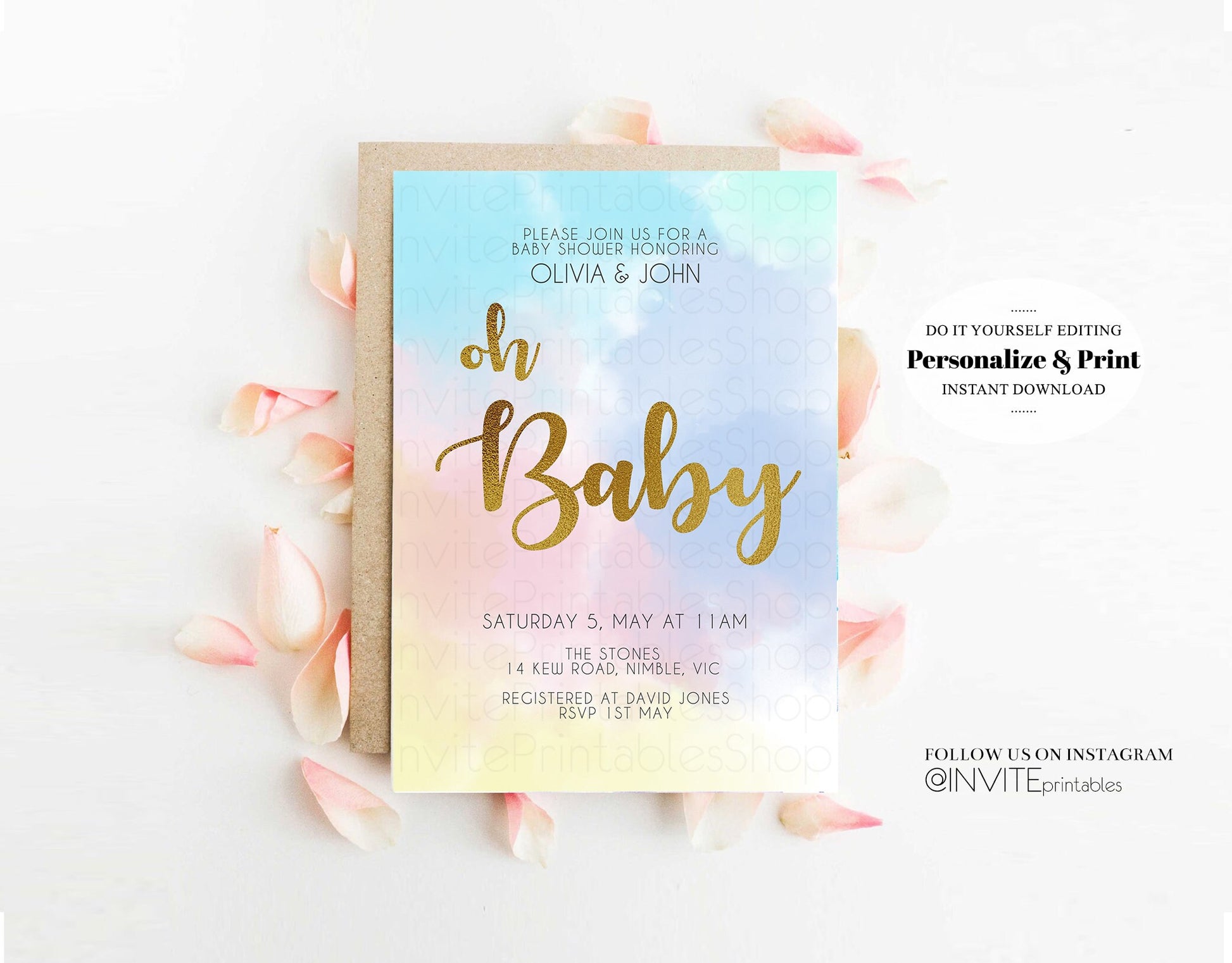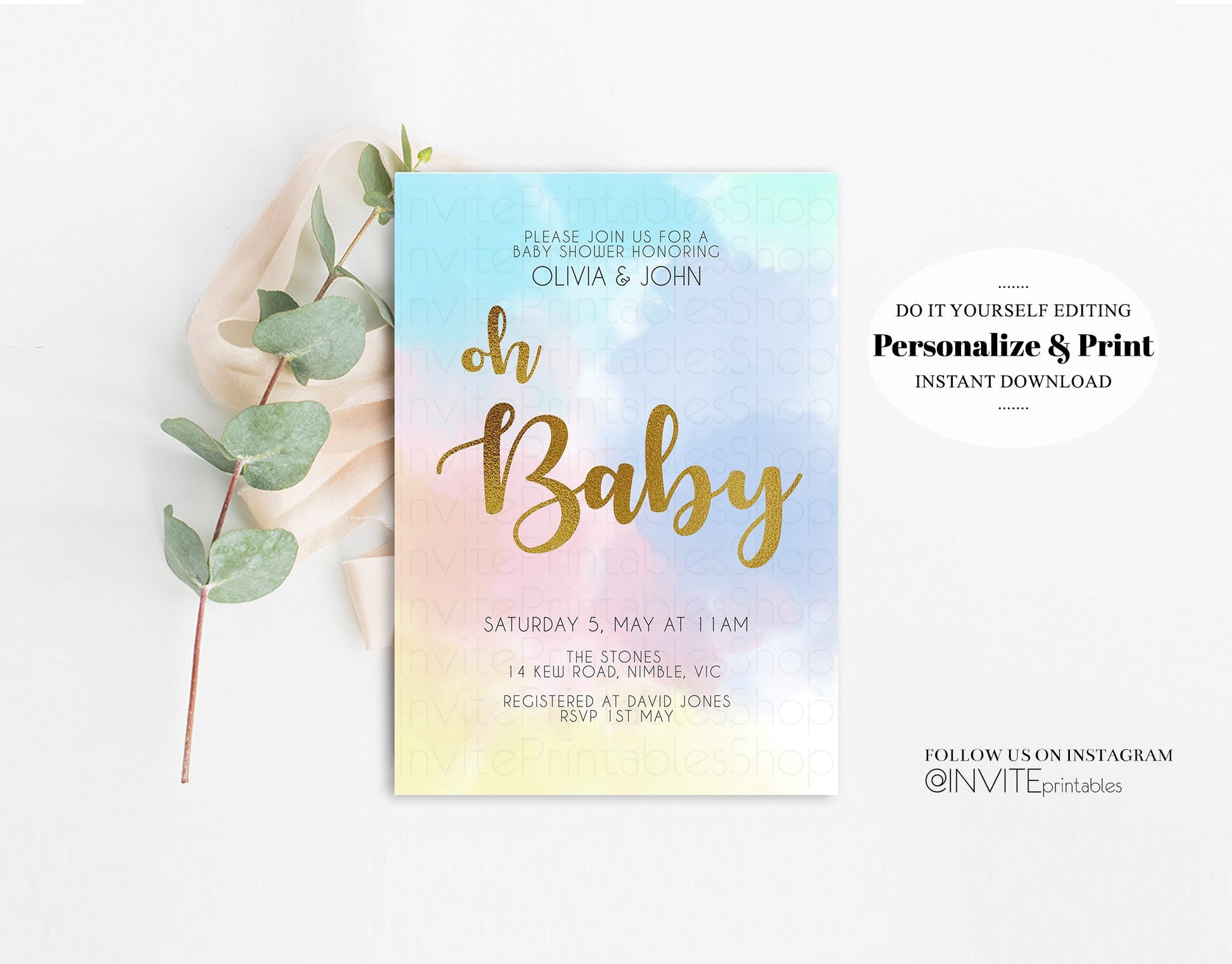 Rainbow Baby Shower Invitation Pastel Invitation Colorful Oh Baby Invite Watercolor Splash Gold Foil Glitter Ombre Pink Blue Yellow
