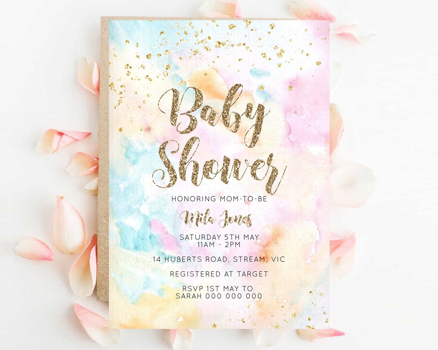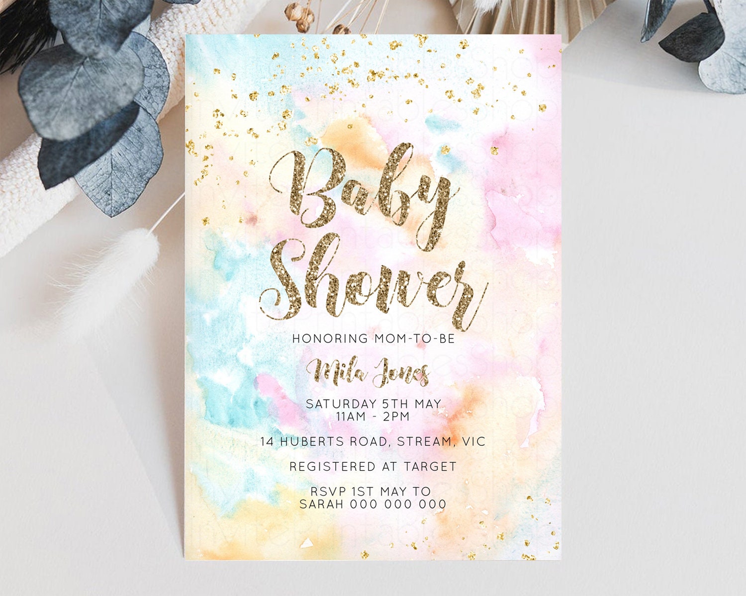 Rainbow Baby Shower Invitation Pastel Watercolor Invitation Colorful Splash Gold Splatter Glitter Foil Sprinkles Confetti Editable G566