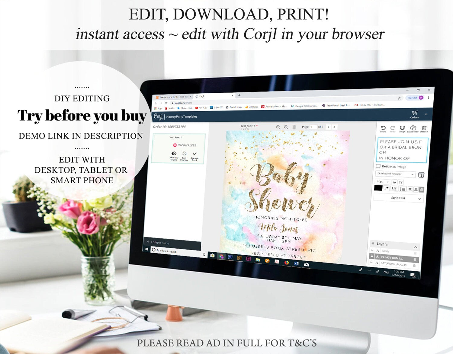 • After purchase, Corjl emails your editing link. Allow up to 15 minutes for delivery.