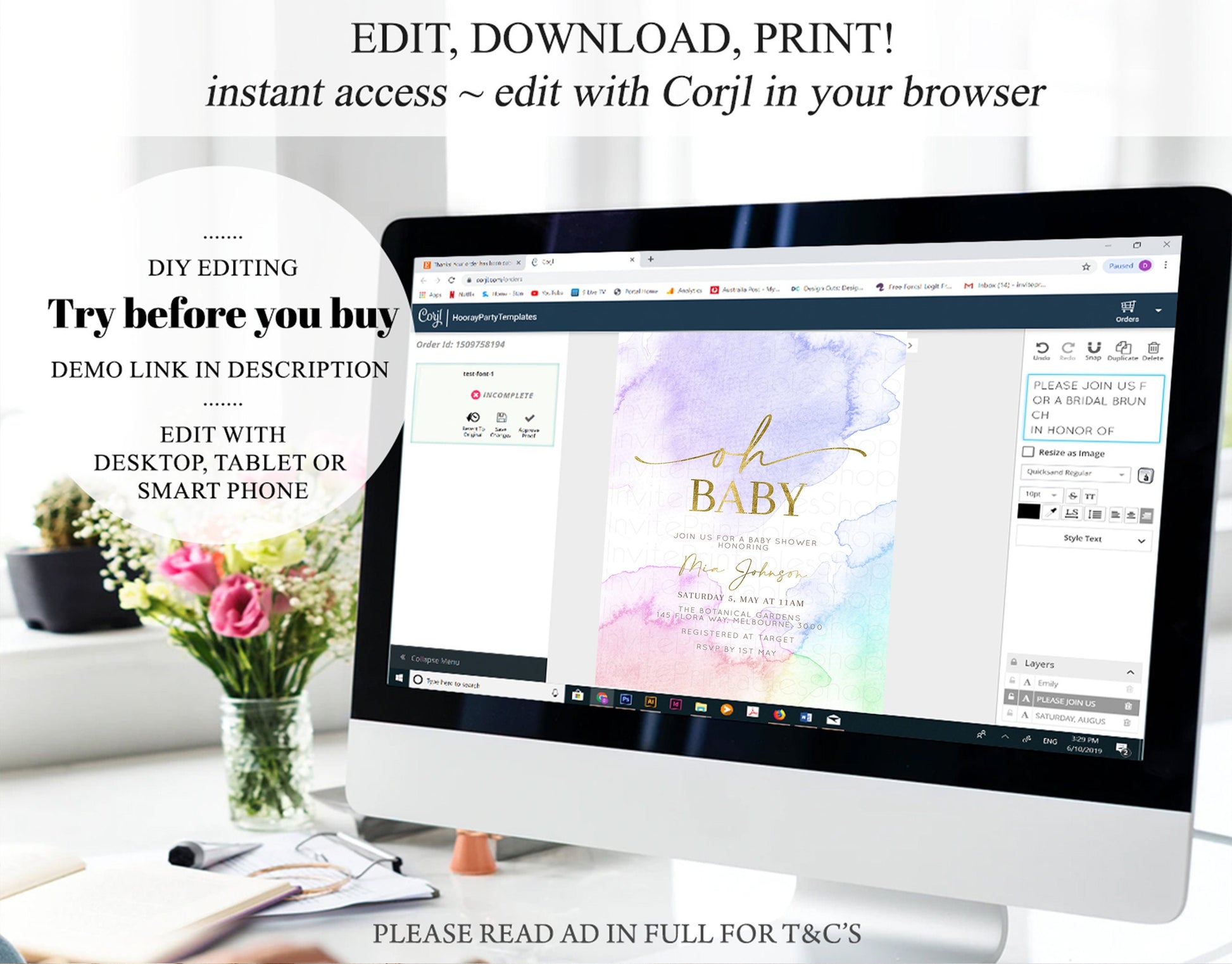 •Try before you buy! • DEMO LINK- https://www.corjl.com/d/2C45A8 PLEASE READ AD IN FULL!! •Digital file. No physical item will be shipped •Do it yourself Editing. Edit online with Corjl or Edit with your mobile ITEM DETAILS Invitation size: 5’x7’ File type: PDF, JPEG Resolution: 300DPI PDF FILE OPTIONS: •Recommended for printing •Ability to print multiple per page (if size permits) •Option to include bleed/ trim marks JPG FILE OPTIONS: •Recommended for MMS/ SMS/ Electronic send out •Can be used to print as photo •Option to include bleed/ trim marks EDITING • Do it yourself editing • Mobile editing is available • Google chrome is the recommend browser for Corjl. Please download here for FREE: https://www.google.com/chrome/ • Using other browsers may not show all of Corjl's editing features • Editing on a desktop/ laptop computer is recommended to access all of Corjl features • Mobile editing is available, please use a desktop/ laptop computer to access all of Corjl features DOWNLOADS & EXPIRY •Maximum 3 downloads on the same edit •Link expires 30 days after purchase DOWNLOAD NOTICE •Once you have reached your download limits &/ “approve proof” in Corjl. You will not be able to request further downloads on your design. Further download requests are not permitted WHAT IS EDITABLE •Text - colours, fonts, size, move, delete & rotation. •Please see demo link for what you can and can’t do WHAT YOU CAN’T EDIT •Template size •Template orientation •Graphics CAN NOT BE deleted, moved, or changed in colour •Please see demo link for what you can and can’t do HOW TO 1. Choose design template & checkout on Etsy. 2. Email will be sent from Corjl. Follow link to access template 3. Edit, save & print INSTRUCTIONS •Instructions on how to edit your design have been written by Corjl and will be available with your purchase. PRINTING •Colours can vary depending on the monitor, printer & cardstock •Can be printed at home •Home printing will require you to select the high quality print settings, select appropriate paper thickness & click "Actual size" prior to you printing •This design was test printed on 100 gsm paper •Can be printed at local print shop. Please check printing requirements & any printing restrictions prior to purchase PERSONAL USE ONLY. This item cannot be shared, re-sold, or used commercially for profit. REFUND POLICY •We are unable to provide a refund/ exchange on commenced & completed work, instant downloads or self-editing link templates. Please use the demo link to work out if this product is right for you. Copyright © 2018 by InvitePrintablesShop PTY LTD All rights reserved. This file or any portion thereof may not be reproduced or resold without the express written permission of the publisher (including edits to the design). Our files are provided as high-resolution PDFs – the end result is dependent upon the printer and paper used. If using a professional printing company, InvitePrintablesShop are not responsible for their specific printing requirements, paper or colour quality. Any changes required to the template are not included with your purchase – the files come as described in the listing only and cannot be changed. Thank you for visiting Invite Printables Shop:)