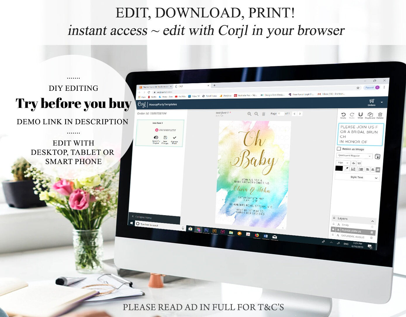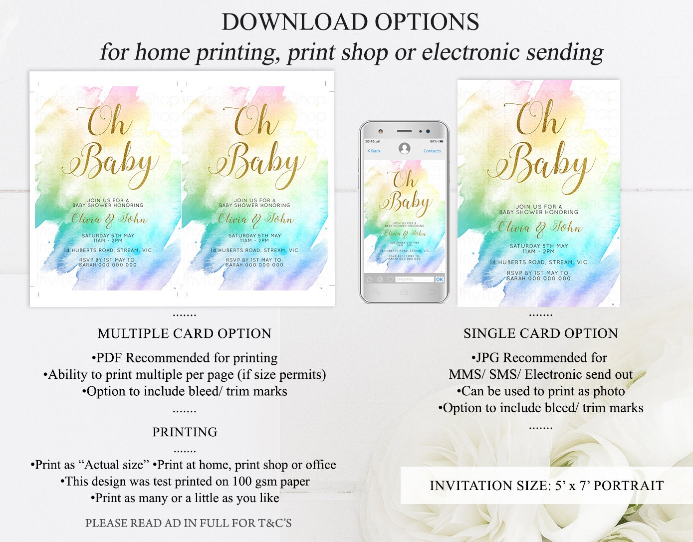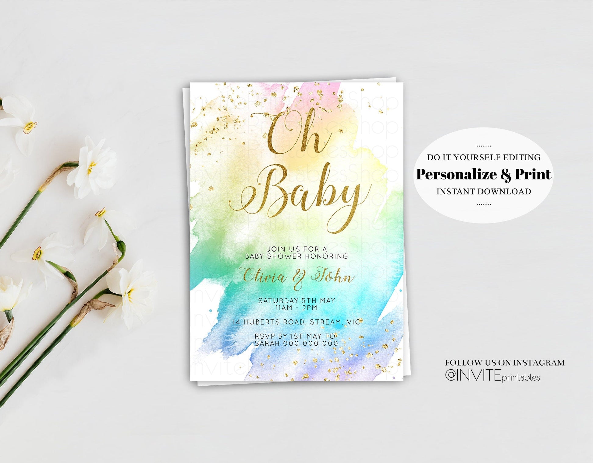 Rainbow Baby Shower Invitation Soft Pastel Watercolor Colorful Splash Blue Pink Purple Yellow Gold Foil Splatter Editable Template D11028