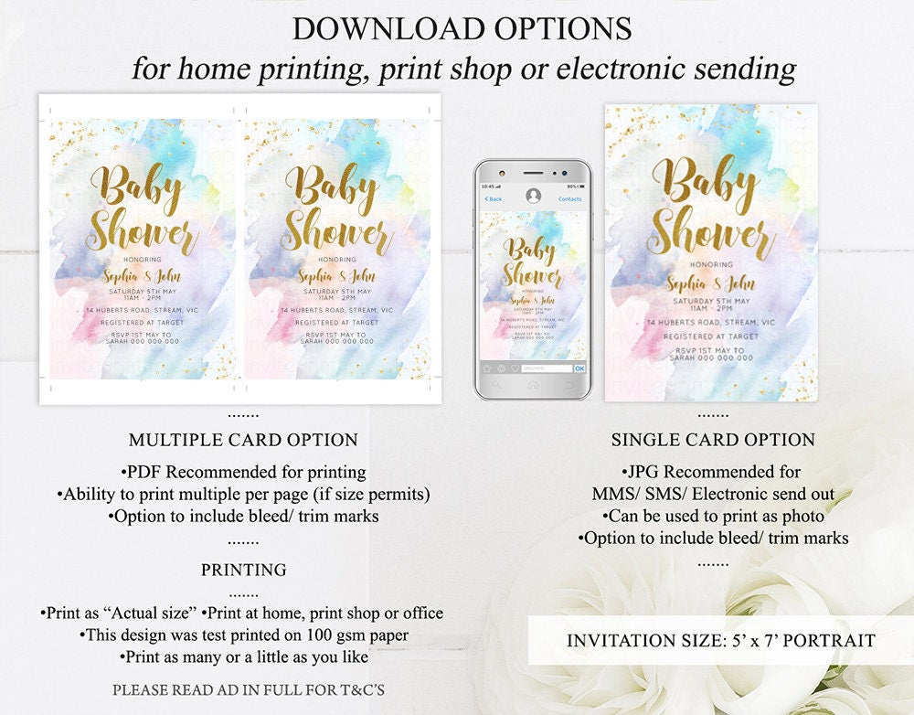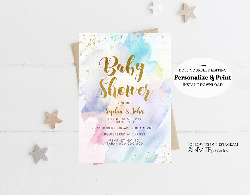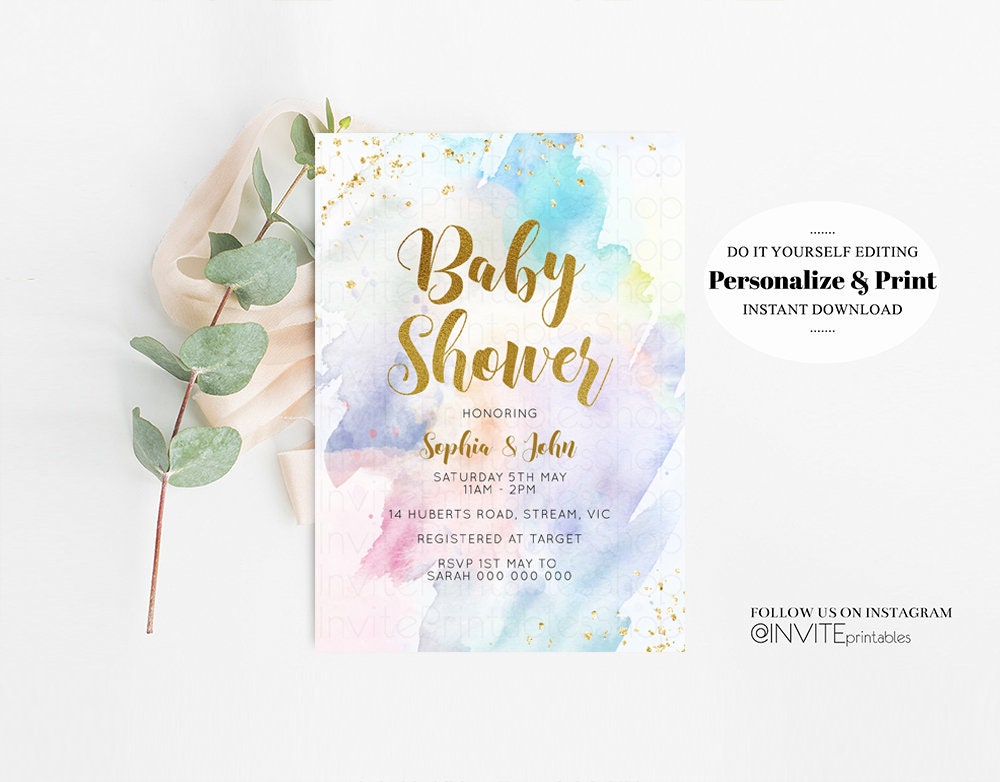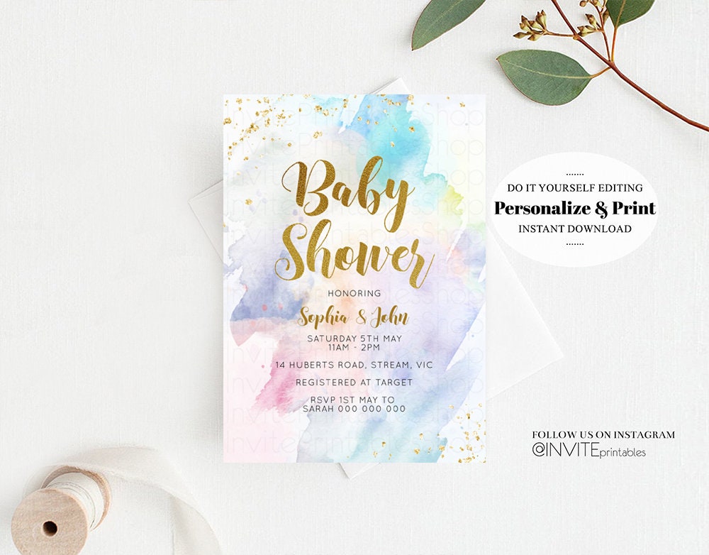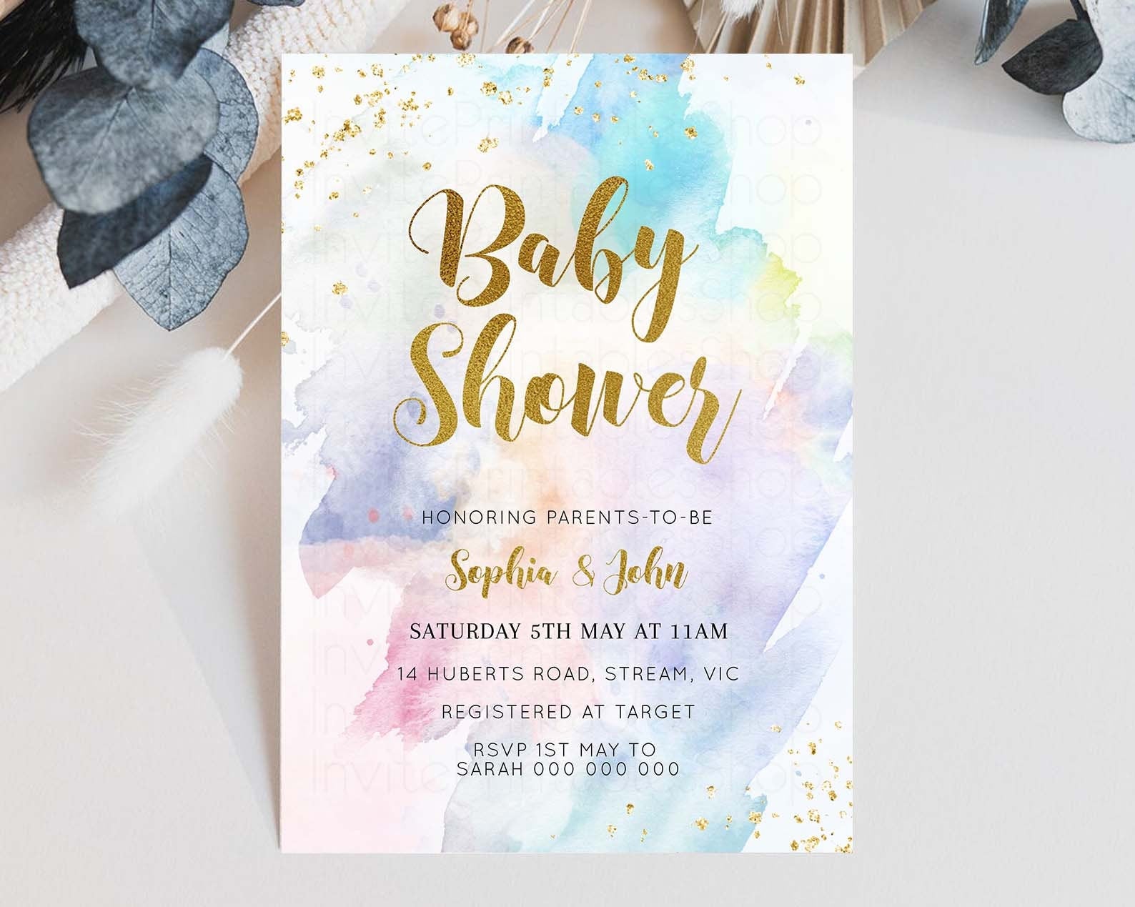 Rainbow Baby Shower Invitation Watercolor Pastel Invitation Colorful Splash Baby Invite Gold Glitter Sprinkles Ombre Gender Reveal
