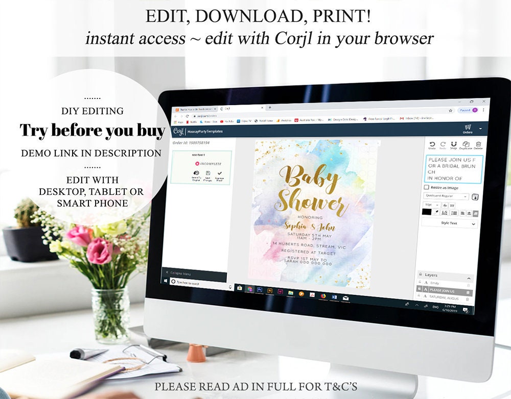 •Try before you buy! • DEMO LINK- https://www.corjl.com/d/1I5FCK PLEASE READ AD IN FULL!! •Digital file. No physical item will be shipped •Do it yourself Editing. Edit online with Corjl or Edit with your mobile ITEM DETAILS Invitation size: 5’x7’ File type: PDF, JPEG Resolution: 300DPI PDF FILE OPTIONS: •Recommended for printing •Ability to print multiple per page (if size permits) •Option to include bleed/ trim marks JPG FILE OPTIONS: •Recommended for MMS/ SMS/ Electronic send out •Can be used to print as photo •Option to include bleed/ trim marks EDITING • Do it yourself editing • Mobile editing is available • Google chrome is the recommend browser for Corjl. Please download here for FREE: https://www.google.com/chrome/ • Using other browsers may not show all of Corjl's editing features • Editing on a desktop/ laptop computer is recommended to access all of Corjl features • Mobile editing is available, please use a desktop/ laptop computer to access all of Corjl features DOWNLOADS & EXPIRY •Maximum 3 downloads on the same edit •Link expires 30 days after purchase DOWNLOAD NOTICE •Once you have reached your download limits &/ “approve proof” in Corjl. You will not be able to request further downloads on your design. Further download requests are not permitted WHAT IS EDITABLE •Text - colours, fonts, size, move, delete & rotation. •Please see demo link for what you can and can’t do WHAT YOU CAN’T EDIT •Template size •Template orientation •Graphics CAN NOT BE deleted, moved, or changed in colour •Please see demo link for what you can and can’t do HOW TO 1. Choose design template & checkout on Etsy. 2. Email will be sent from Corjl. Follow link to access template 3. Edit, save & print INSTRUCTIONS •Instructions on how to edit your design have been written by Corjl and will be available with your purchase. PRINTING •Colours can vary depending on the monitor, printer & cardstock •Can be printed at home •Home printing will require you to select the high quality print settings, select appropriate paper thickness & click "Actual size" prior to you printing •This design was test printed on 100 gsm paper •Can be printed at local print shop. Please check printing requirements & any printing restrictions prior to purchase PERSONAL USE ONLY. This item cannot be shared, re-sold, or used commercially for profit. REFUND POLICY •We are unable to provide a refund/ exchange on commenced & completed work, instant downloads or self-editing link templates. Please use the demo link to work out if this product is right for you. Copyright © 2018 by InvitePrintablesShop PTY LTD All rights reserved. This file or any portion thereof may not be reproduced or resold without the express written permission of the publisher (including edits to the design). Our files are provided as high-resolution PDFs – the end result is dependent upon the printer and paper used. If using a professional printing company, InvitePrintablesShop are not responsible for their specific printing requirements, paper or colour quality. Any changes required to the template are not included with your purchase – the files come as described in the listing only and cannot be changed. Thank you for visiting Invite Printables Shop:)