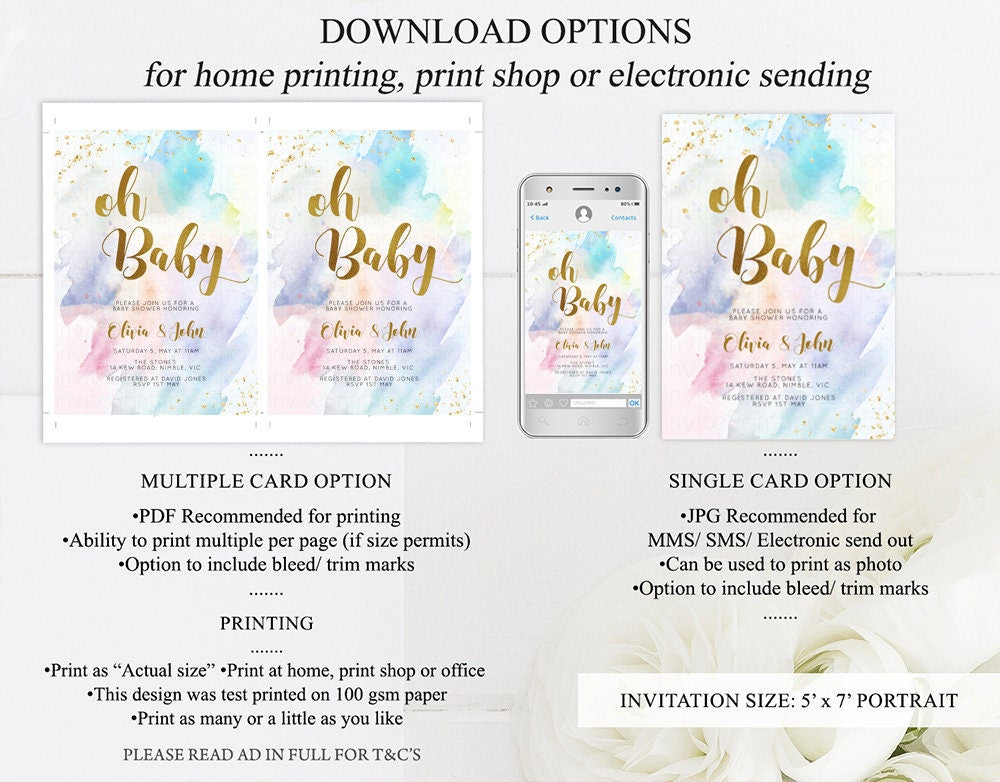 Rainbow Baby Shower Invitation Watercolor Pastel Invitation Colorful Splash Baby Invite Gold Glitter Sprinkles Ombre Gender Reveal G487