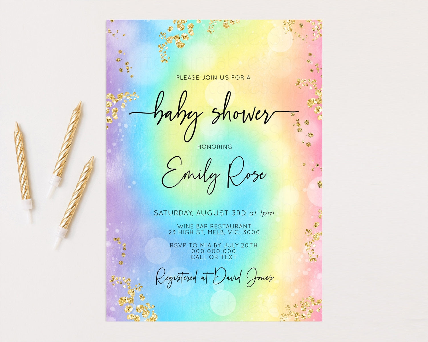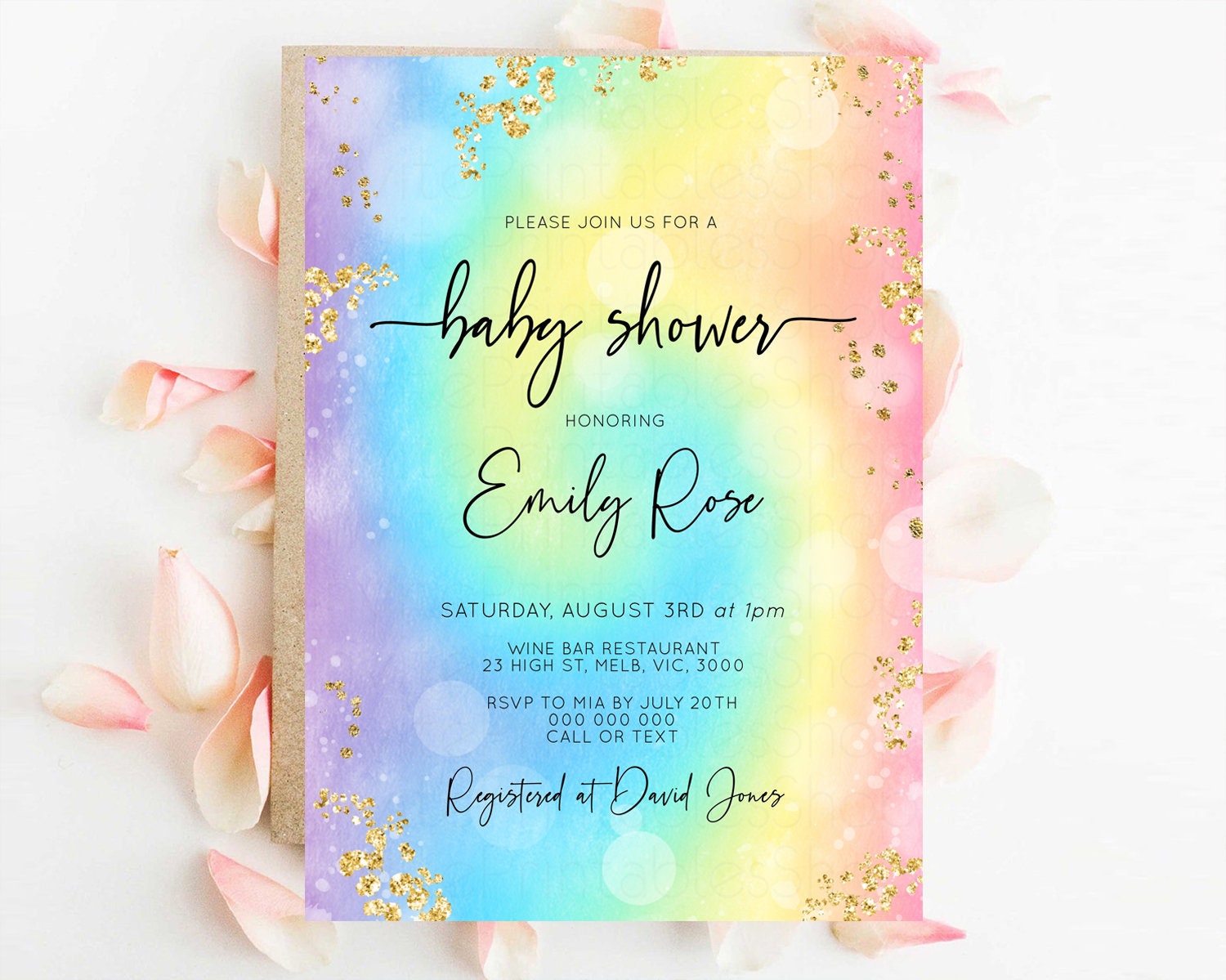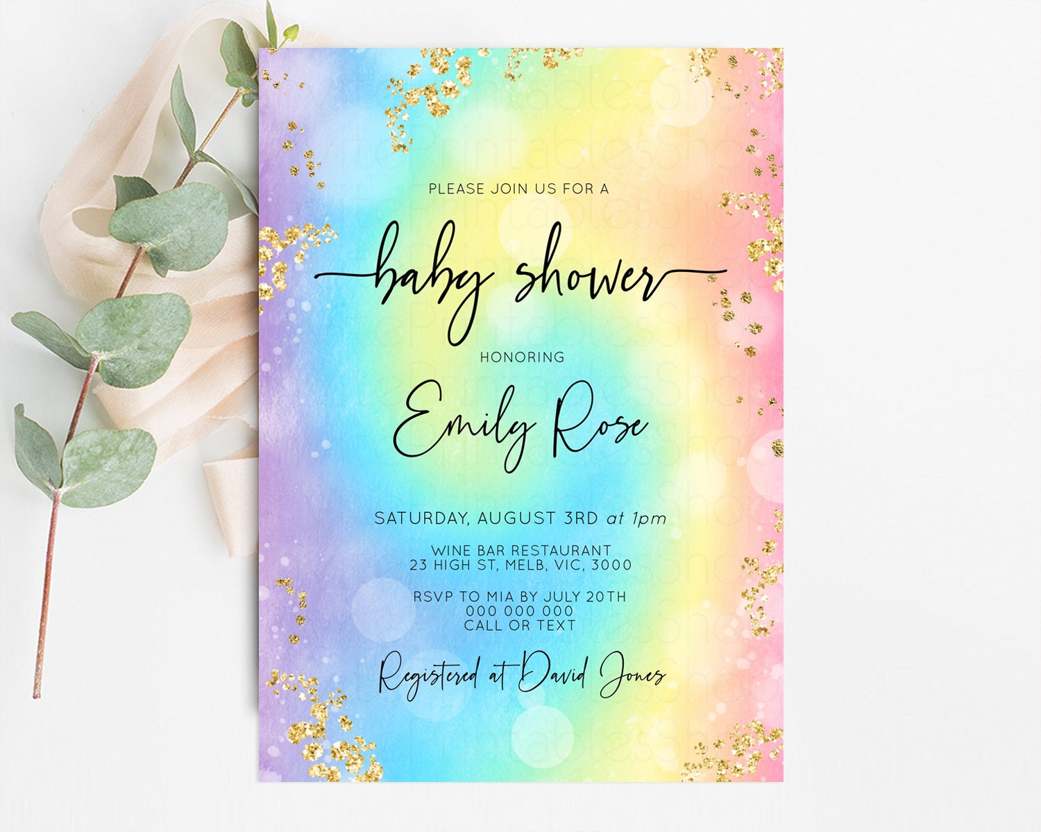 Rainbow Baby Shower Invitation Watercolor Pastel Invitation Colorful Splash Baby Invite Gold Glitter Sprinkles Ombre Gender Reveal t571