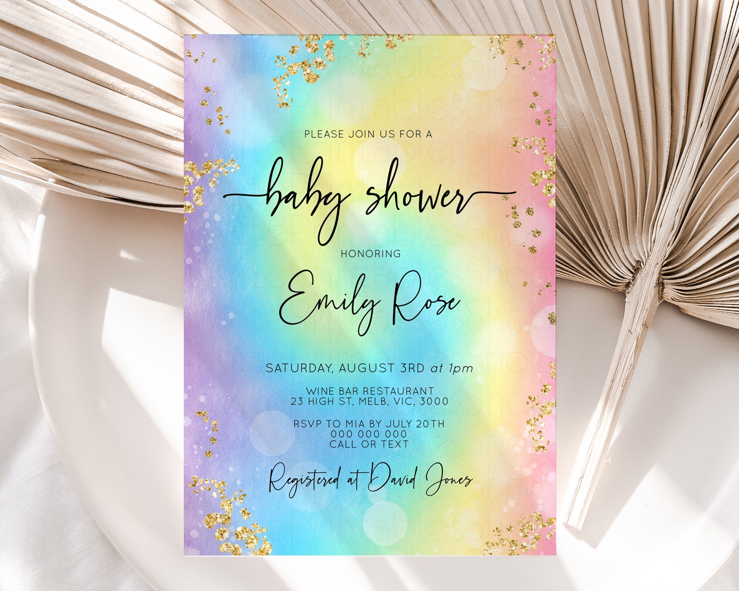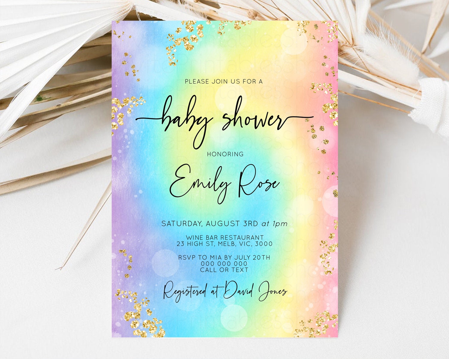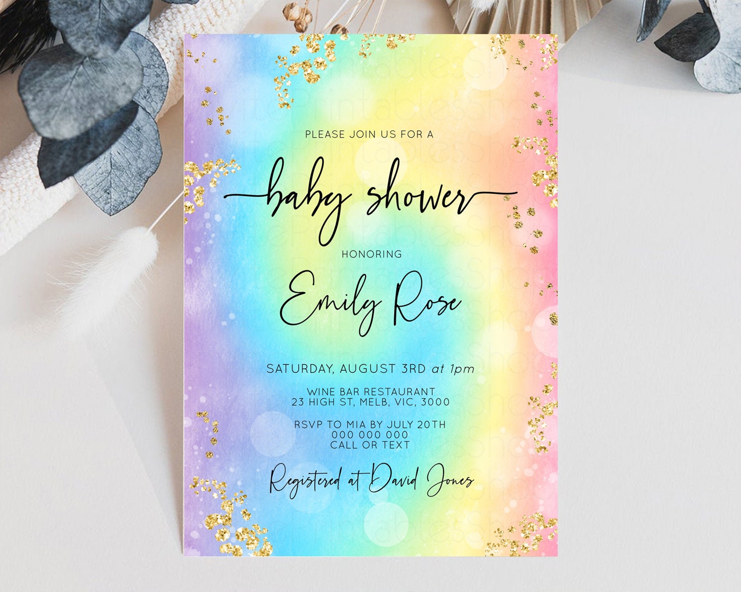 Rainbow Baby Shower Invitation Watercolor Pastel Invitation Colorful Splash Baby Invite Gold Glitter Sprinkles Ombre Gender Reveal t571