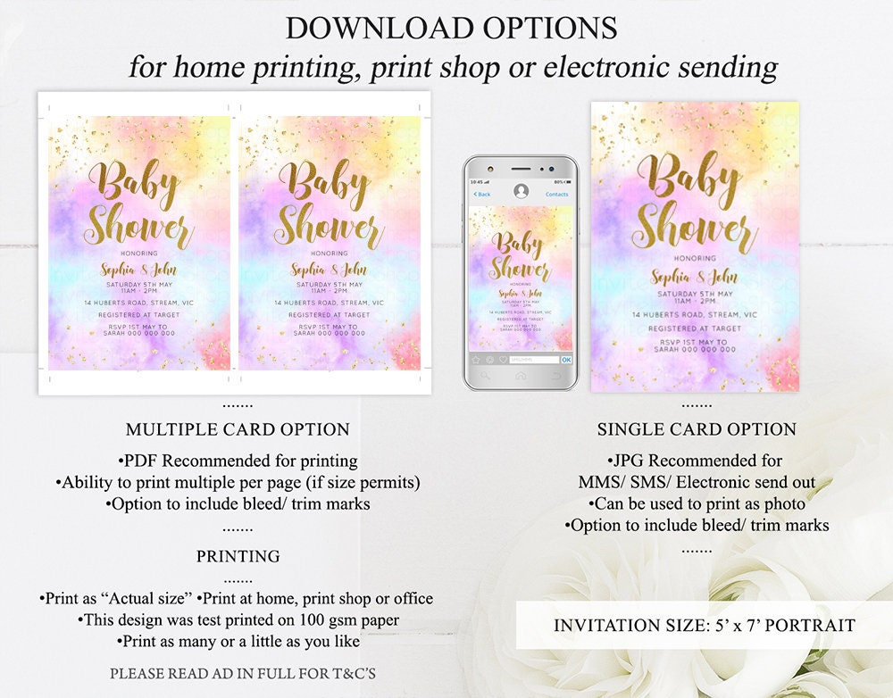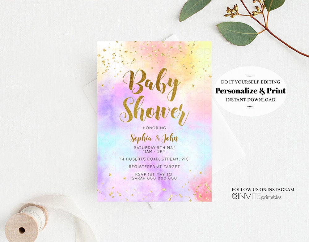Rainbow Baby Shower Invitation Watercolor Pastel Invitation Colorful Splash Baby Shower Invite Gold Glitter Sprinkles Ombre Invite D10435