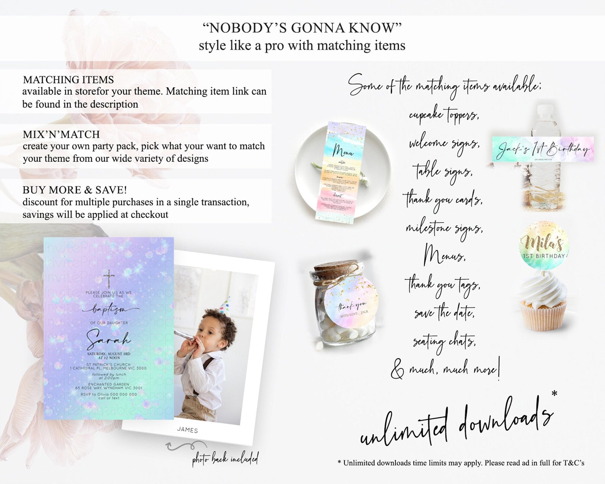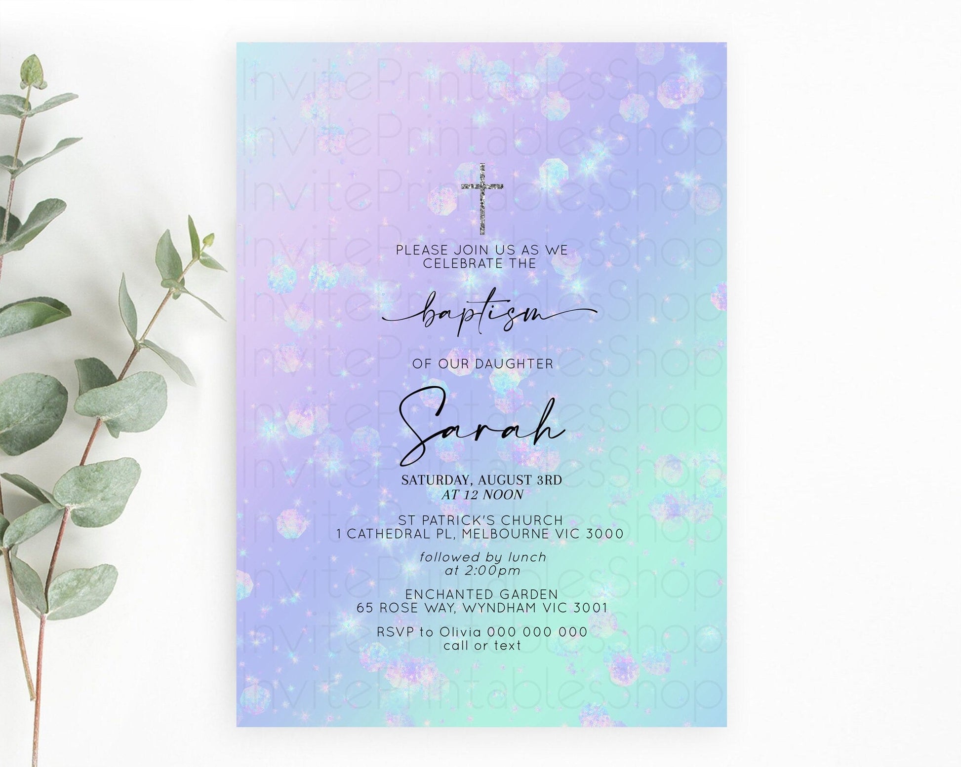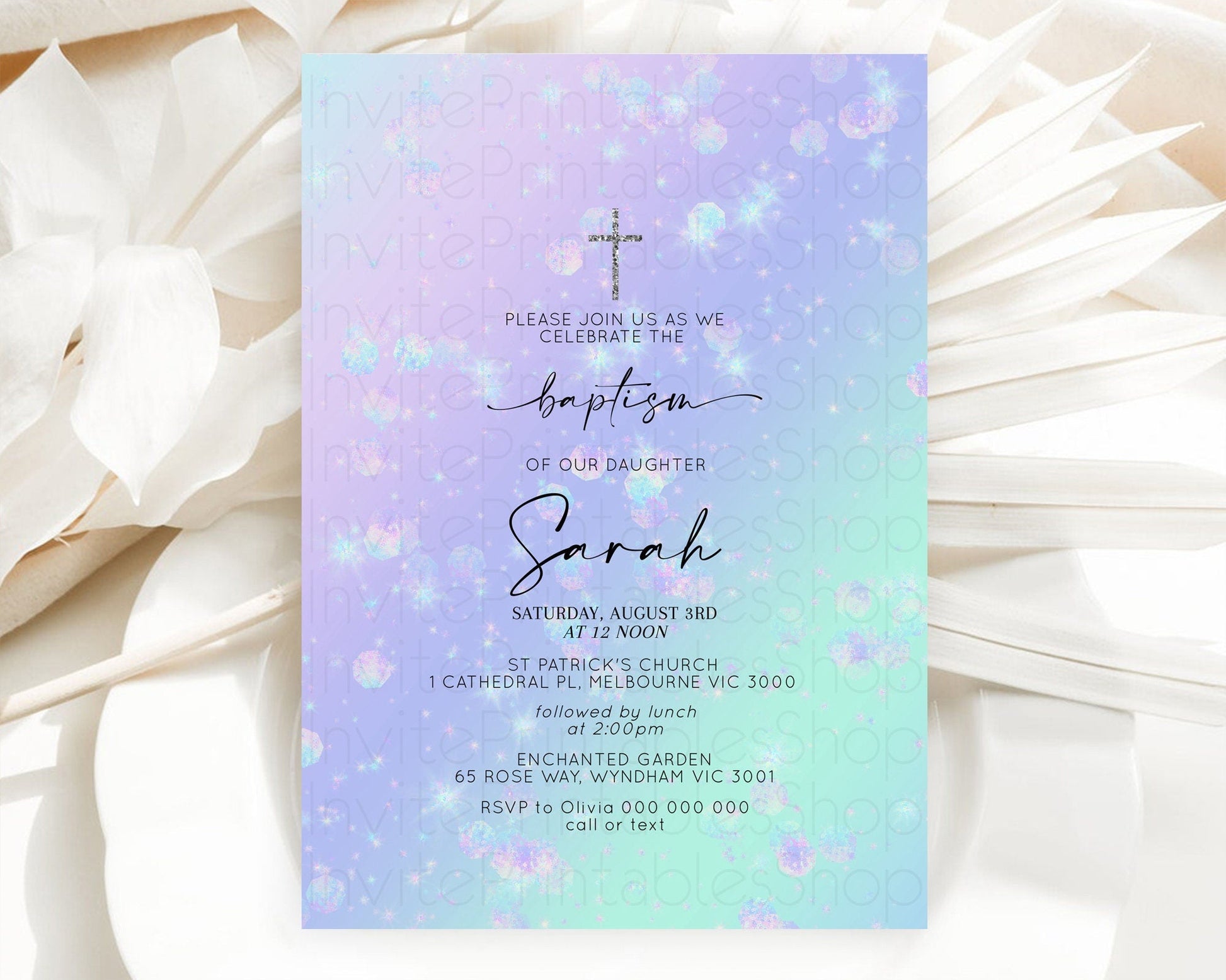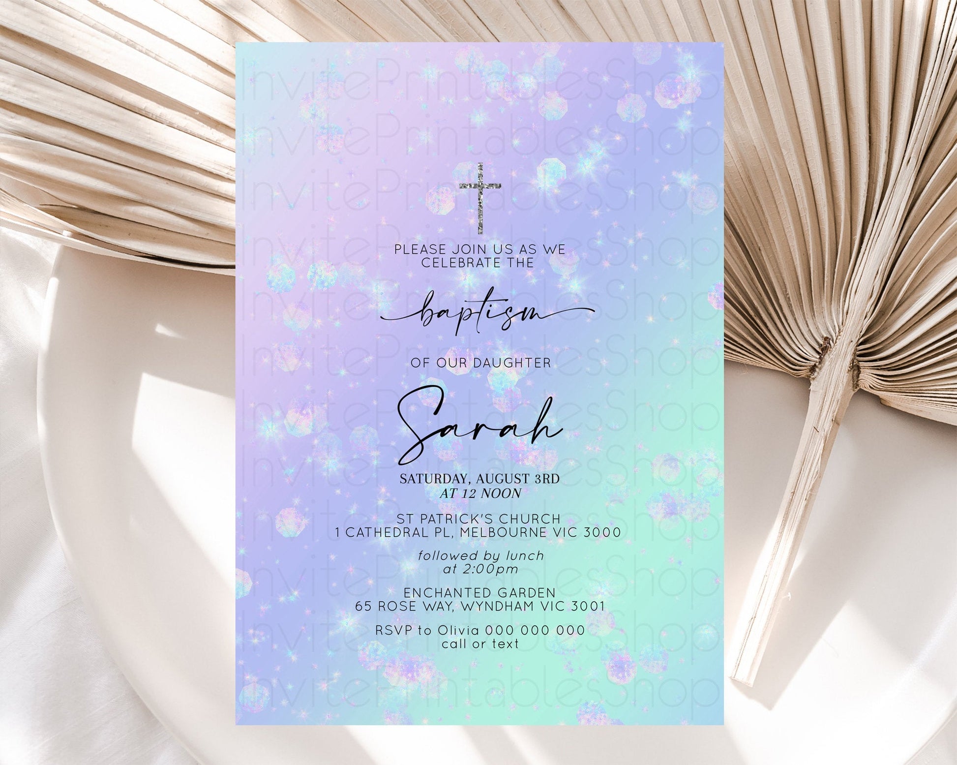 Rainbow Baptism Invitation Colorful Pastel Watercolor Baptism 1st Birthday Invitation Iridescent Glitter Sprinkles Ombre Christening D10663