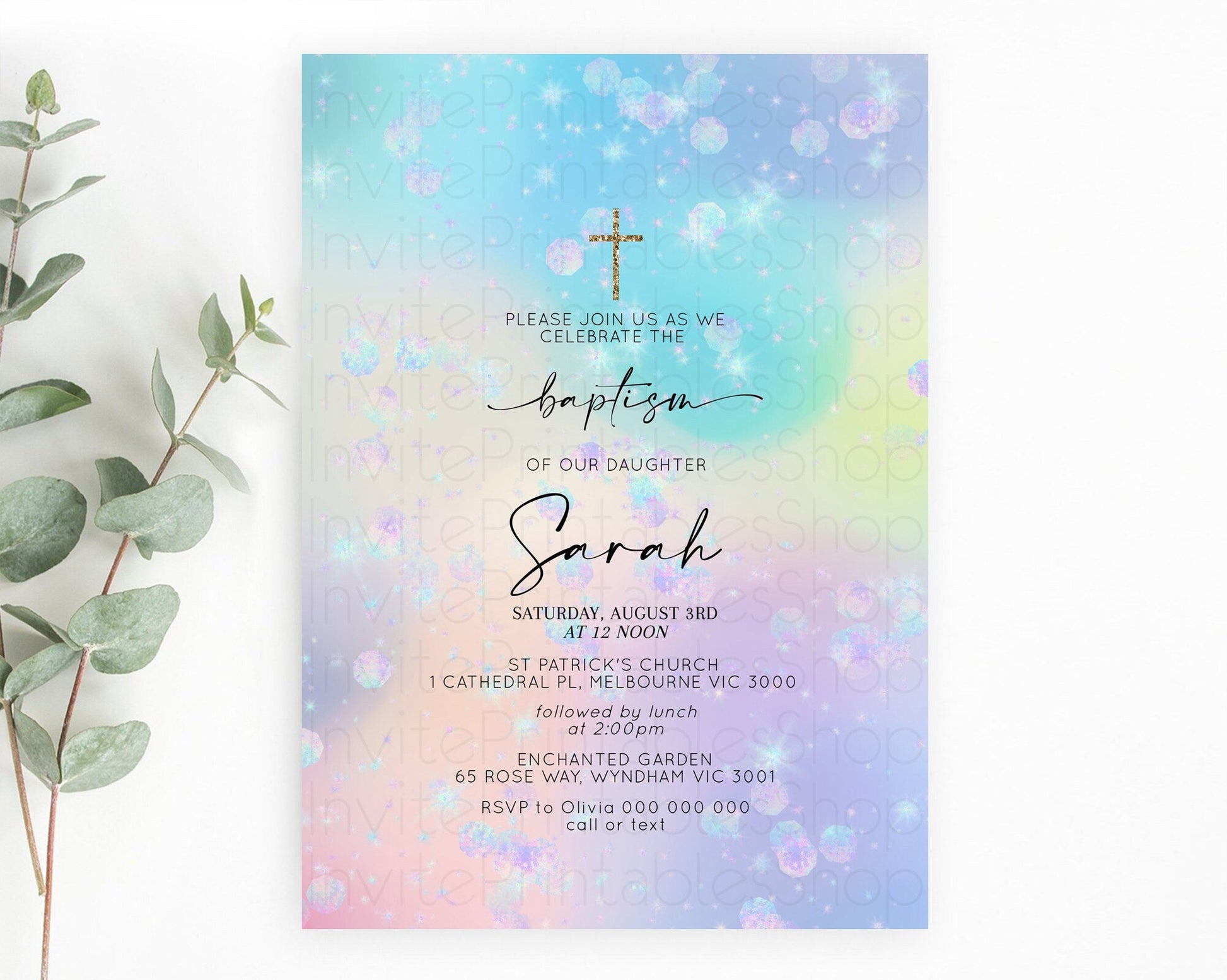 Rainbow Baptism Invitation Colorful Pastel Watercolor Baptism 1st Birthday Invitation Iridescent Glitter Sprinkles Ombre Christening D10665