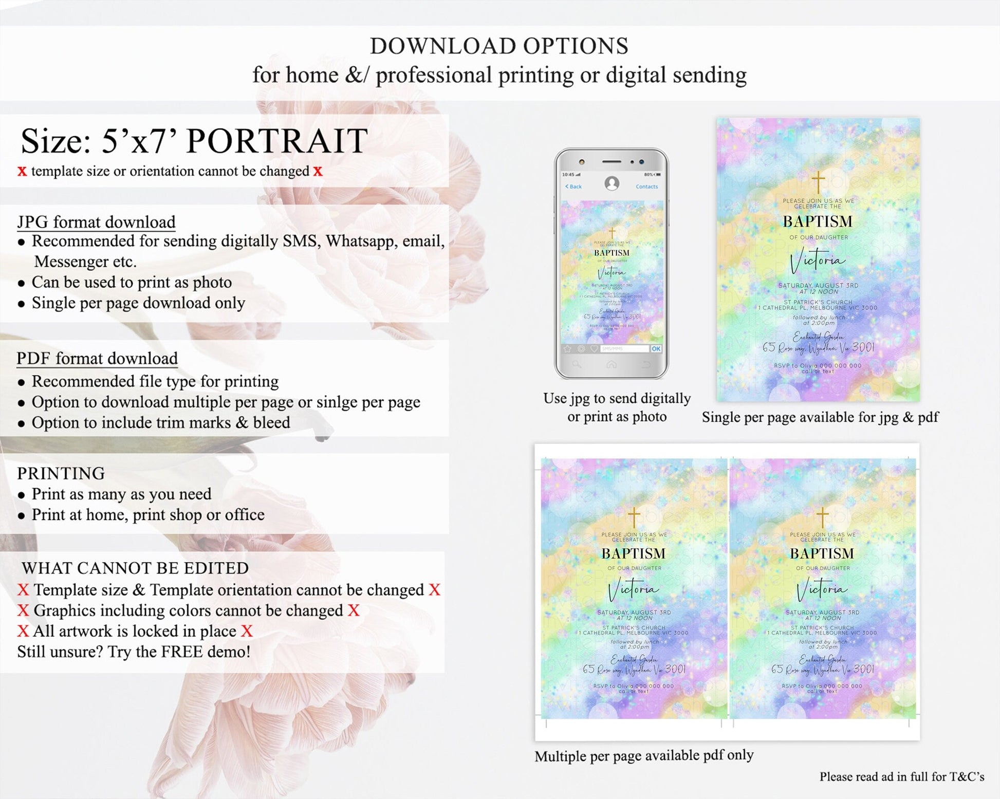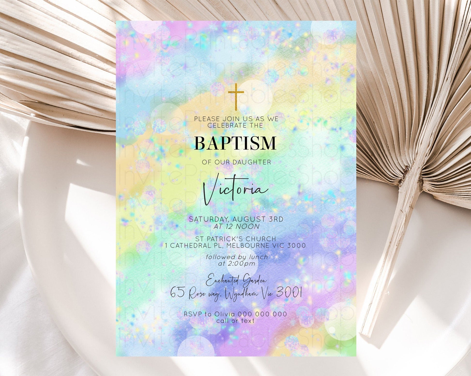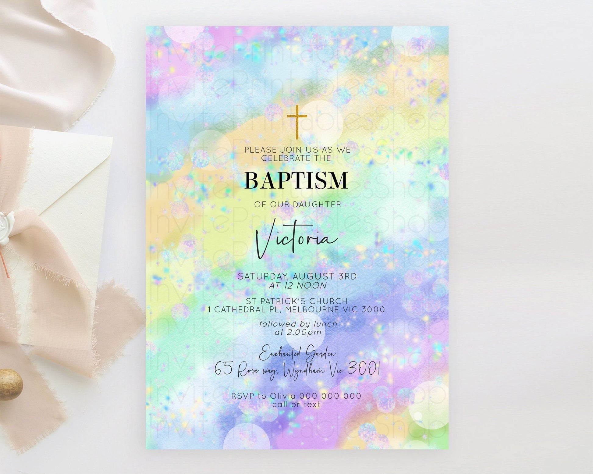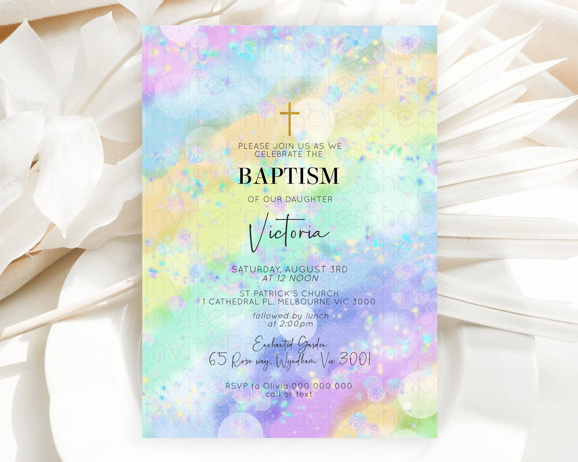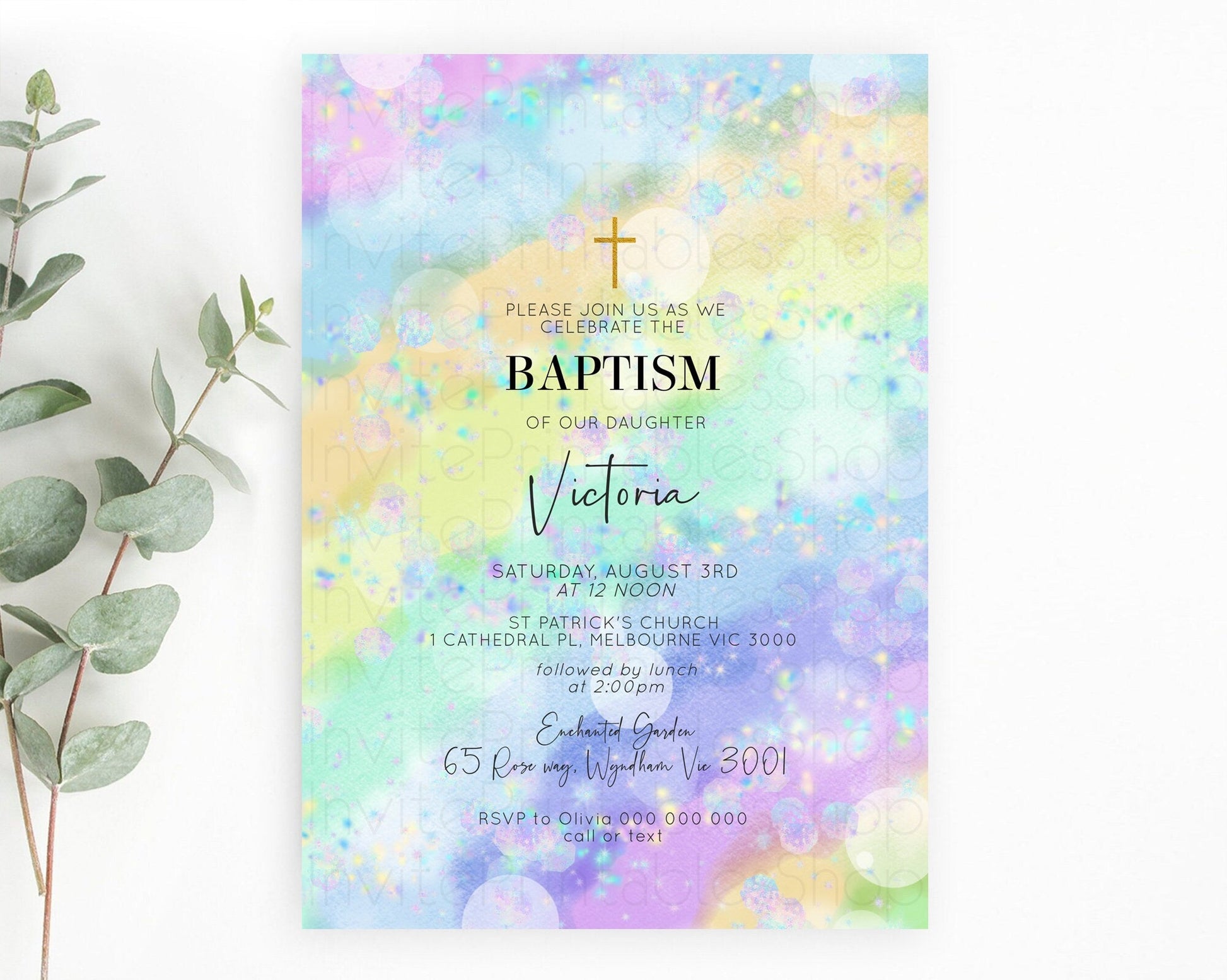 Rainbow Baptism Invitation Colorful Pastel Watercolor Baptism 1st Birthday Invitation Iridescent Glitter Sprinkles Ombre Christening D10689