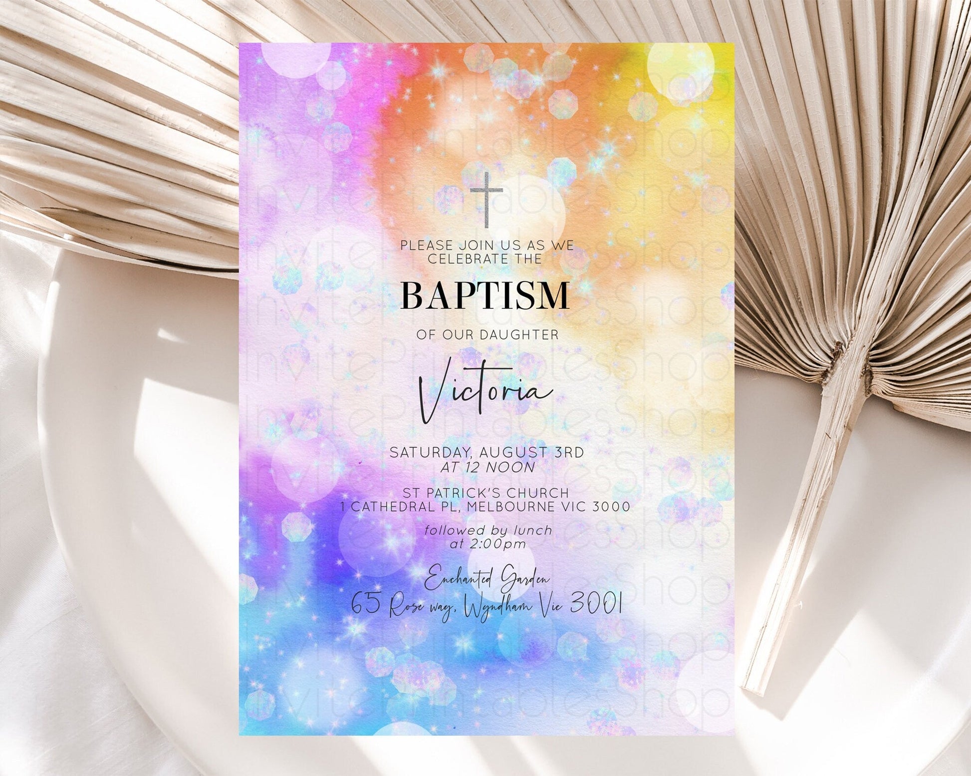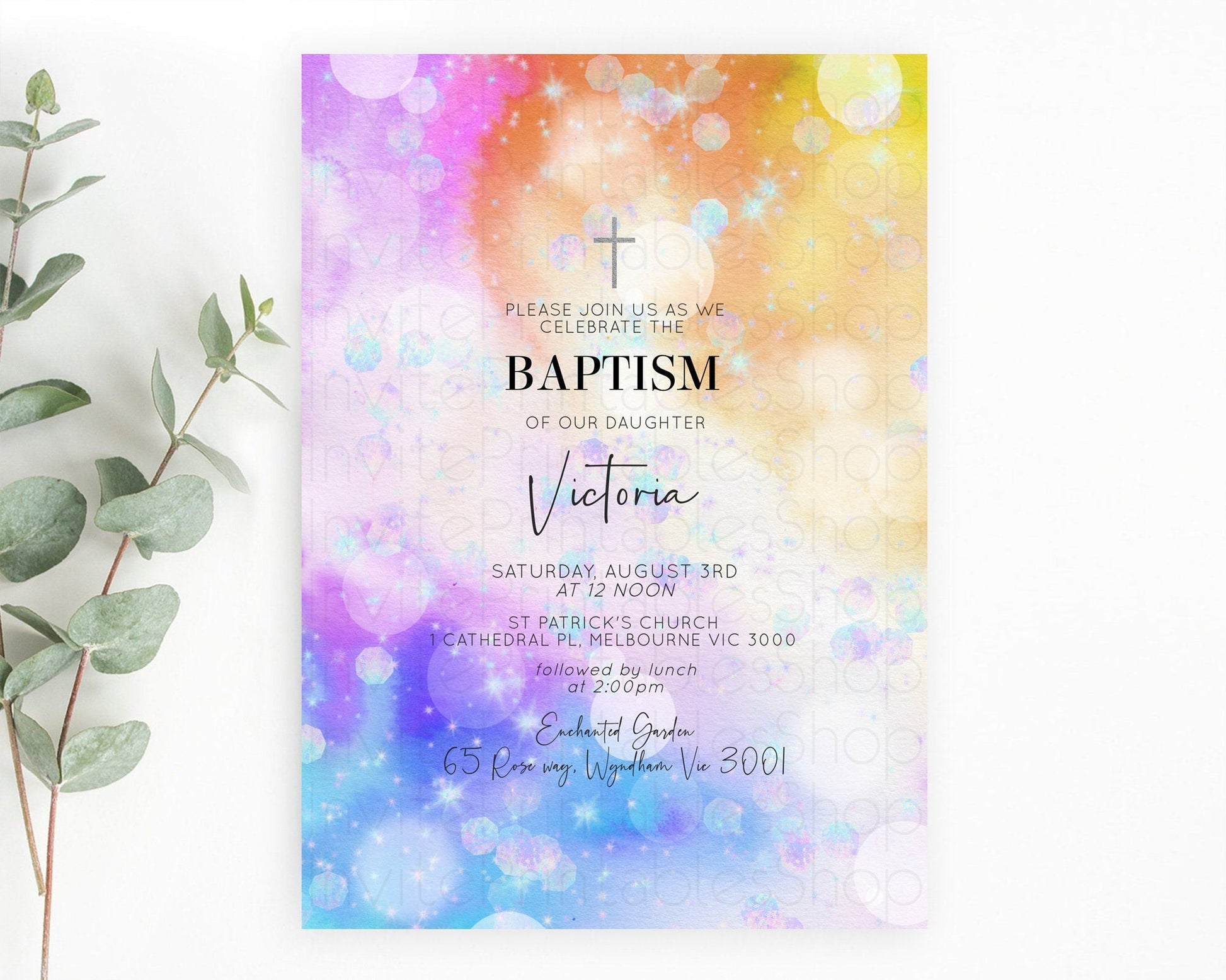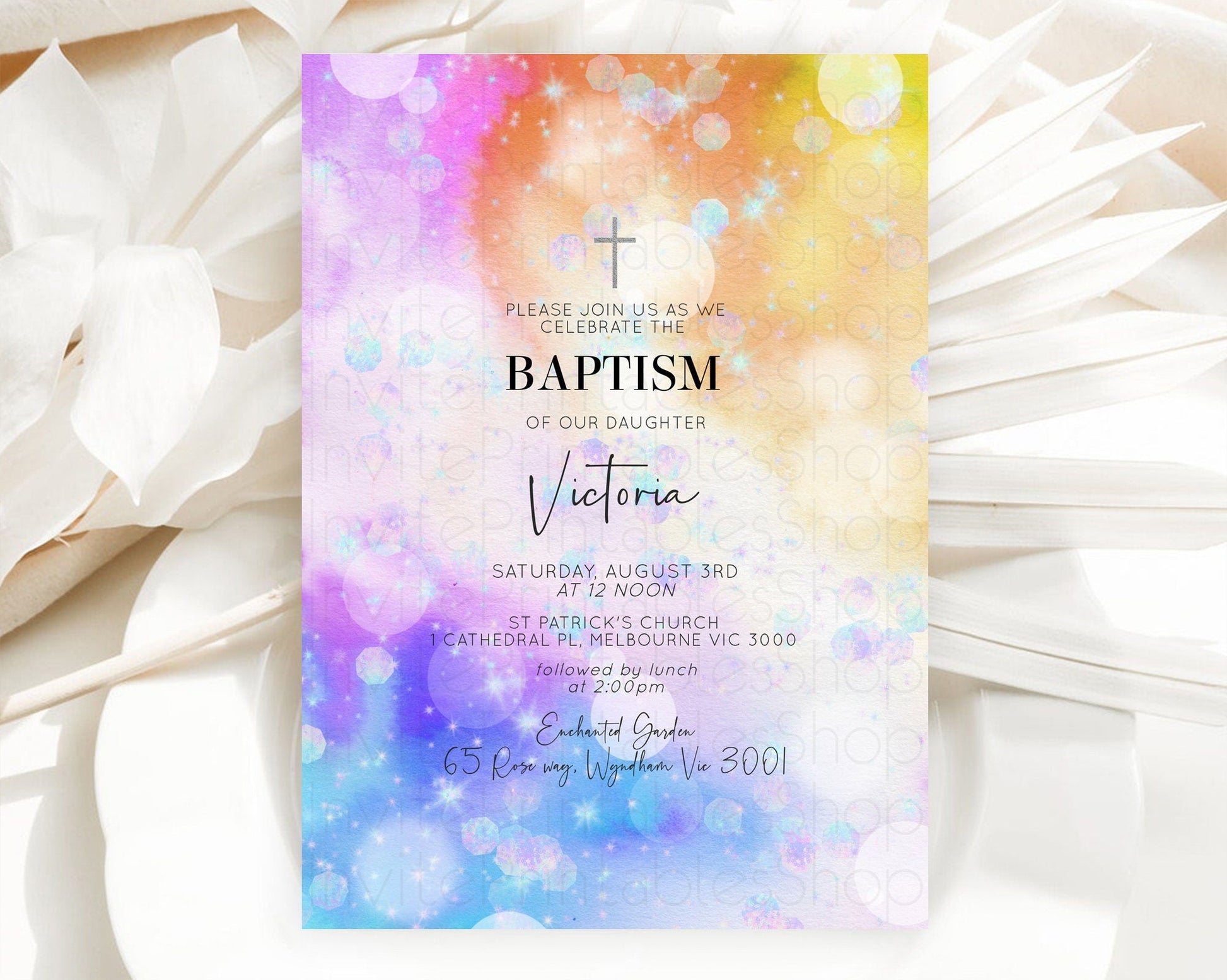 Rainbow Baptism Invitation Colorful Pastel Watercolor Baptism 1st Birthday Invitation Iridescent Glitter Sprinkles Ombre Christening D10690