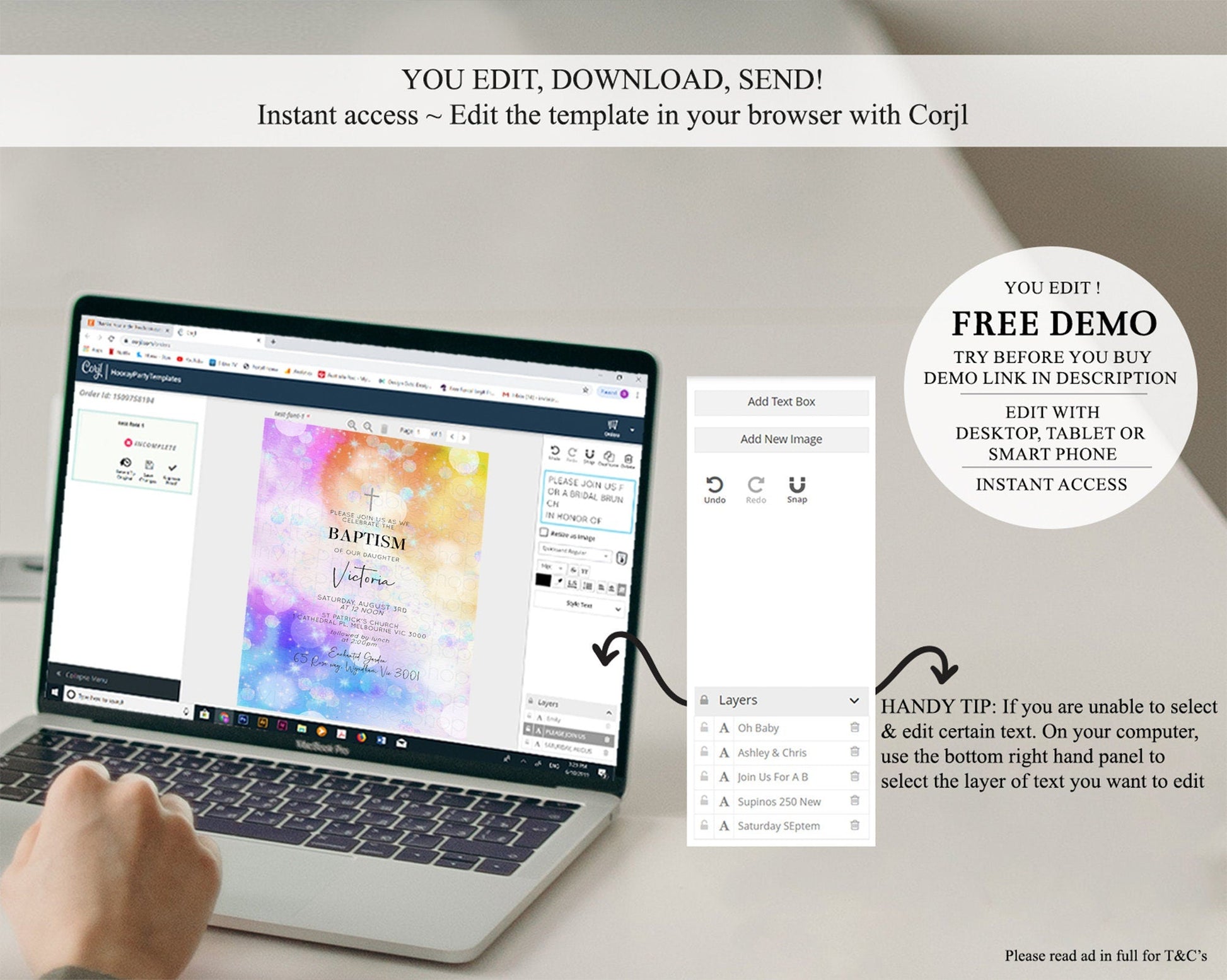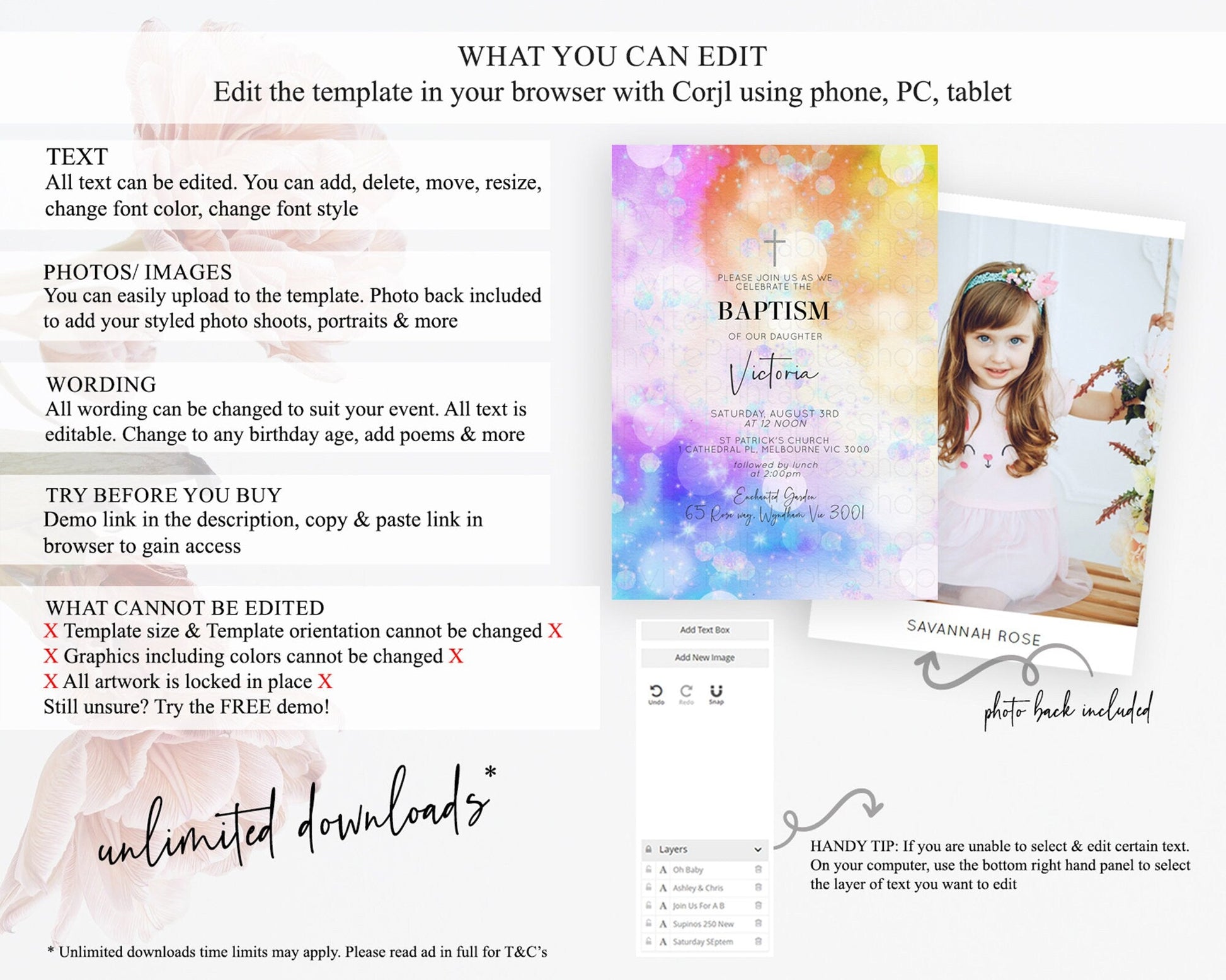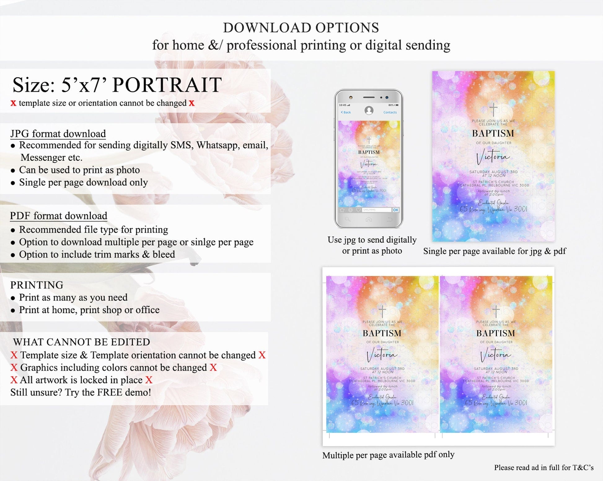 Rainbow Baptism Invitation Colorful Pastel Watercolor Baptism 1st Birthday Invitation Iridescent Glitter Sprinkles Ombre Christening D10690