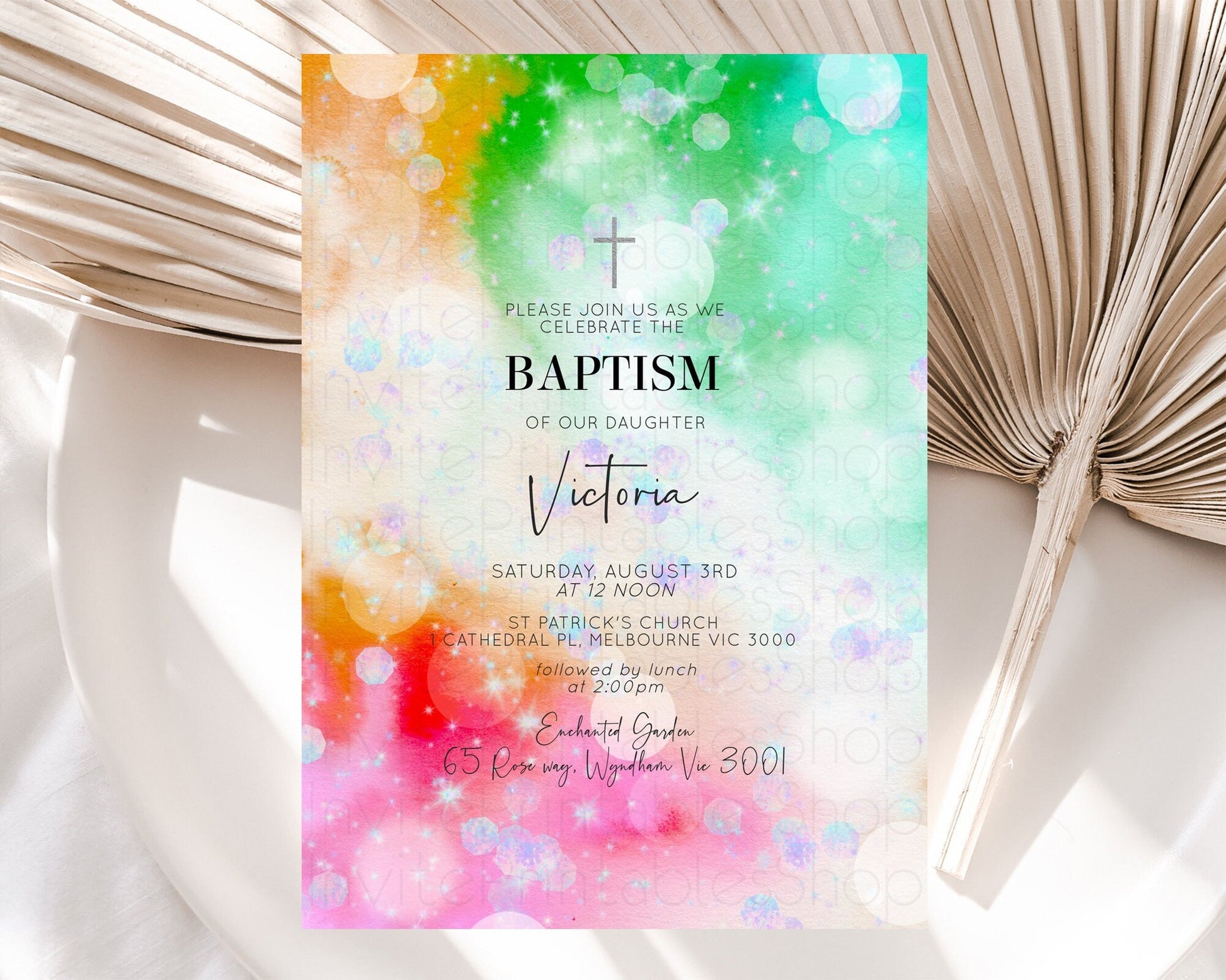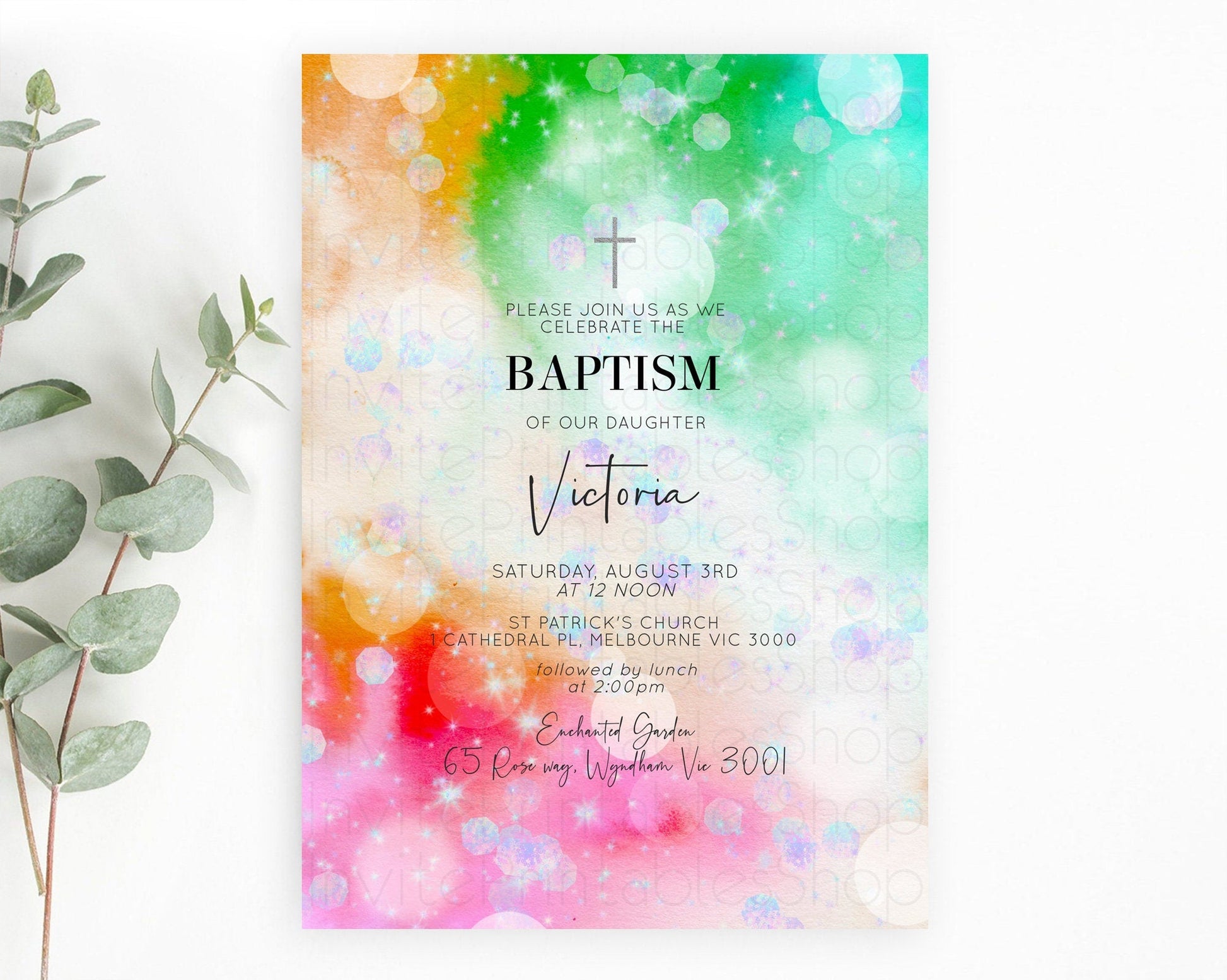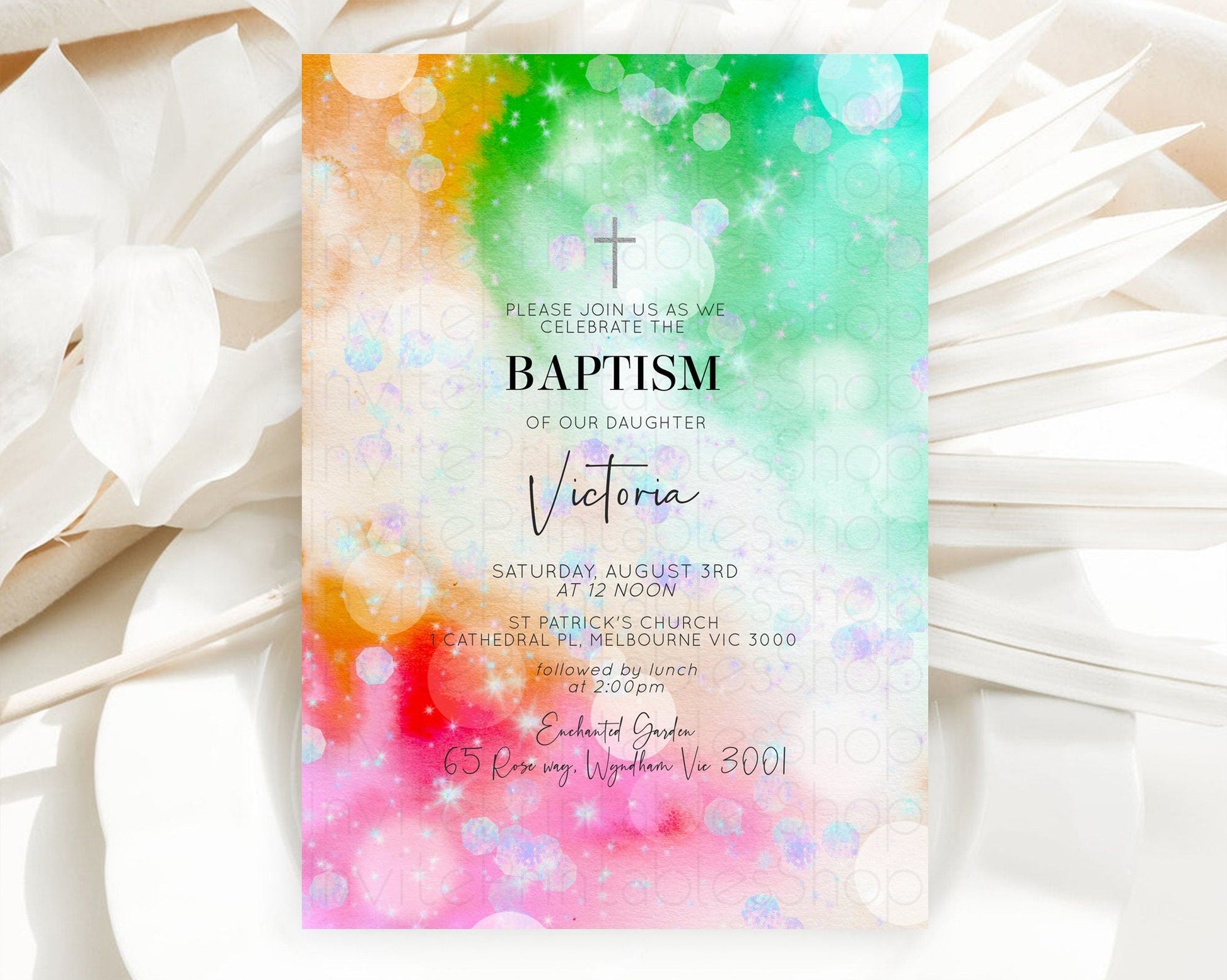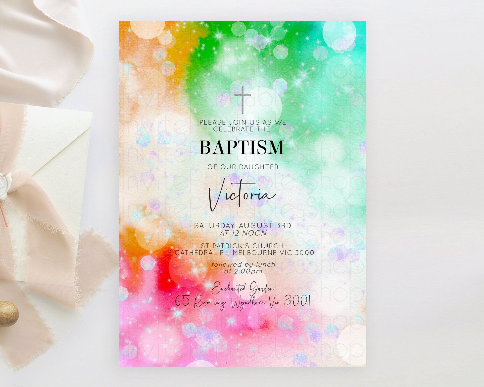 Rainbow Baptism Invitation Colorful Pastel Watercolor Baptism 1st Birthday Invitation Iridescent Glitter Sprinkles Ombre Christening D10691