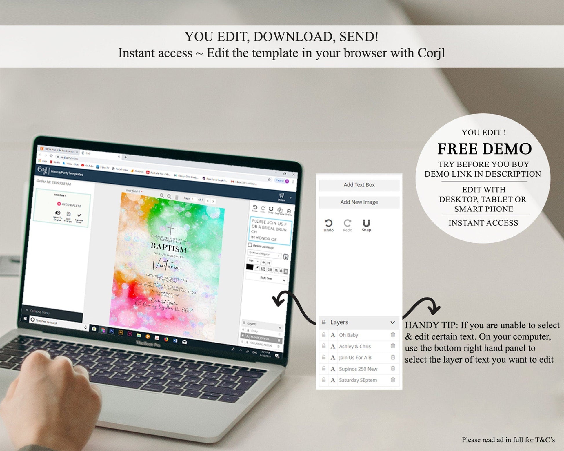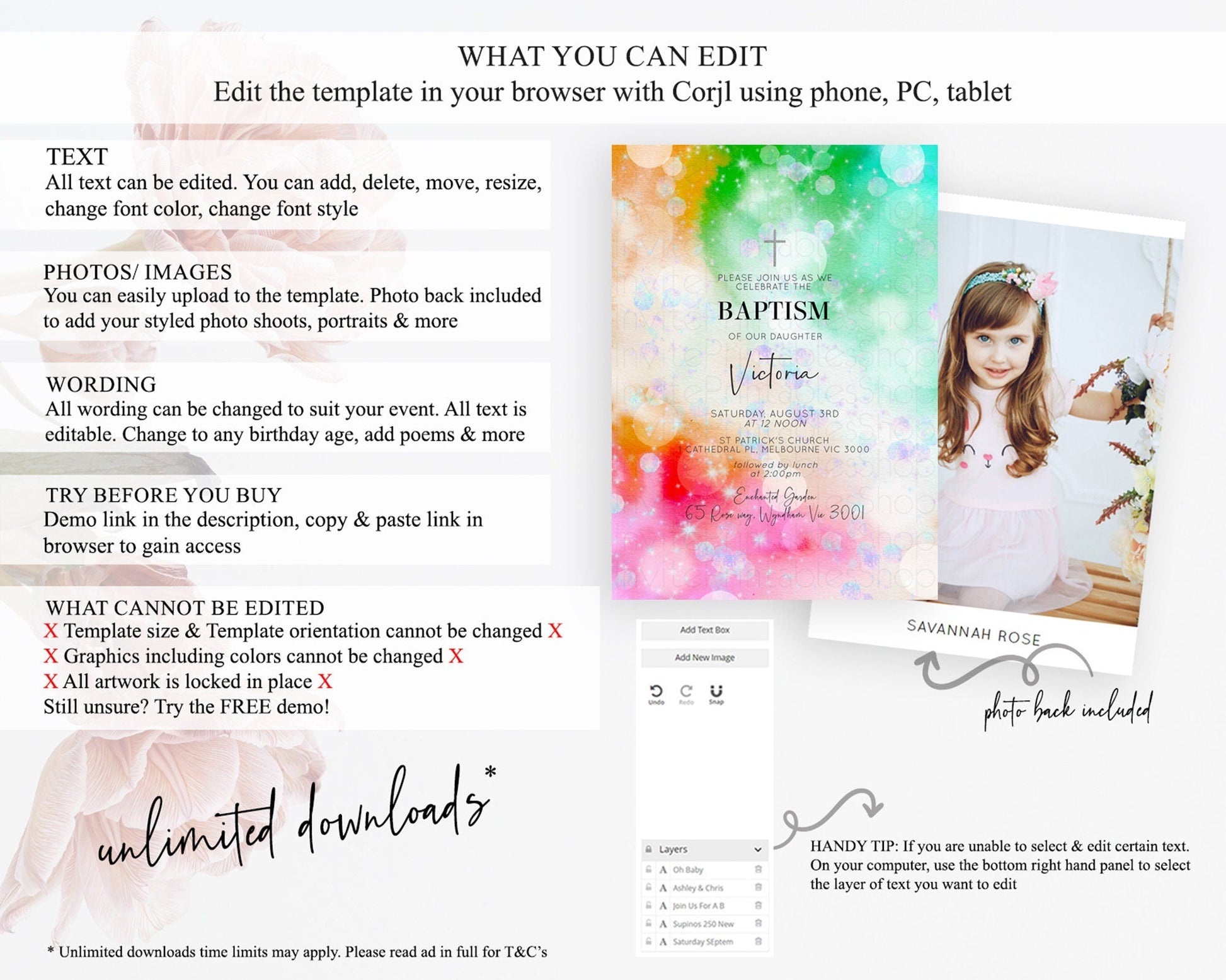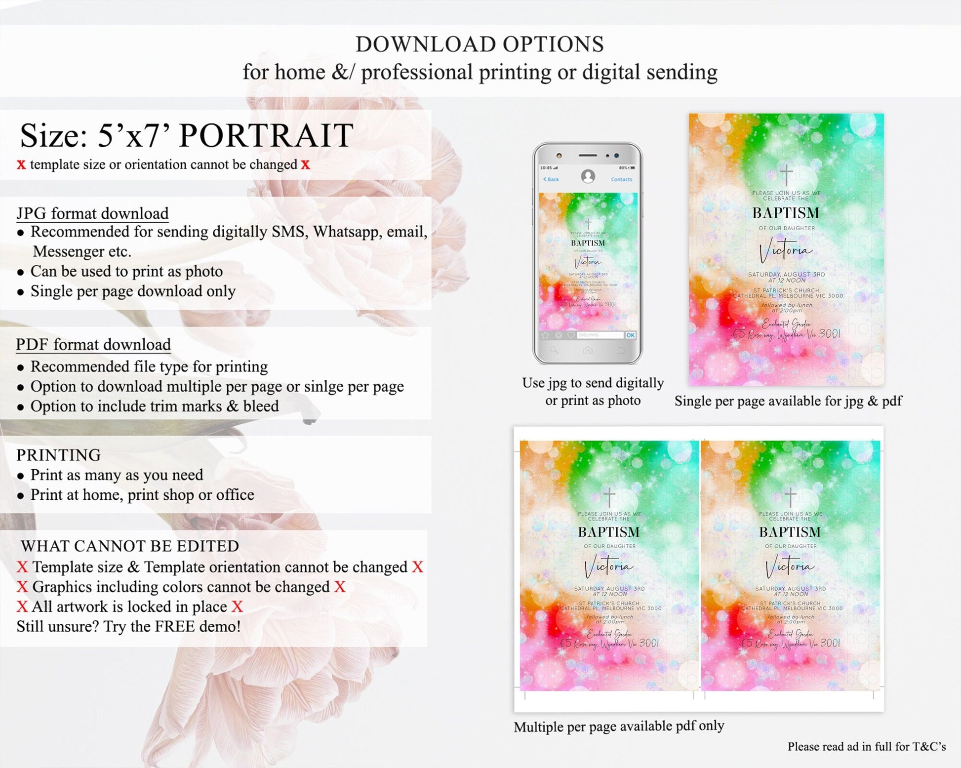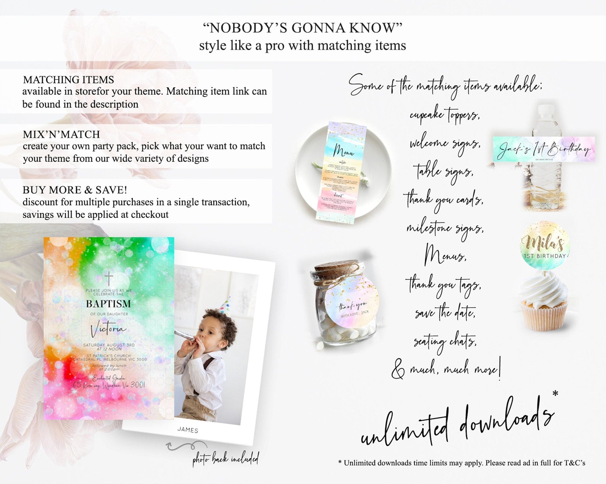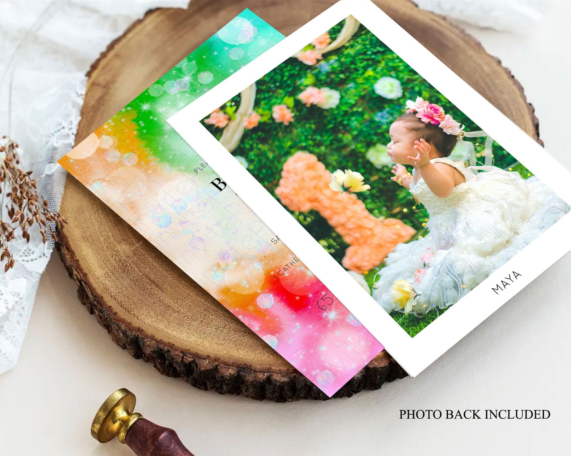 Rainbow Baptism Invitation Colorful Pastel Watercolor Baptism 1st Birthday Invitation Iridescent Glitter Sprinkles Ombre Christening D10691