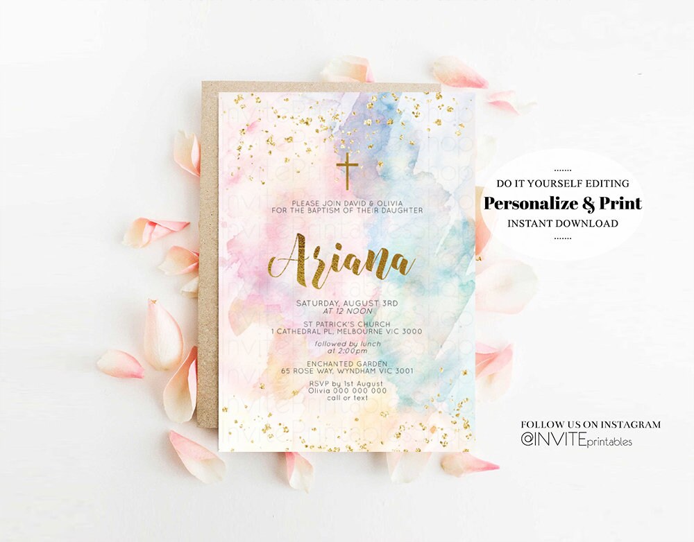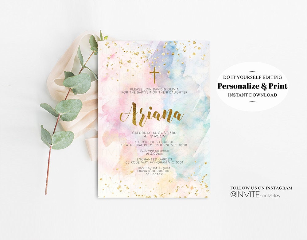 Rainbow Baptism Invitation Colorful Watercolor Christening Invitation Pastel Invite Splash Gold Splatter Foil Communion Orthodox Cross 276
