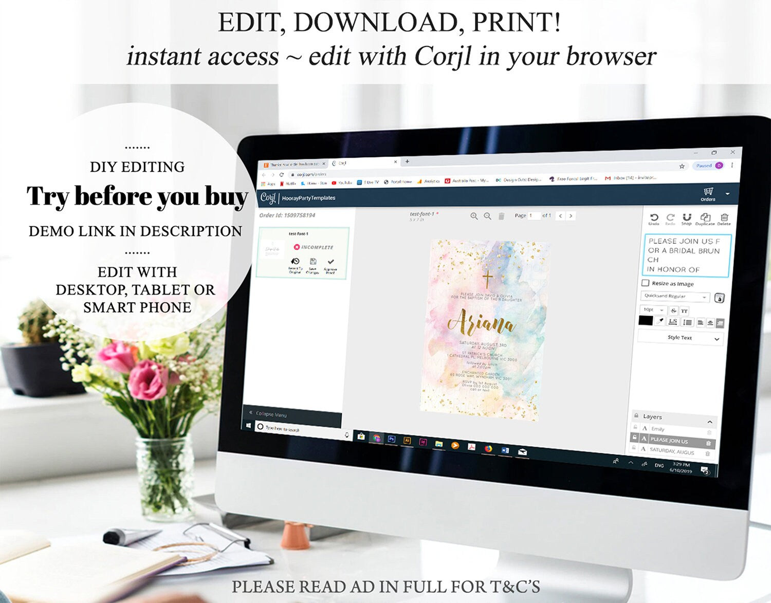 •Try before you buy! • DEMO LINK- https://www.corjl.com/d/341F8F MATCHING ITEMS: https://etsy.me/3llNMkz PLEASE READ AD IN FULL!! •Digital file. No physical item will be shipped •Do it yourself Editing. Edit online with Corjl or Edit with your mobile ITEM DETAILS Invitation size: 5’x7’ File type: PDF, JPEG Resolution: 300DPI PDF FILE OPTIONS: •Recommended for printing •Ability to print multiple per page (if size permits) •Option to include bleed/ trim marks JPG FILE OPTIONS: •Recommended for MMS/ SMS/ Electronic send out •Can be used to print as photo •Option to include bleed/ trim marks EDITING • Do it yourself editing • Mobile editing is available • Google chrome is the recommend browser for Corjl. Please download here for FREE: https://www.google.com/chrome/ • Using other browsers may not show all of Corjl's editing features • Editing on a desktop/ laptop computer is recommended to access all of Corjl features • Mobile editing is available, please use a desktop/ laptop computer to access all of Corjl features DOWNLOADS & EXPIRY •Maximum 3 downloads on the same edit •Link expires 30 days after purchase DOWNLOAD NOTICE •Once you have reached your download limits &/ “approve proof” in Corjl. You will not be able to request further downloads on your design. Further download requests are not permitted WHAT IS EDITABLE •Text - colours, fonts, size, move, delete & rotation. •Please see demo link for what you can and can’t do WHAT YOU CAN’T EDIT •Template size •Template orientation •Graphics CAN NOT BE deleted, moved, or changed in colour •Please see demo link for what you can and can’t do HOW TO 1. Choose design template & checkout on Etsy. 2. Email will be sent from Corjl. Follow link to access template 3. Edit, save & print INSTRUCTIONS •Instructions on how to edit your design have been written by Corjl and will be available with your purchase. PRINTING •Colours can vary depending on the monitor, printer & cardstock •Can be printed at home •Home printing will require you to select the high quality print settings, select appropriate paper thickness & click "Actual size" prior to you printing •This design was test printed on 100 gsm paper •Can be printed at local print shop. Please check printing requirements & any printing restrictions prior to purchase PERSONAL USE ONLY. This item cannot be shared, re-sold, or used commercially for profit. REFUND POLICY •We are unable to provide a refund/ exchange on commenced & completed work, instant downloads or self-editing link templates. Please use the demo link to work out if this product is right for you. Copyright © 2018 by InvitePrintablesShop PTY LTD All rights reserved. This file or any portion thereof may not be reproduced or resold without the express written permission of the publisher (including edits to the design). Our files are provided as high-resolution PDFs – the end result is dependent upon the printer and paper used. If using a professional printing company, InvitePrintablesShop are not responsible for their specific printing requirements, paper or colour quality. Any changes required to the template are not included with your purchase – the files come as described in the listing only and cannot be changed. Thank you for visiting Invite Printables Shop:)