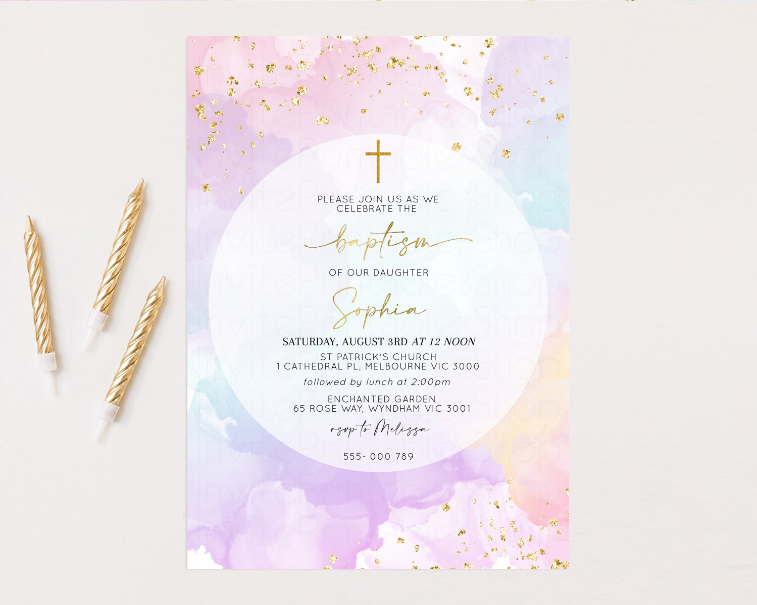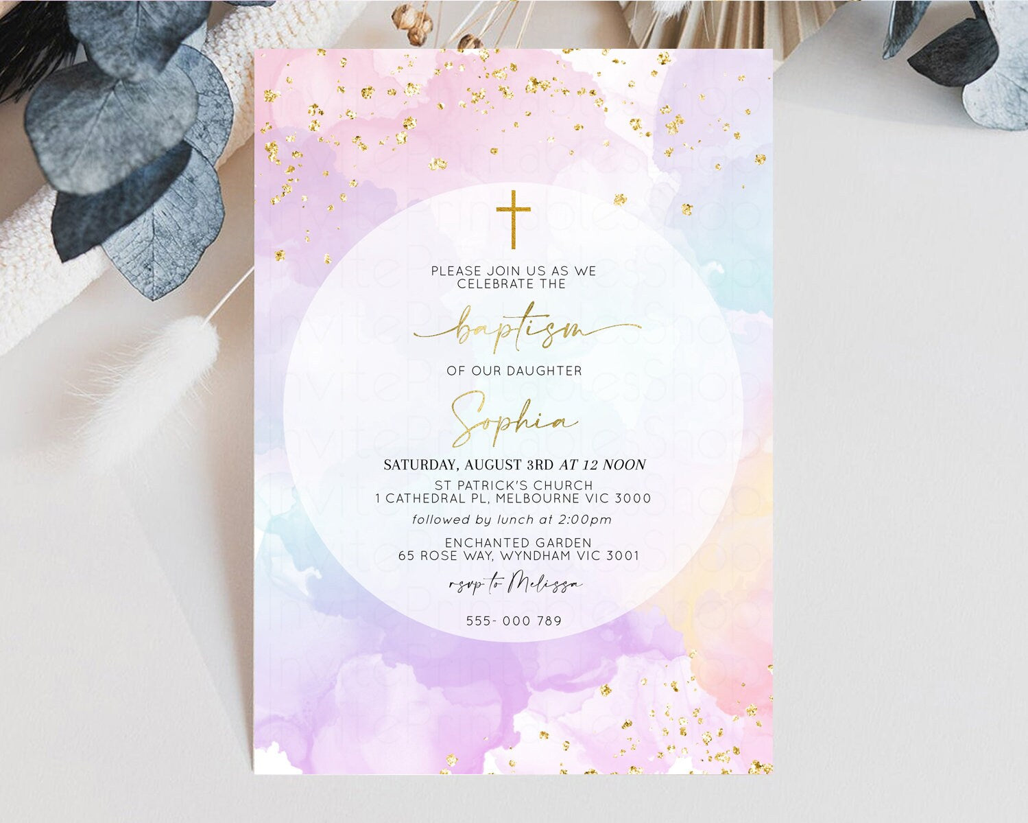 Rainbow Baptism Invitation Pastel Christening Invitation Holy Communion Invitation Glitter Watercolor Splash Invitation Colorful 599v1