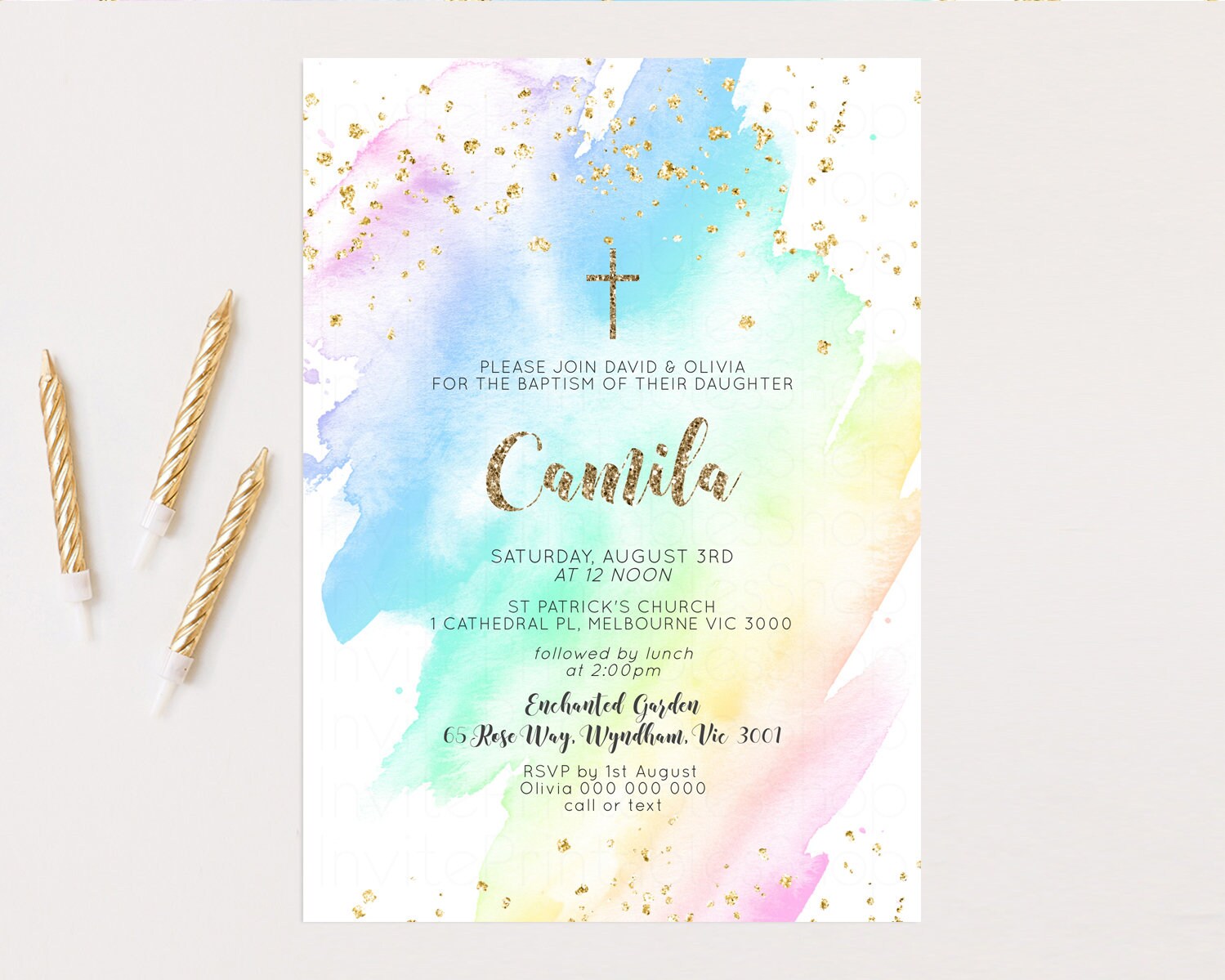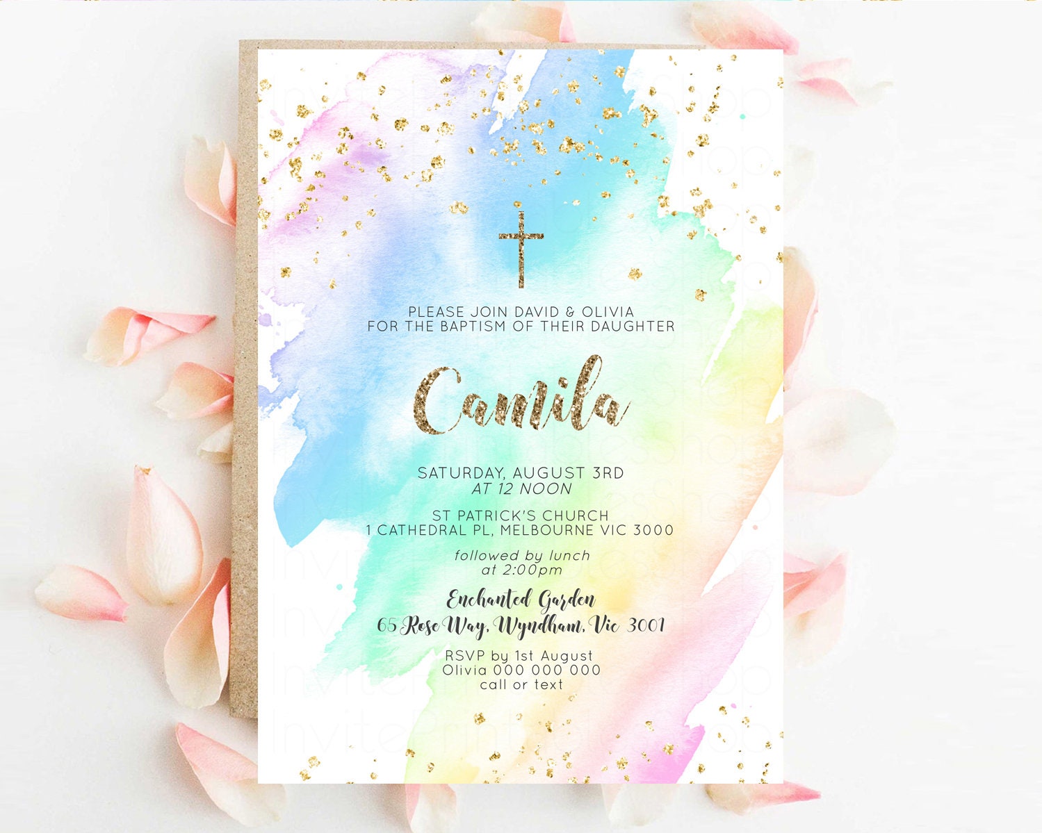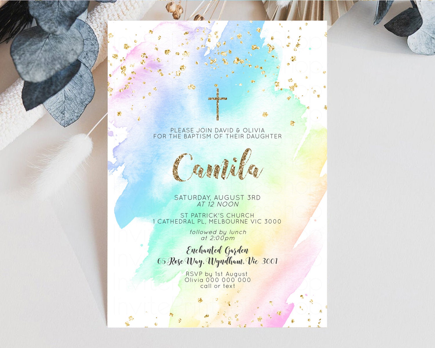 Rainbow Baptism Invitation Pastel Christening Invitation Holy Communion Invitation Glitter Watercolor Splash Invitation Colorful Invite g601
