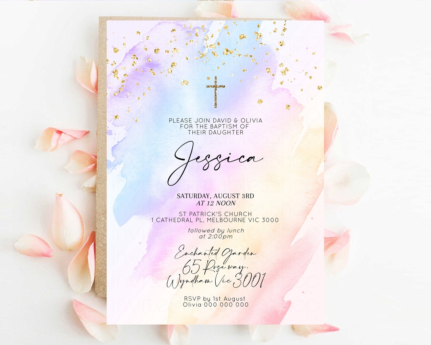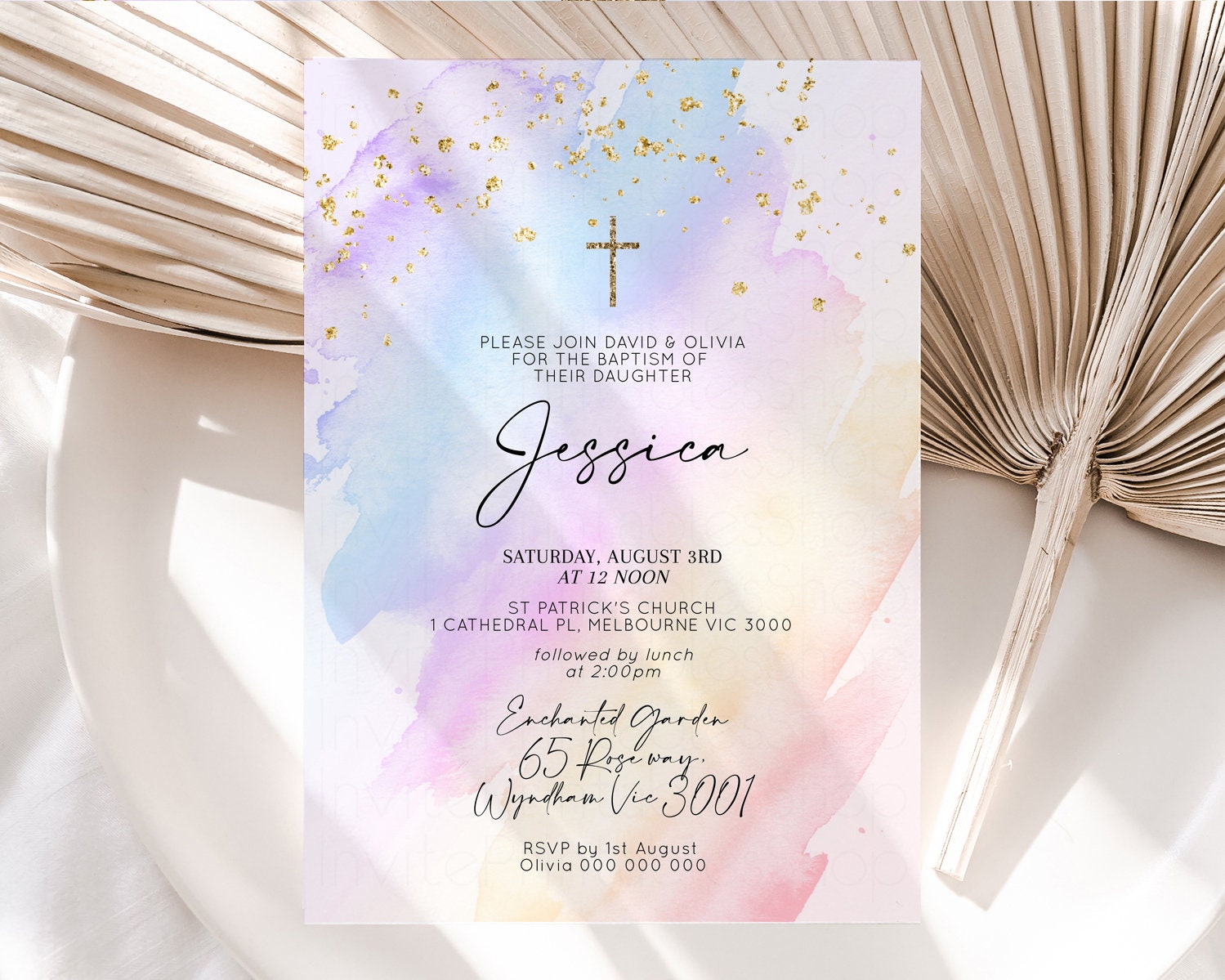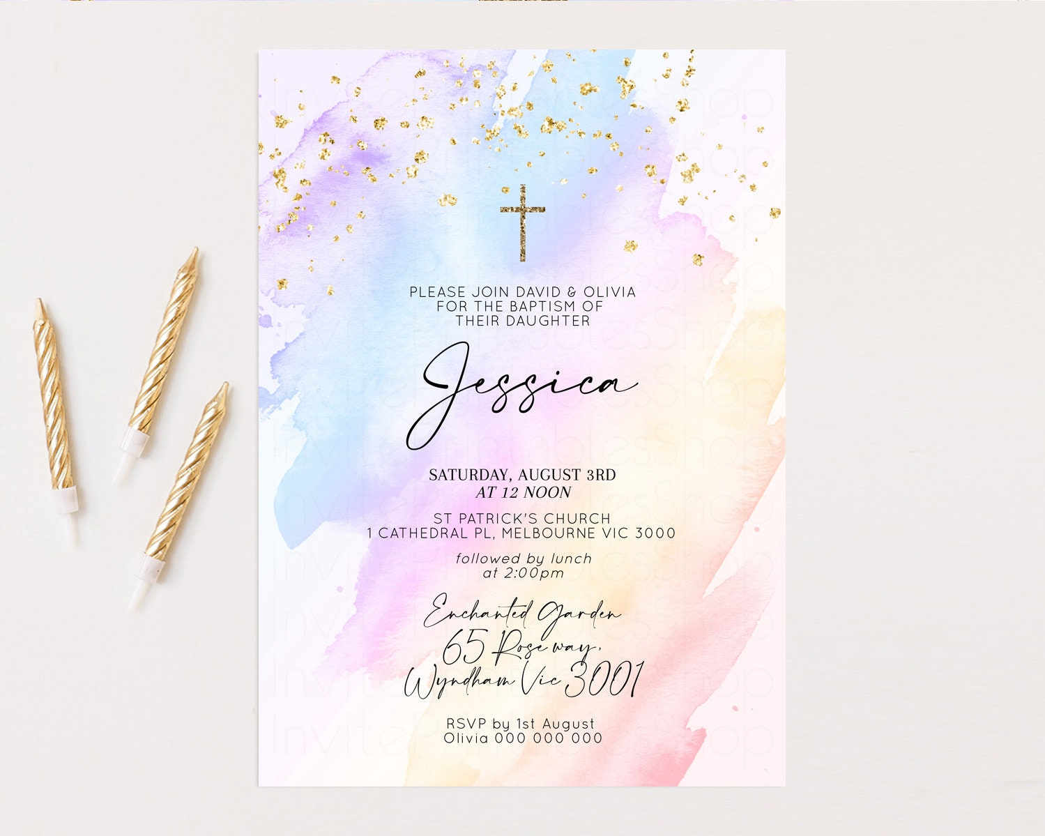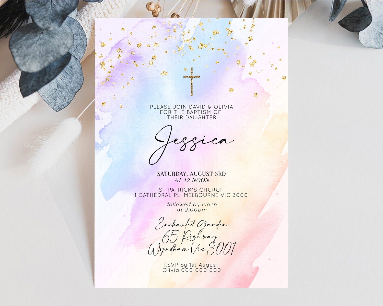 Rainbow Baptism Invitation Pastel Christening Invitation Holy Communion Invitation Glitter Watercolor Splash Invitation Colorful Invite t600