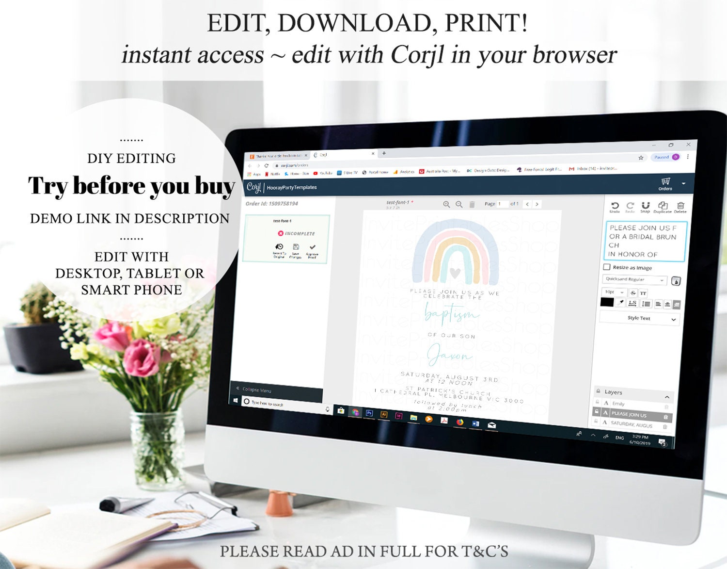 •Try before you buy! • DEMO LINK- https://www.corjl.com/d/GO2IE Matching Items: https://etsy.me/3mQa4Nv PLEASE READ AD IN FULL!! •Digital file. No physical item will be shipped •Do it yourself Editing. Edit online with Corjl or Edit with your mobile ITEM DETAILS Invitation size: 5’x7’ File type: PDF, JPEG Resolution: 300DPI PDF FILE OPTIONS: •Recommended for printing •Ability to print multiple per page (if size permits) •Option to include bleed/ trim marks JPG FILE OPTIONS: •Recommended for MMS/ SMS/ Electronic send out •Can be used to print as photo •Option to include bleed/ trim marks EDITING • Do it yourself editing • Mobile editing is available • Google chrome is the recommend browser for Corjl. Please download here for FREE: https://www.google.com/chrome/ • Using other browsers may not show all of Corjl's editing features • Editing on a desktop/ laptop computer is recommended to access all of Corjl features • Mobile editing is available, please use a desktop/ laptop computer to access all of Corjl features DOWNLOADS & EXPIRY •Maximum 3 downloads on the same edit •Link expires 30 days after purchase DOWNLOAD NOTICE •Once you have reached your download limits &/ “approve proof” in Corjl. You will not be able to request further downloads on your design. Further download requests are not permitted WHAT IS EDITABLE •Text - colours, fonts, size, move, delete & rotation. •Please see demo link for what you can and can’t do WHAT YOU CAN’T EDIT •Template size •Template orientation •Graphics CAN NOT BE deleted, moved, or changed in colour •Please see demo link for what you can and can’t do HOW TO 1. Choose design template & checkout on Etsy. 2. Email will be sent from Corjl. Follow link to access template 3. Edit, save & print INSTRUCTIONS •Instructions on how to edit your design have been written by Corjl and will be available with your purchase. PRINTING •Colours can vary depending on the monitor, printer & cardstock •Can be printed at home •Home printing will require you to select the high quality print settings, select appropriate paper thickness & click "Actual size" prior to you printing •This design was test printed on 100 gsm paper •Can be printed at local print shop. Please check printing requirements & any printing restrictions prior to purchase PERSONAL USE ONLY. This item cannot be shared, re-sold, or used commercially for profit. REFUND POLICY •We are unable to provide a refund/ exchange on commenced & completed work, instant downloads or self-editing link templates. Please use the demo link to work out if this product is right for you. Copyright © 2018 by InvitePrintablesShop PTY LTD All rights reserved. This file or any portion thereof may not be reproduced or resold without the express written permission of the publisher (including edits to the design). Our files are provided as high-resolution PDFs – the end result is dependent upon the printer and paper used. If using a professional printing company, InvitePrintablesShop are not responsible for their specific printing requirements, paper or colour quality. Any changes required to the template are not included with your purchase – the files come as described in the listing only and cannot be changed. Thank you for visiting Invite Printables Shop:)
