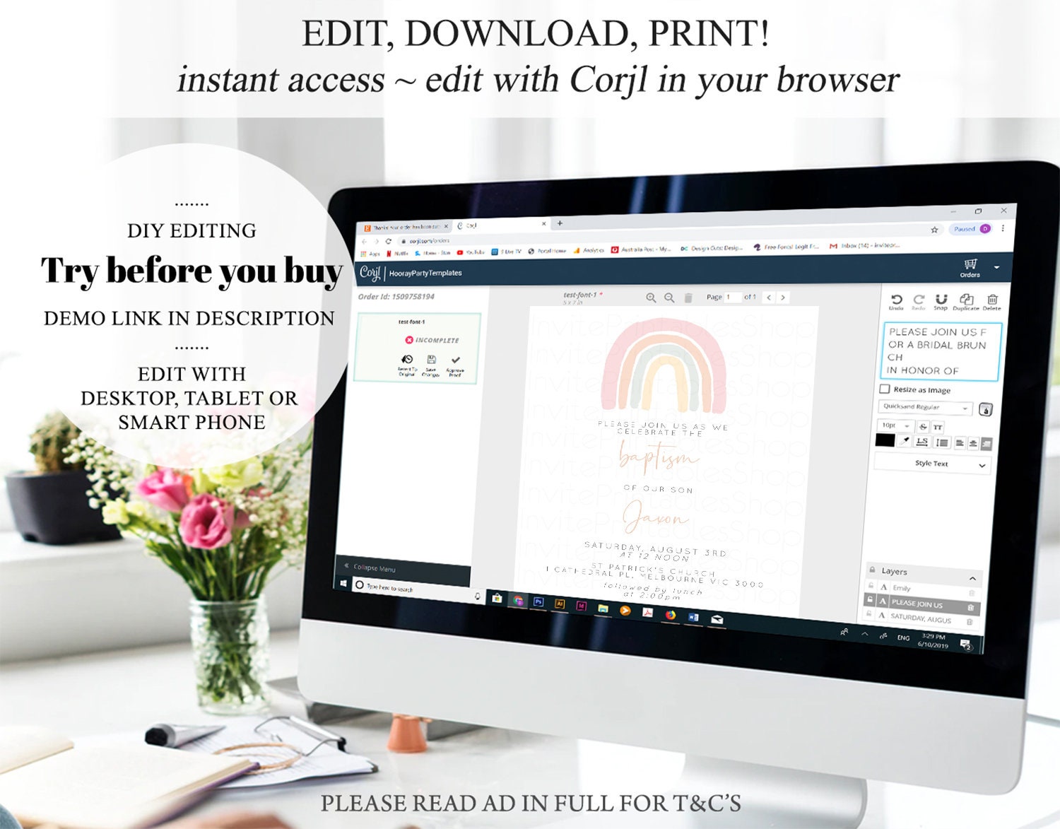 •Try before you buy! • DEMO LINK- https://www.corjl.com/d/1J95CL Matching items; https://etsy.me/3xlSKnp PLEASE READ AD IN FULL!! •Digital file. No physical item will be shipped •Do it yourself Editing. Edit online with Corjl or Edit with your mobile ITEM DETAILS Invitation size: 5’x7’ File type: PDF, JPEG Resolution: 300DPI PDF FILE OPTIONS: •Recommended for printing •Ability to print multiple per page (if size permits) •Option to include bleed/ trim marks JPG FILE OPTIONS: •Recommended for MMS/ SMS/ Electronic send out •Can be used to print as photo •Option to include bleed/ trim marks EDITING • Do it yourself editing • Mobile editing is available • Google chrome is the recommend browser for Corjl. Please download here for FREE: https://www.google.com/chrome/ • Using other browsers may not show all of Corjl's editing features • Editing on a desktop/ laptop computer is recommended to access all of Corjl features • Mobile editing is available, please use a desktop/ laptop computer to access all of Corjl features DOWNLOADS & EXPIRY •Maximum 3 downloads on the same edit •Link expires 60 days after purchase DOWNLOAD NOTICE •Once you have reached your download limits &/ “approve proof” in Corjl. You will not be able to request further downloads on your design. Further download requests are not permitted WHAT IS EDITABLE •Text - colours, fonts, size, move, delete & rotation. •Please see demo link for what you can and can’t do WHAT YOU CAN’T EDIT •Template size •Template orientation •Graphics CAN NOT BE deleted, moved, or changed in colour •Please see demo link for what you can and can’t do HOW TO 1. Choose design template & checkout on Etsy. 2. Email will be sent from Corjl. Follow link to access template 3. Edit, save & print INSTRUCTIONS •Instructions on how to edit your design have been written by Corjl and will be available with your purchase. PRINTING •Colours can vary depending on the monitor, printer & cardstock •Can be printed at home •Home printing will require you to select the high quality print settings, select appropriate paper thickness & click "Actual size" prior to you printing •This design was test printed on 100 gsm paper •Can be printed at local print shop. Please check printing requirements & any printing restrictions prior to purchase PERSONAL USE ONLY. This item cannot be shared, re-sold, or used commercially for profit. REFUND POLICY •We are unable to provide a refund/ exchange on commenced & completed work, instant downloads or self-editing link templates. Please use the demo link to work out if this product is right for you. Copyright © 2018 by InvitePrintablesShop PTY LTD All rights reserved. This file or any portion thereof may not be reproduced or resold without the express written permission of the publisher (including edits to the design). Our files are provided as high-resolution PDFs – the end result is dependent upon the printer and paper used. If using a professional printing company, InvitePrintablesShop are not responsible for their specific printing requirements, paper or colour quality. Any changes required to the template are not included with your purchase – the files come as described in the listing only and cannot be changed. Thank you for visiting Invite Printables Shop:)