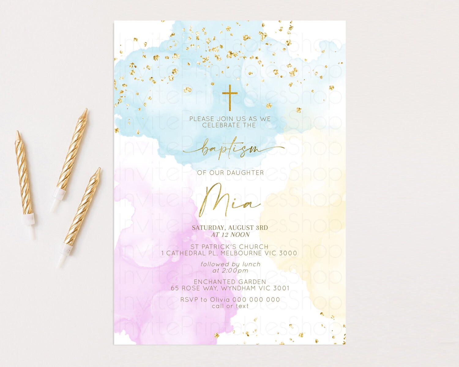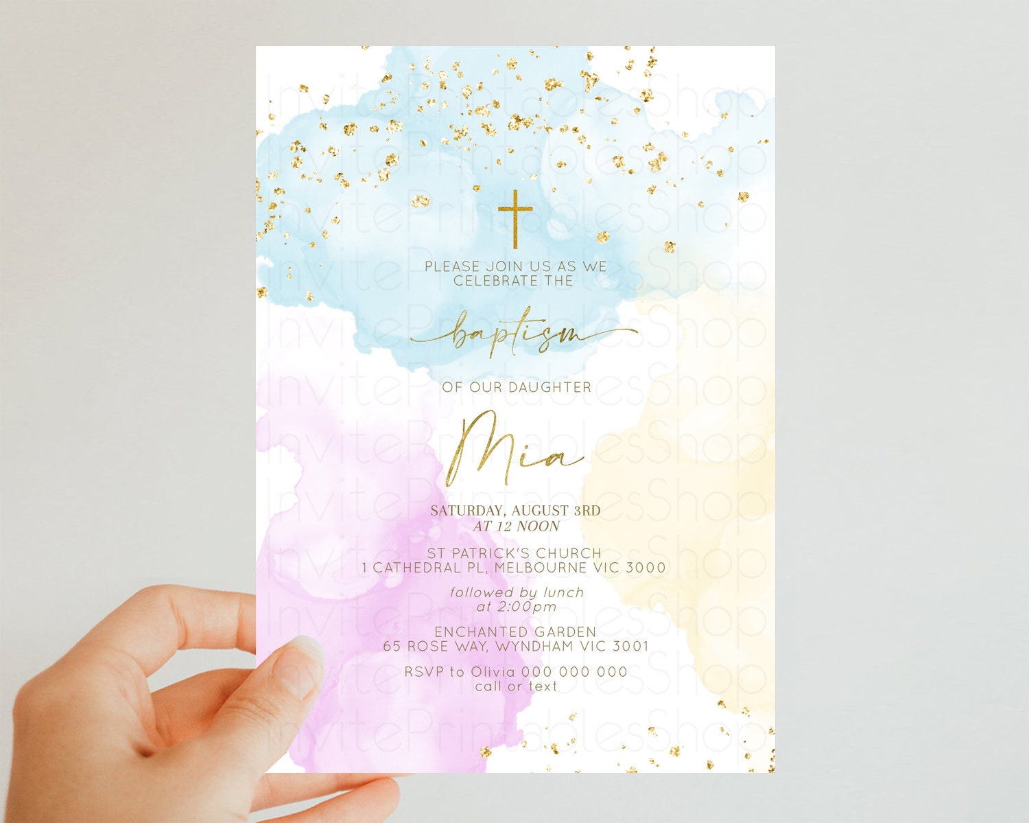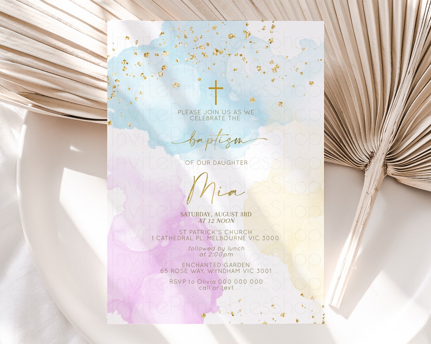 Rainbow Baptism invitation Pastel Rainbow Christening Invite Ombre Watercolor Invite Gold Glitter Sprinkle Splash Cross Religious 190V2
