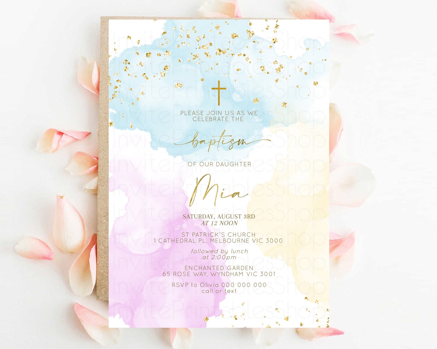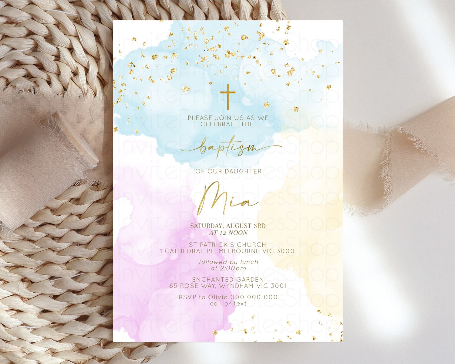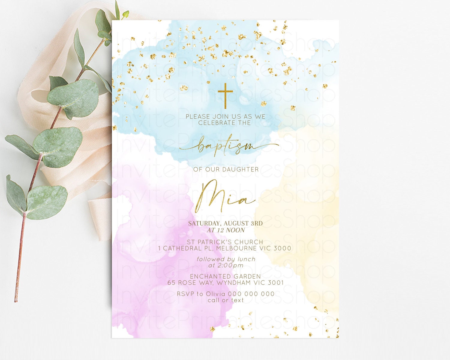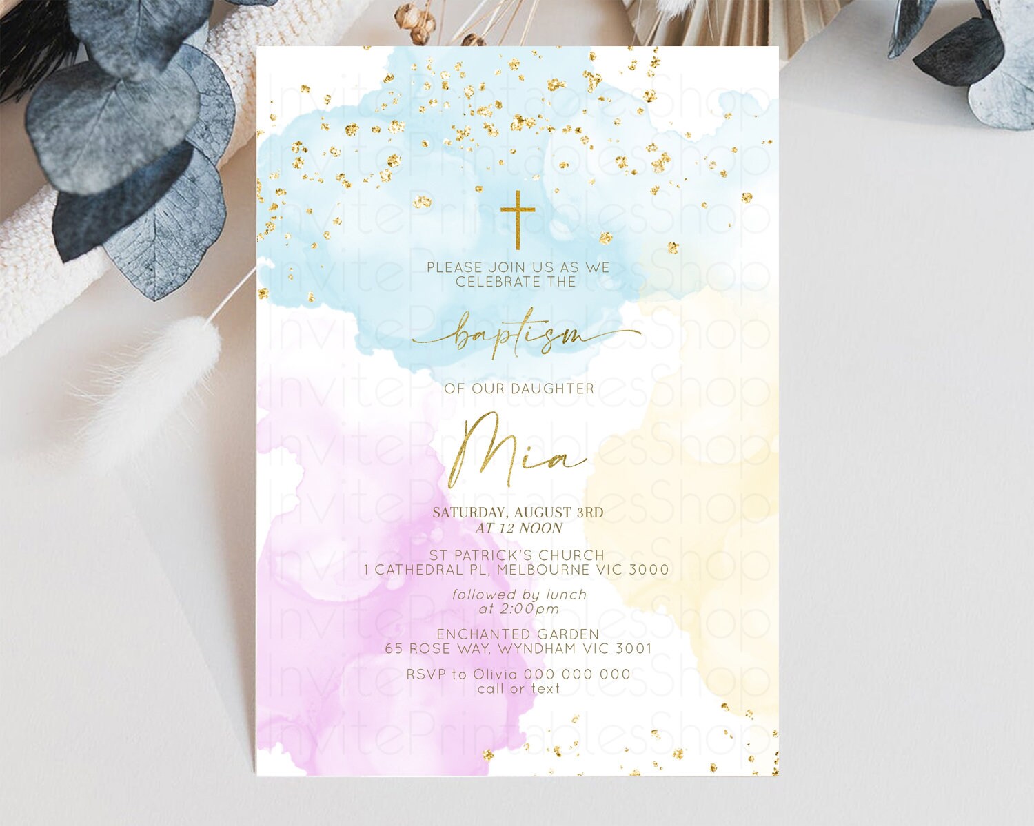 Rainbow Baptism invitation Pastel Rainbow Christening Invite Ombre Watercolor Invite Gold Glitter Sprinkle Splash Cross Religious 190V2