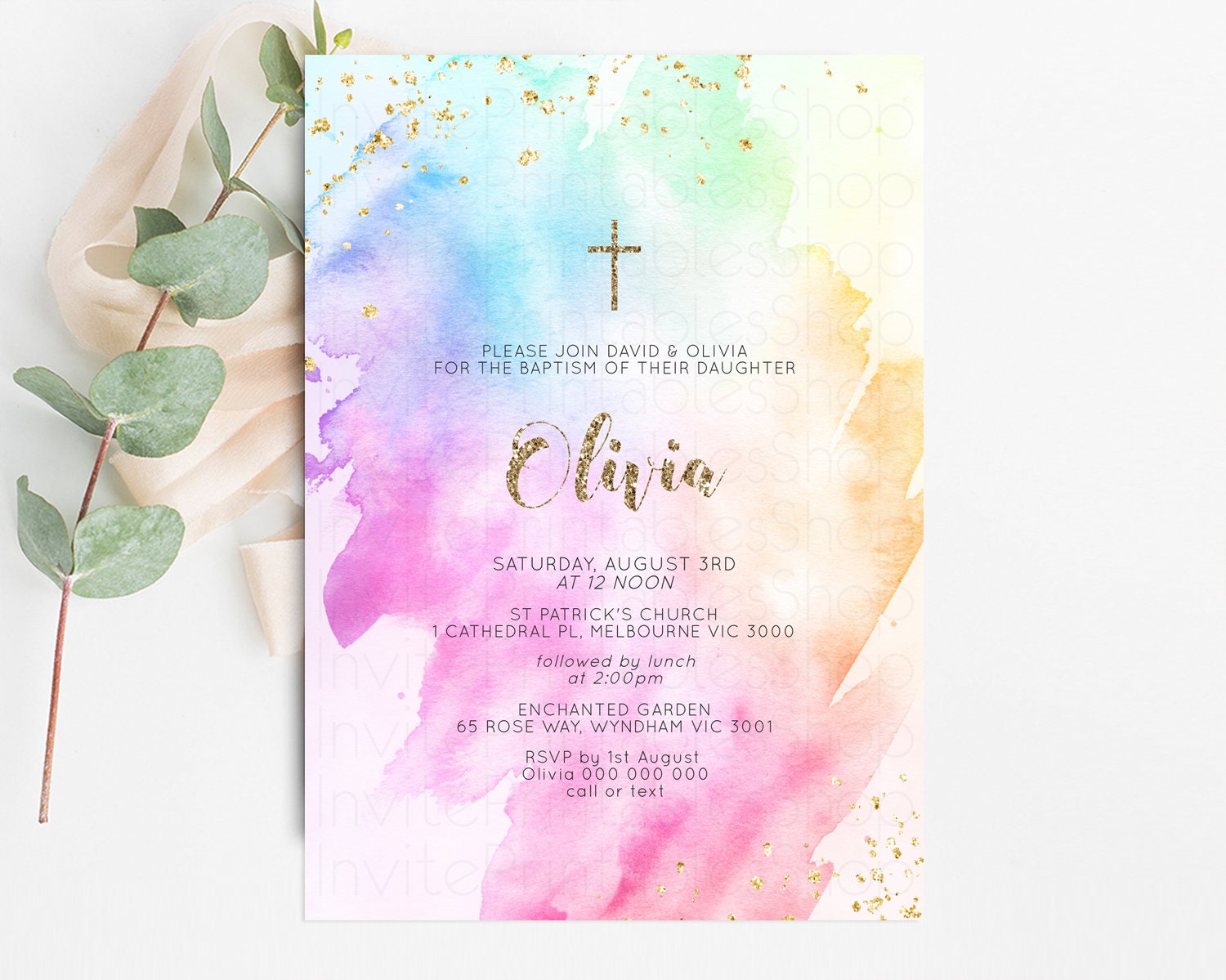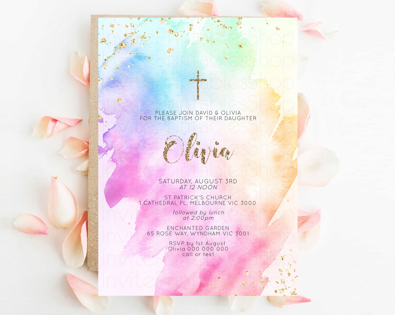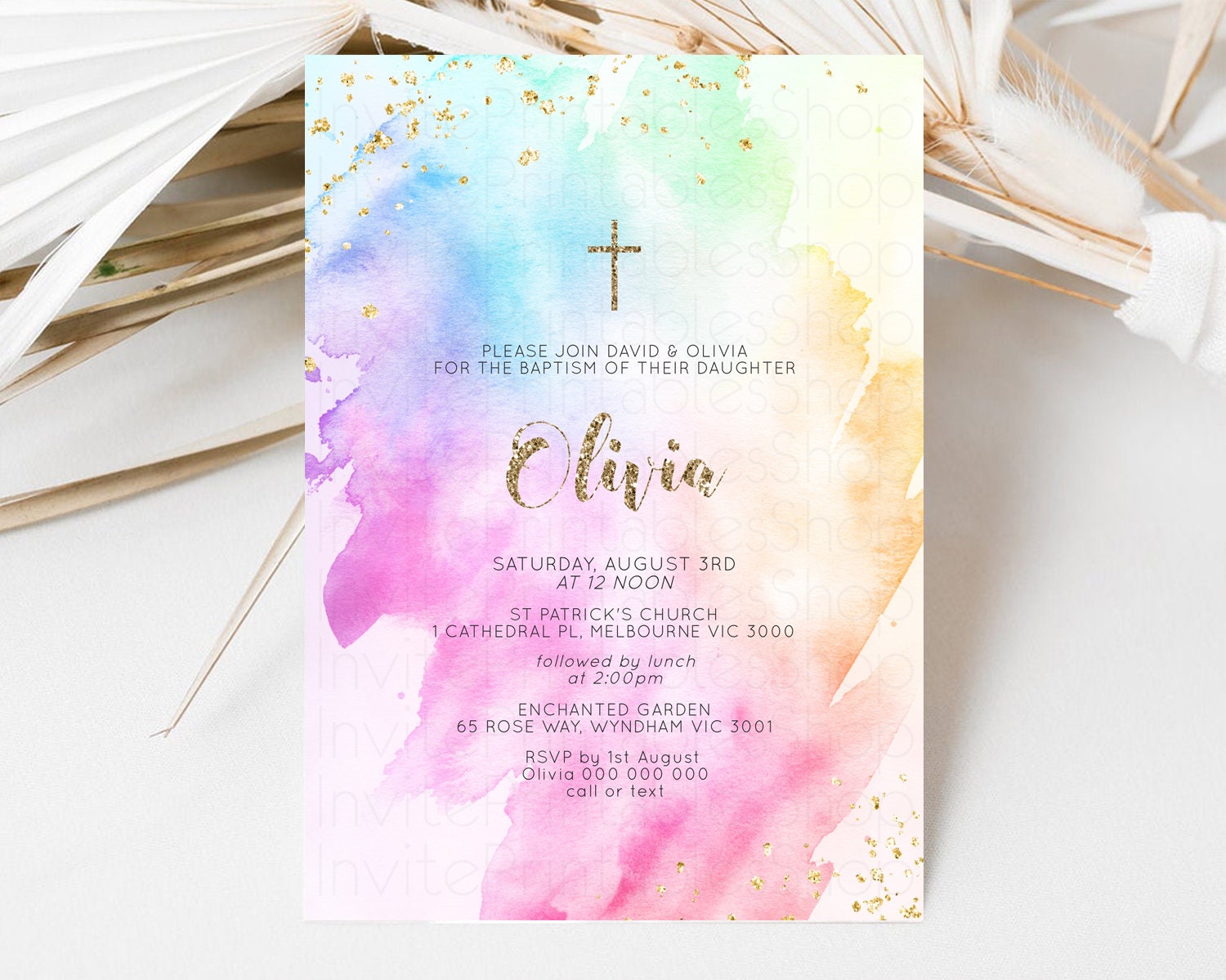 Rainbow Baptism invitation Pastel Rainbow Christening Invite Ombre Watercolor Invite Gold Glitter Sprinkle Splash Cross Religious g504