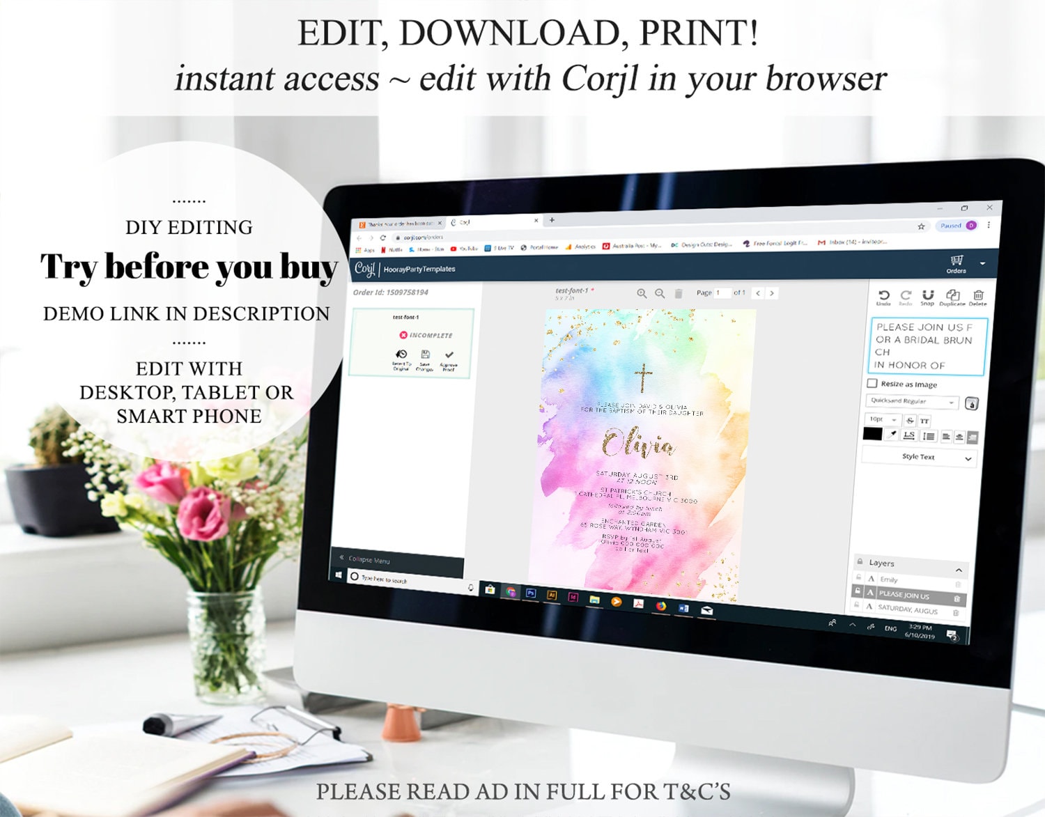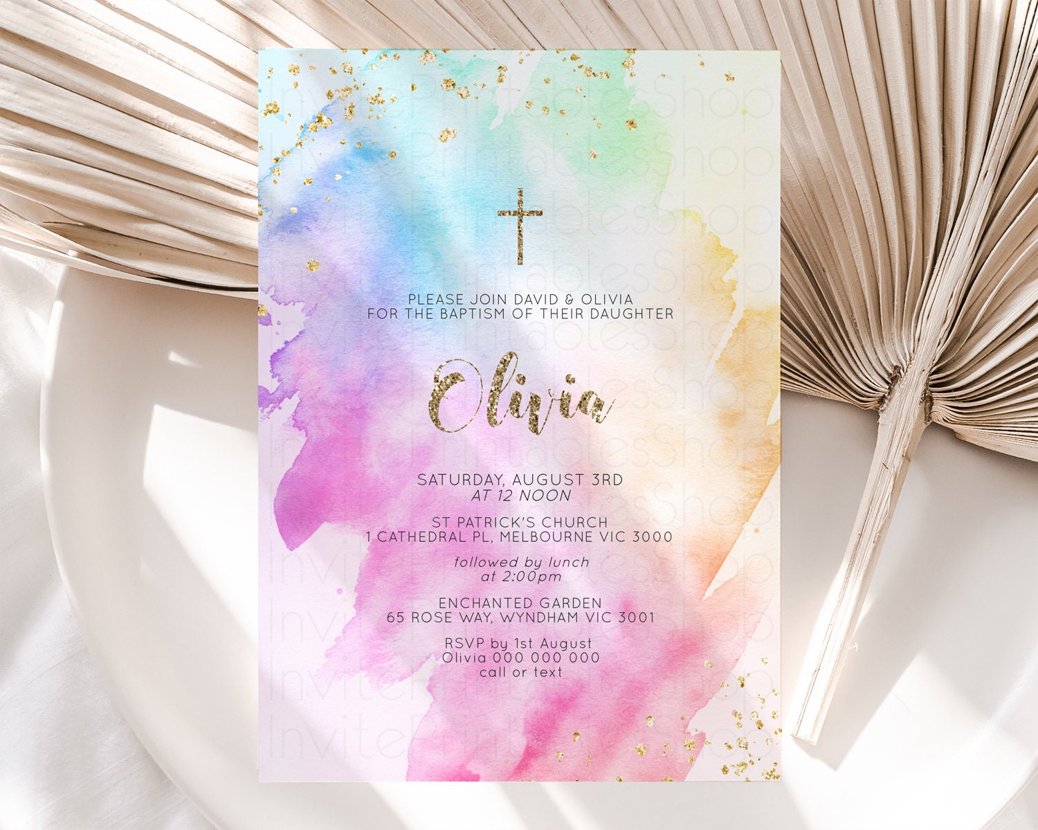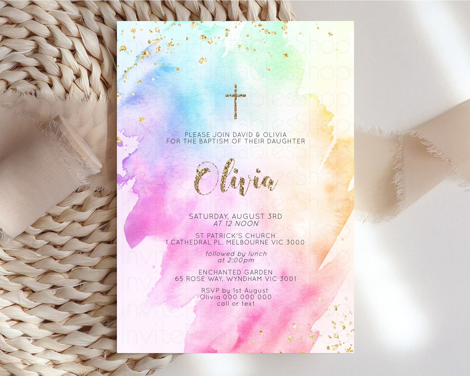Rainbow Baptism invitation Pastel Rainbow Christening Invite Ombre Watercolor Invite Gold Glitter Sprinkle Splash Cross Religious g504