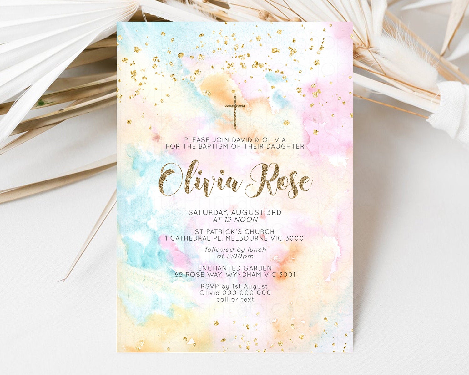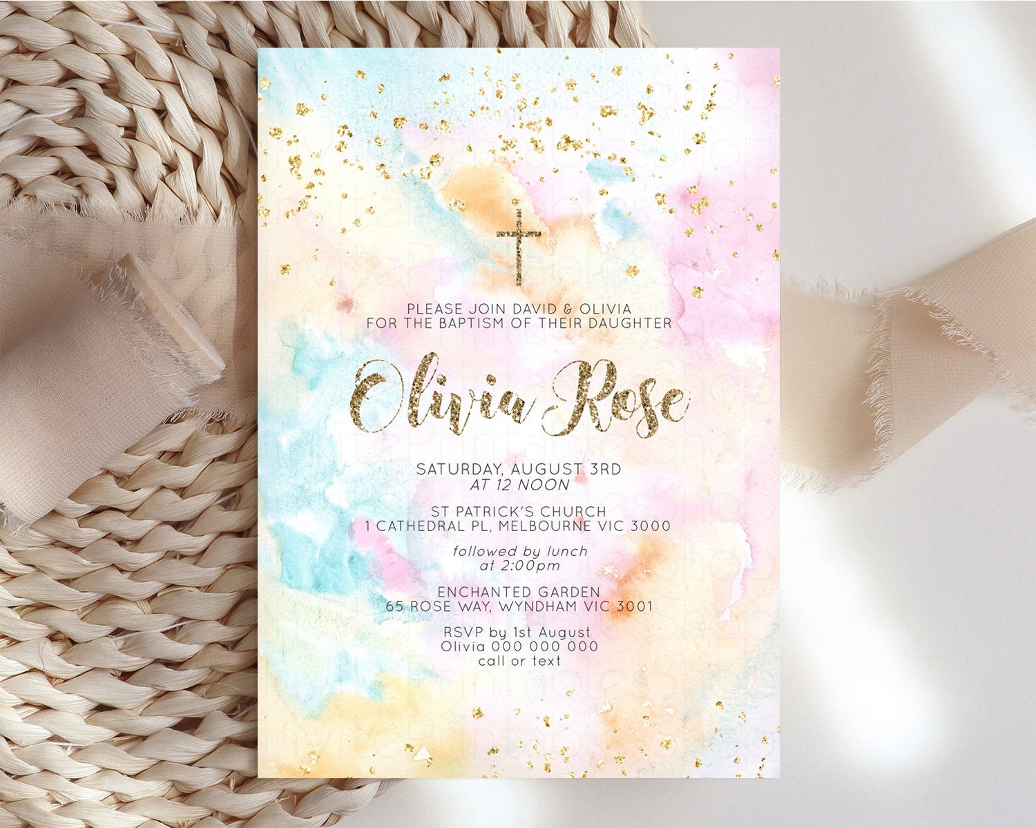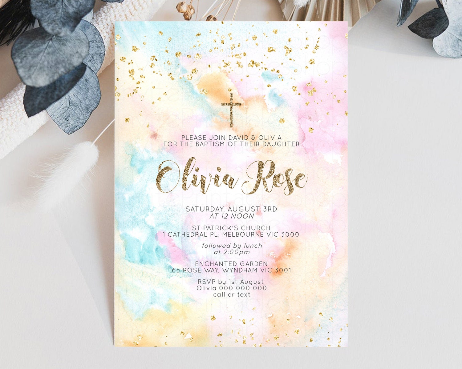 Rainbow Baptism invitation Pastel Rainbow Christening Invite Ombre Watercolor Invite Gold Glitter Sprinkle Splash Gold Cross Invite G566