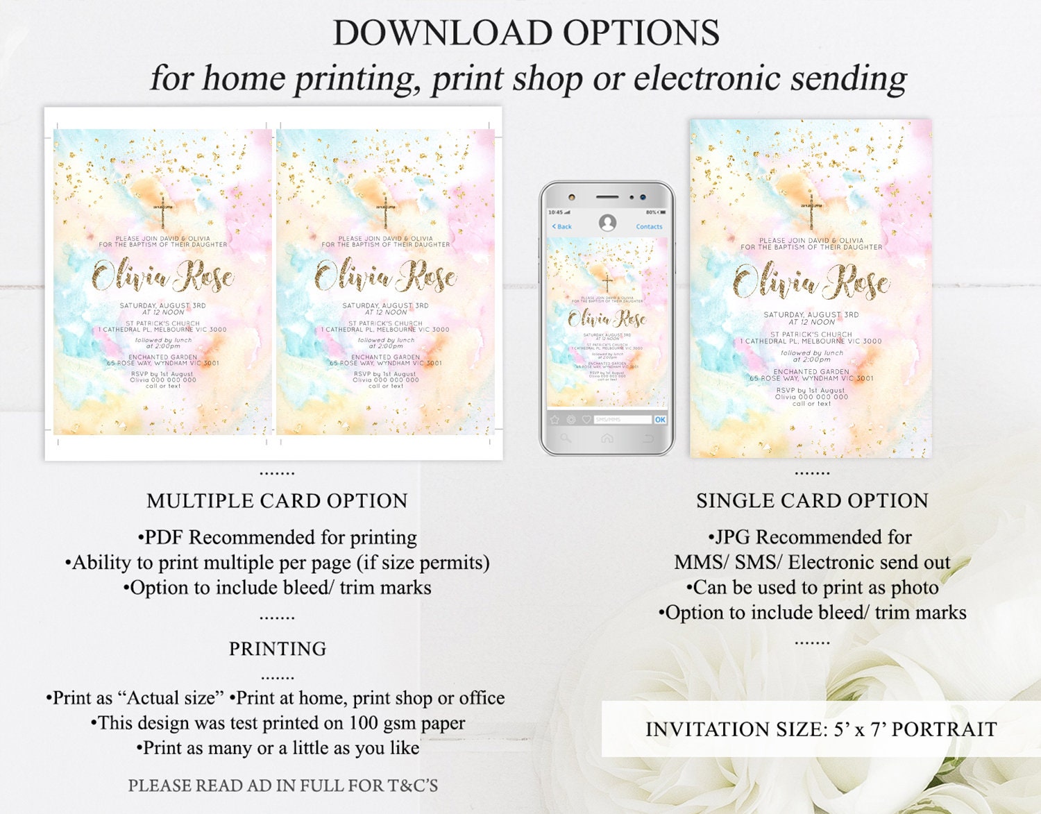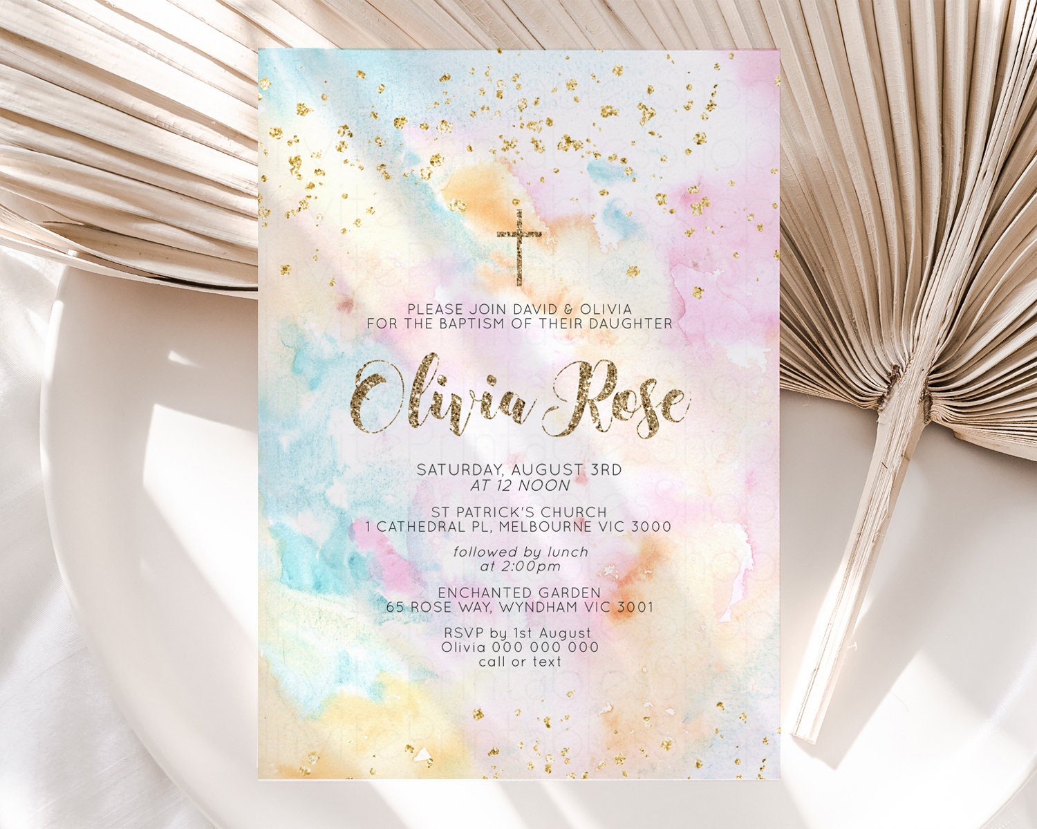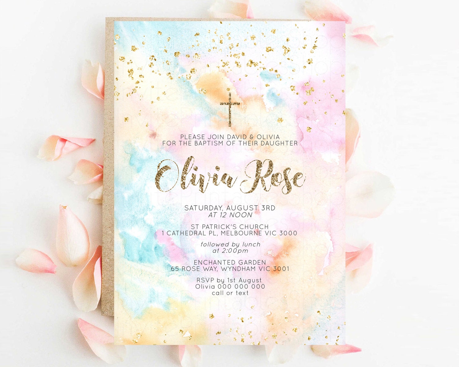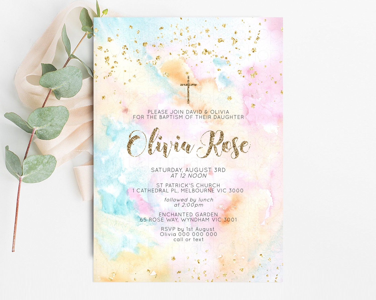 Rainbow Baptism invitation Pastel Rainbow Christening Invite Ombre Watercolor Invite Gold Glitter Sprinkle Splash Gold Cross Invite G566
