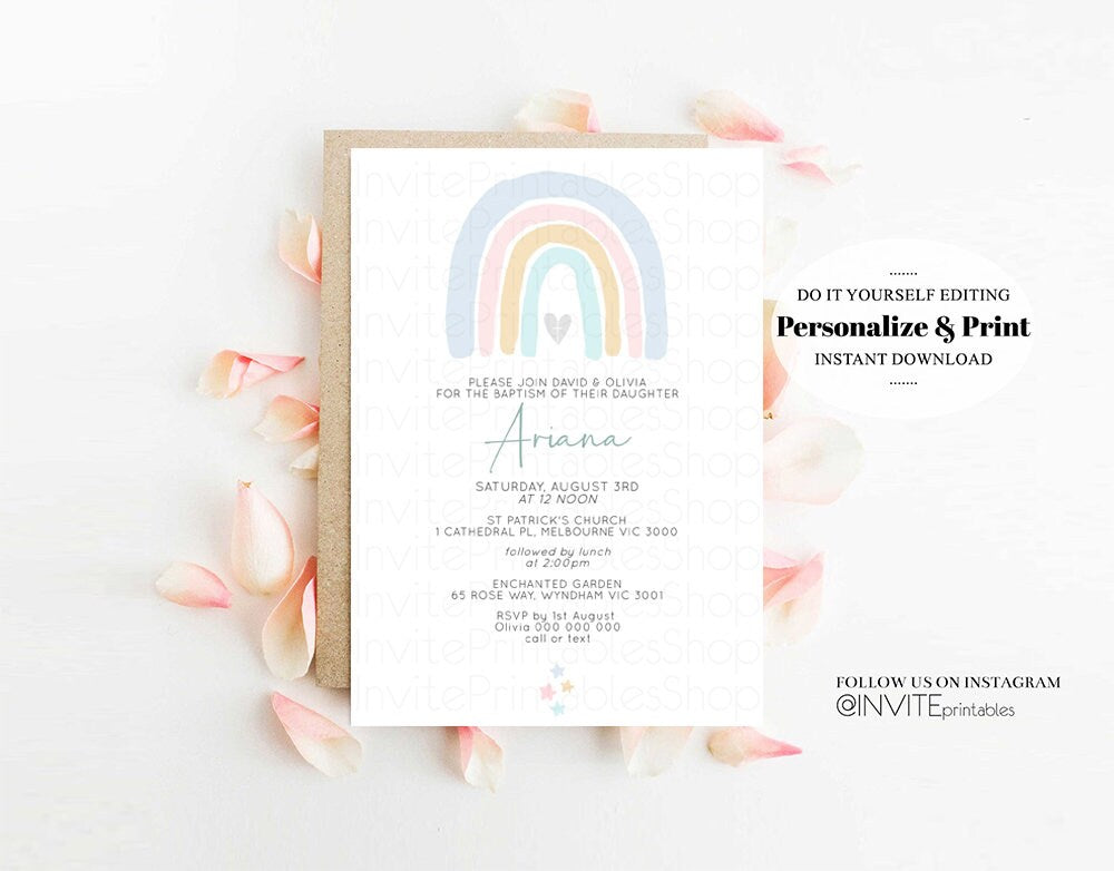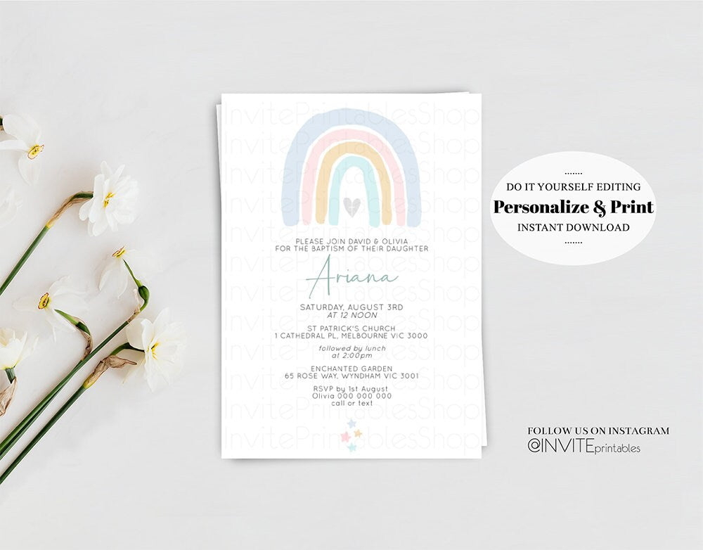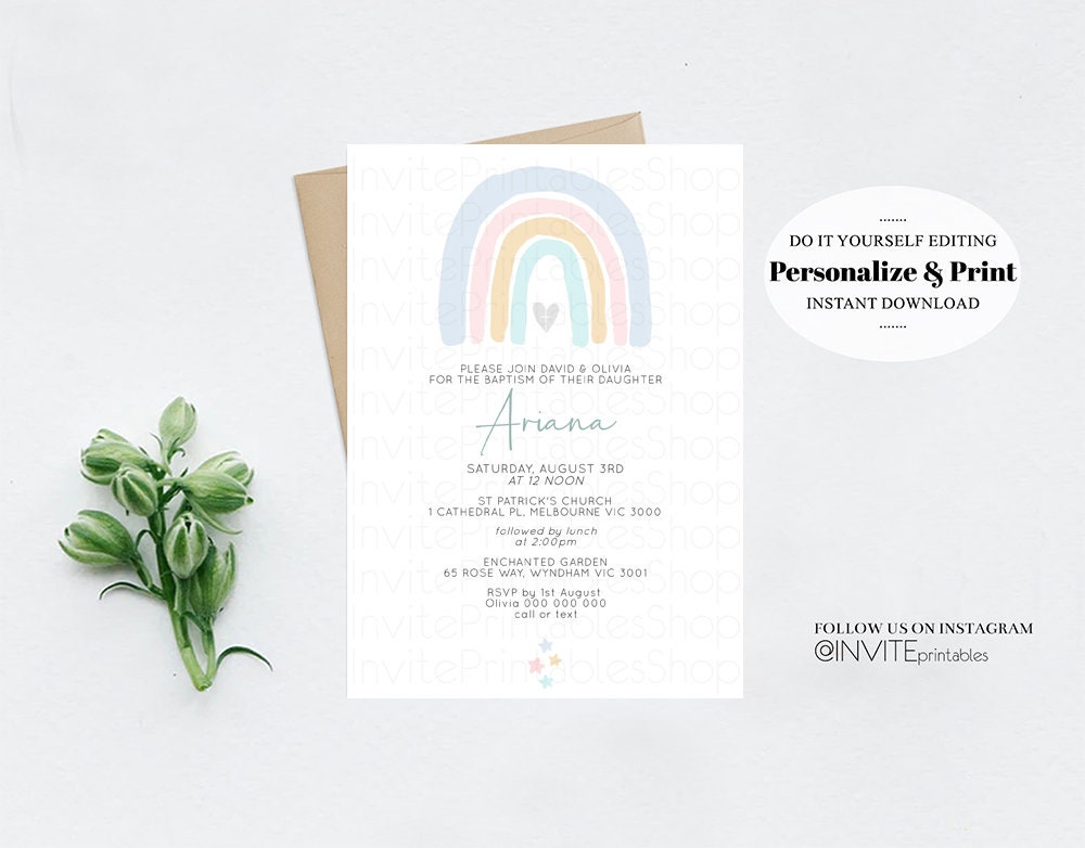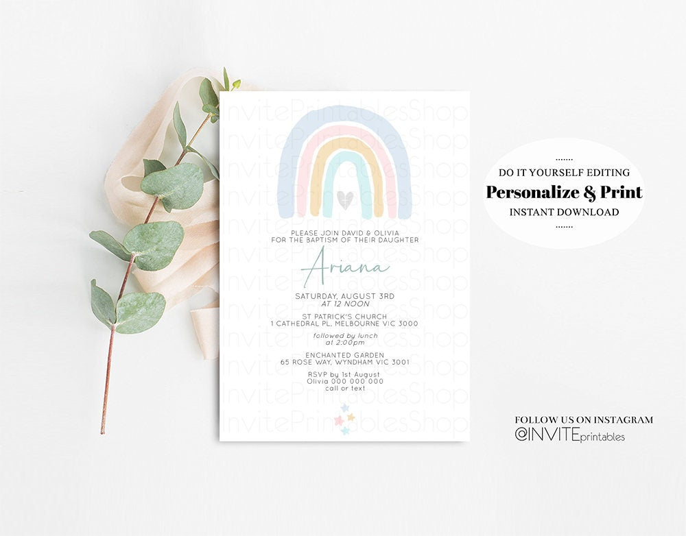 Rainbow Baptism Invitation Pastel Watercolor Christening Invitation Stars Colorful Splash Gold Foil Pastel Color Communion Orthodox Cross