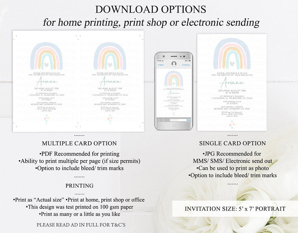 •Try before you buy! • DEMO LINK- https://www.corjl.com/d/22LCKM PLEASE READ AD IN FULL!! •Digital file. No physical item will be shipped •Do it yourself Editing. Edit online with Corjl or Edit with your mobile ITEM DETAILS Invitation size: 5’x7’ File type: PDF, JPEG Resolution: 300DPI PDF FILE OPTIONS: •Recommended for printing •Ability to print multiple per page (if size permits) •Option to include bleed/ trim marks JPG FILE OPTIONS: •Recommended for MMS/ SMS/ Electronic send out •Can be used to print as photo •Option to include bleed/ trim marks EDITING • Do it yourself editing • Mobile editing is available • Google chrome is the recommend browser for Corjl. Please download here for FREE: https://www.google.com/chrome/ • Using other browsers may not show all of Corjl's editing features • Editing on a desktop/ laptop computer is recommended to access all of Corjl features • Mobile editing is available, please use a desktop/ laptop computer to access all of Corjl features DOWNLOADS & EXPIRY •Maximum 3 downloads on the same edit •Link expires 30 days after purchase DOWNLOAD NOTICE •Once you have reached your download limits &/ “approve proof” in Corjl. You will not be able to request further downloads on your design. Further download requests are not permitted WHAT IS EDITABLE •Text - colours, fonts, size, move, delete & rotation. •Please see demo link for what you can and can’t do WHAT YOU CAN’T EDIT •Template size •Template orientation •Graphics CAN NOT BE deleted, moved, or changed in colour •Please see demo link for what you can and can’t do HOW TO 1. Choose design template & checkout on Etsy. 2. Email will be sent from Corjl. Follow link to access template 3. Edit, save & print INSTRUCTIONS •Instructions on how to edit your design have been written by Corjl and will be available with your purchase. PRINTING •Colours can vary depending on the monitor, printer & cardstock •Can be printed at home •Home printing will require you to select the high quality print settings, select appropriate paper thickness & click "Actual size" prior to you printing •This design was test printed on 100 gsm paper •Can be printed at local print shop. Please check printing requirements & any printing restrictions prior to purchase PERSONAL USE ONLY. This item cannot be shared, re-sold, or used commercially for profit. REFUND POLICY •We are unable to provide a refund/ exchange on commenced & completed work, instant downloads or self-editing link templates. Please use the demo link to work out if this product is right for you. Copyright © 2018 by InvitePrintablesShop PTY LTD All rights reserved. This file or any portion thereof may not be reproduced or resold without the express written permission of the publisher (including edits to the design). Our files are provided as high-resolution PDFs – the end result is dependent upon the printer and paper used. If using a professional printing company, InvitePrintablesShop are not responsible for their specific printing requirements, paper or colour quality. Any changes required to the template are not included with your purchase – the files come as described in the listing only and cannot be changed. Thank you for visiting Invite Printables Shop:)