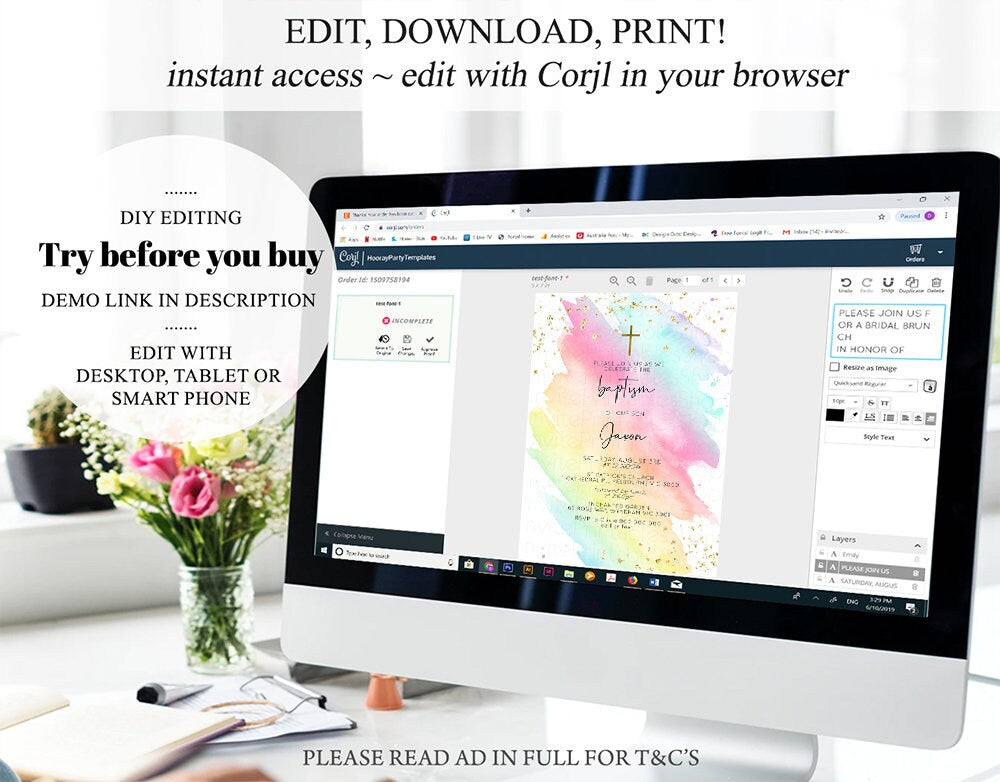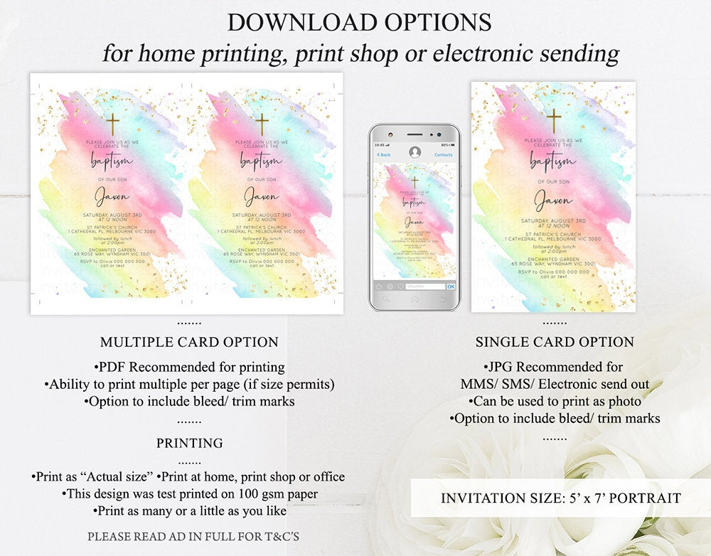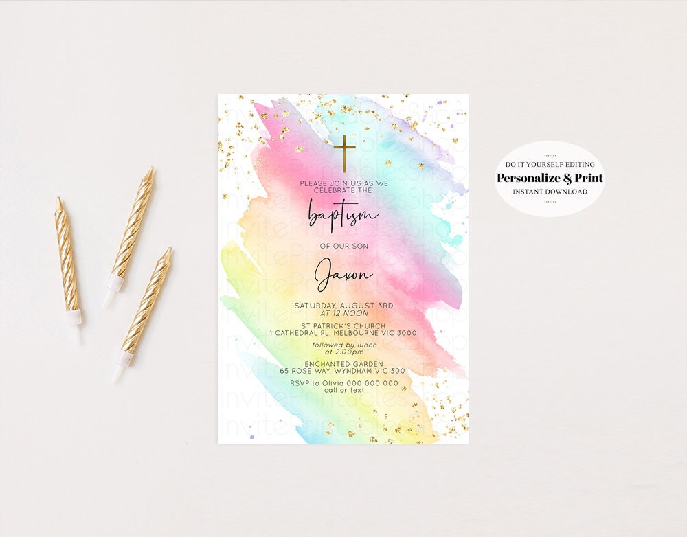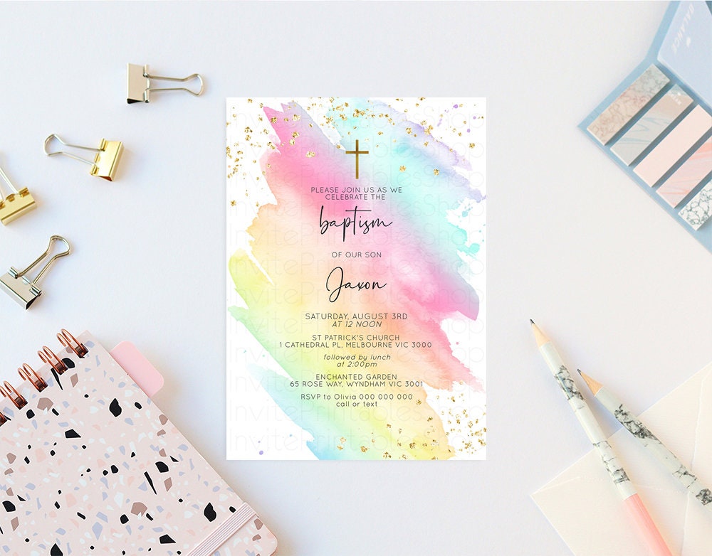 Rainbow Baptism Invite Pastel Invite Rainbow Pastel Invite Rainbow Christening Invite Glitter Gold Cross Invite Watercolor invite T518