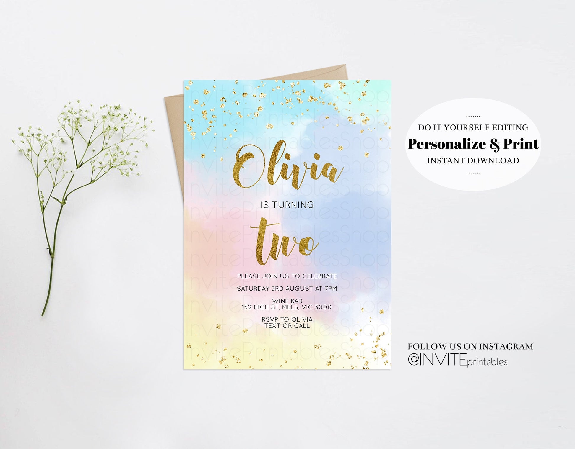 Rainbow Birthday Invitation Colorful Invite Watercolor Gold Glitter Sprinkles Ombre Pastel Invitation 1st 2nd 3rd 4th 5th 6th Party Invite